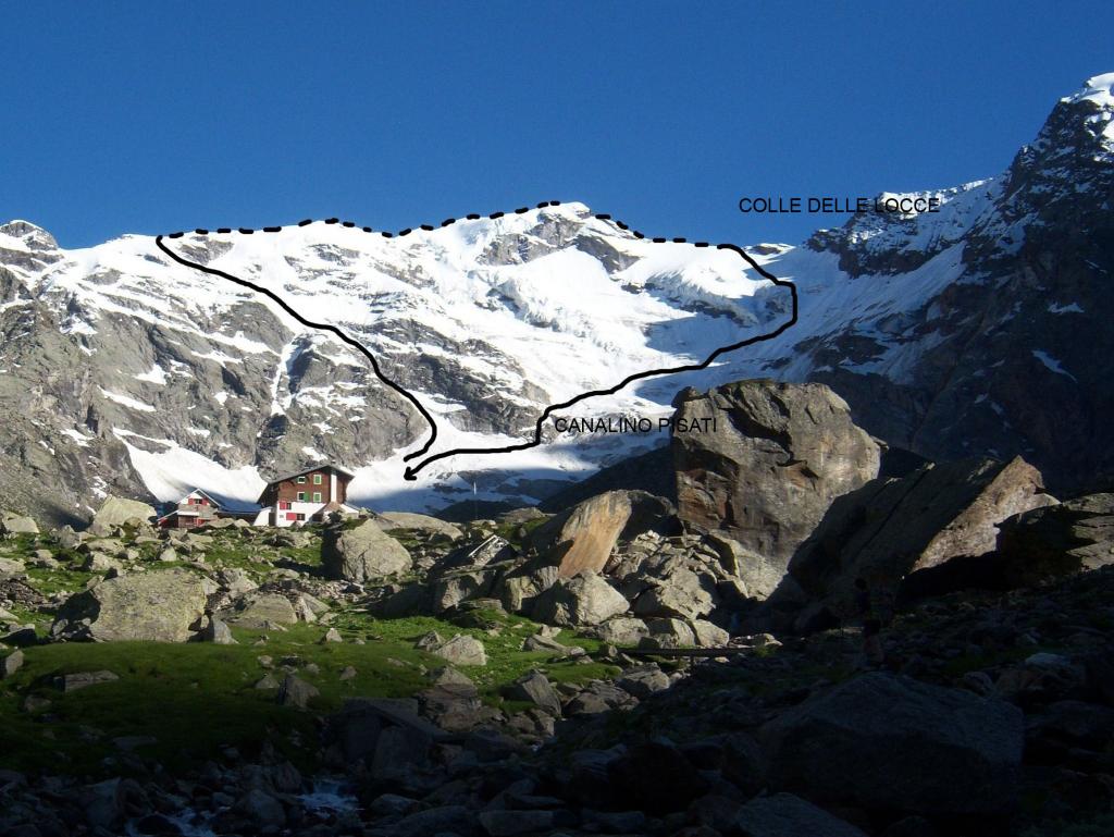 Dal rifugio inoltrarsi nella valle mantenendosi quanto più possibile nel fondovalle, soprattutto in presenza di neve, puntando verso il margine destro orografico del ghiacciaio delle Locce. Prima di giungere allo sperone roccioso che delimita il ghiacciaio (canalino Pisati) risalire a sinistra un cono valanghivo che porta ad un ampio nevaio.
