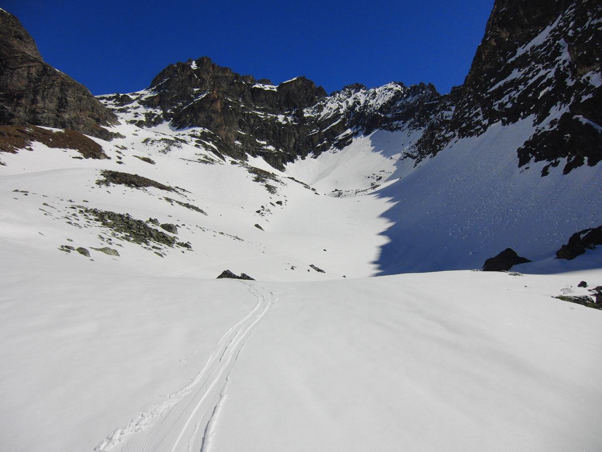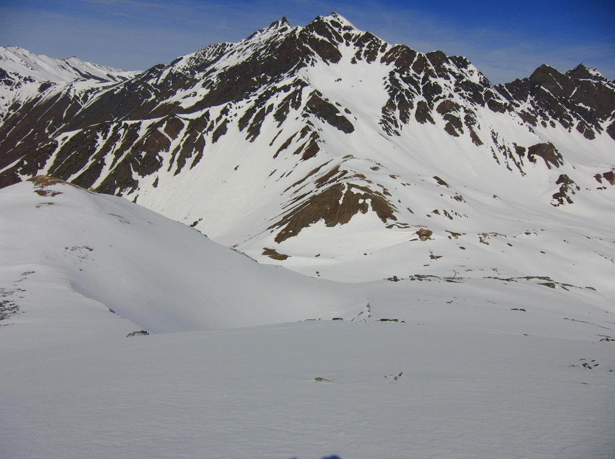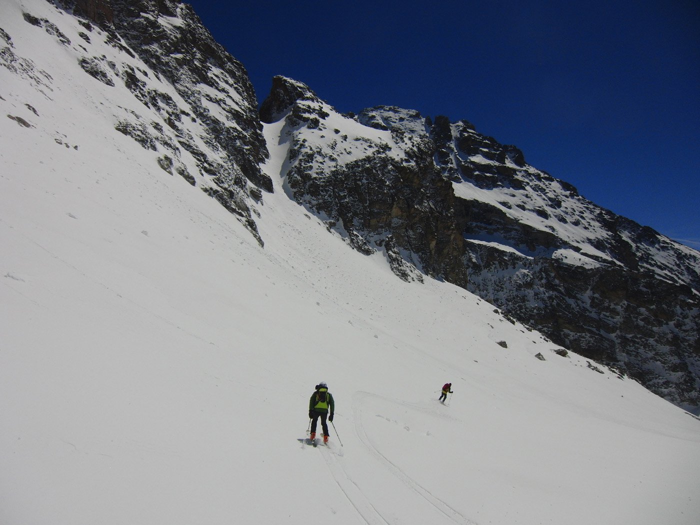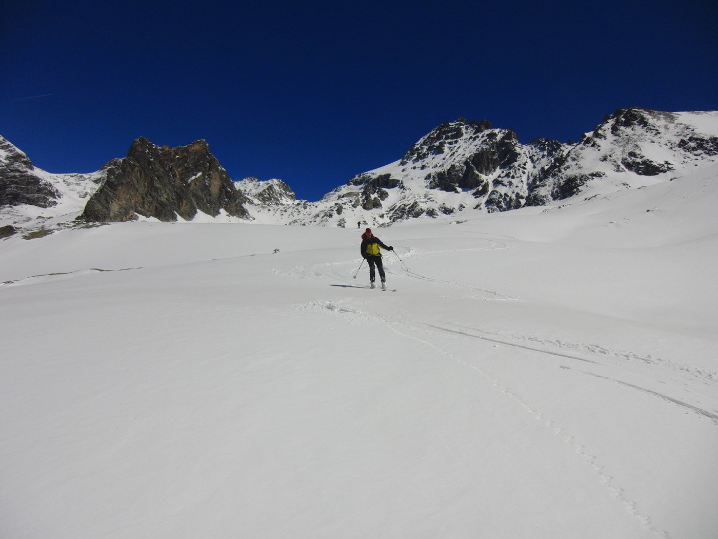 Discesa. Siccome l’itinerario di salita al Col d’Etiache, data l’esposizione a mezzogiorno, conserva poco la neve al di sotto della quota 2400 m, è molto più remunerativo effettuare la traversata scendendo dal Colletto dei Rochers Cornus che presenta un breve tratto un po’ sostenuto (o se in buone condizioni, direttamente il pendio dalla cima a quota 3041 – OS) nel vallone omonimo fino ad imboccare la gola con conoide sottostante che sbuca di fronte al Rifugio Scarfiotti.