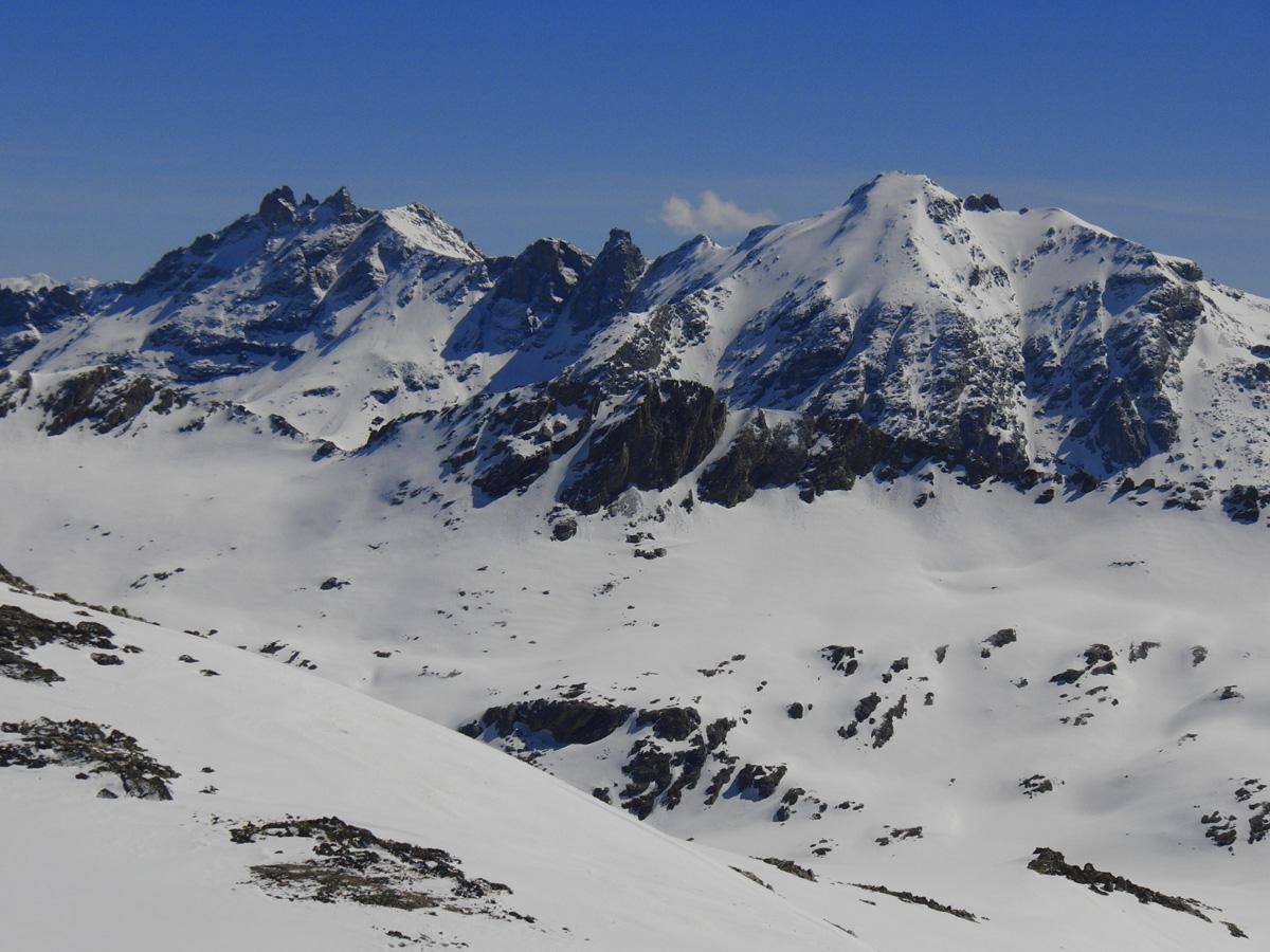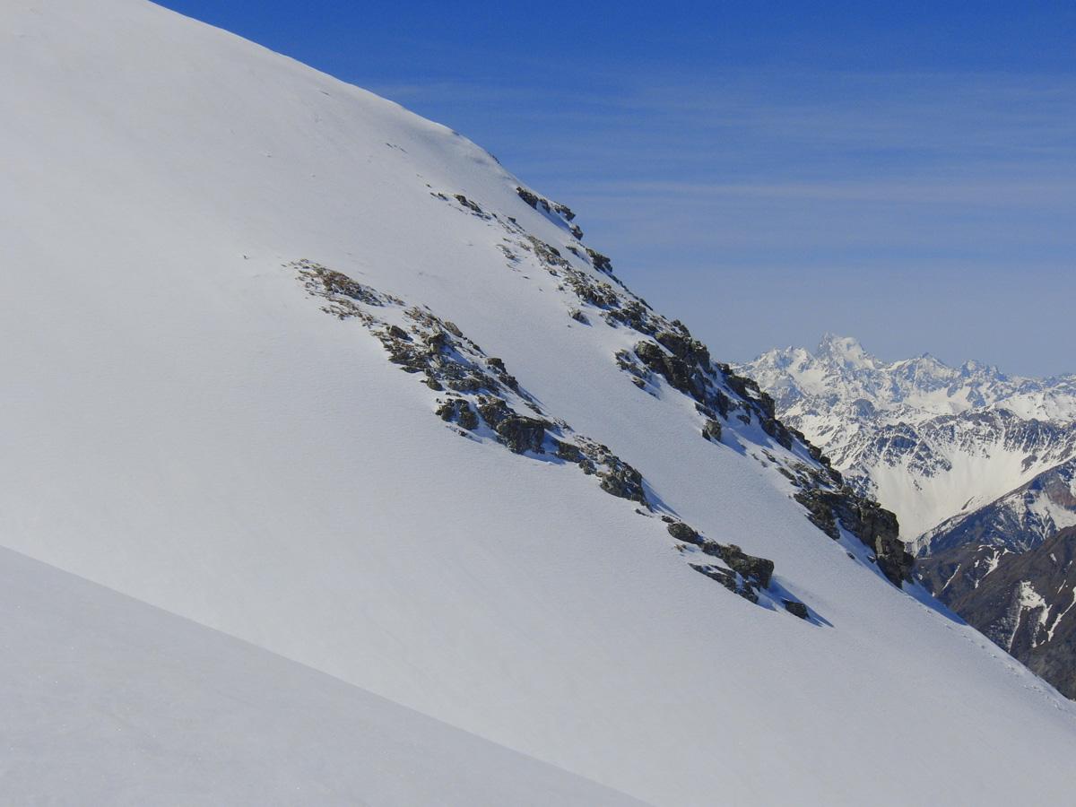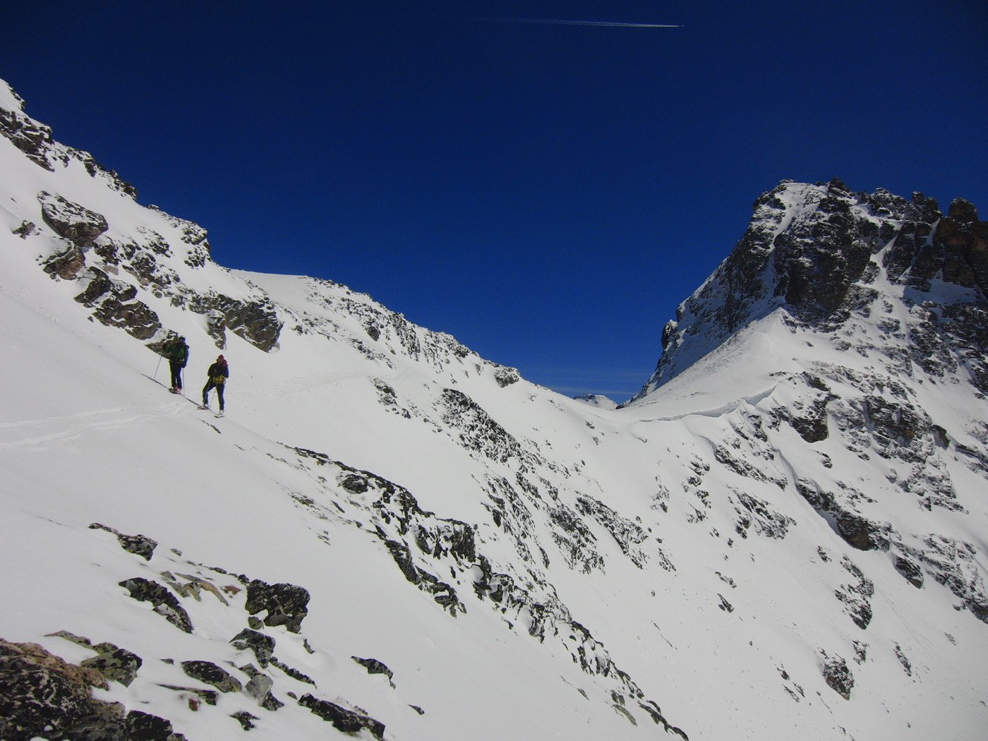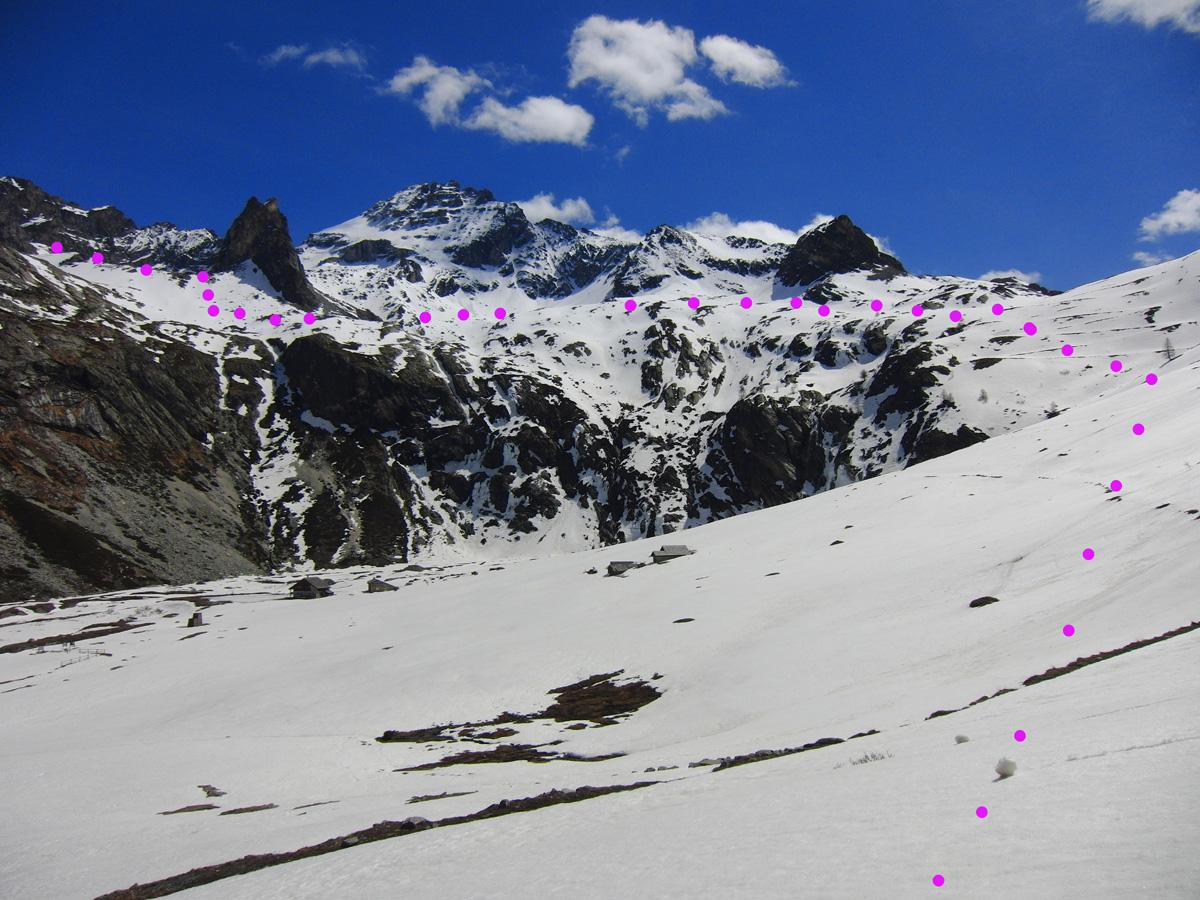 Discesa. Siccome l’itinerario di salita al Col d’Etiache, data l’esposizione a mezzogiorno, conserva poco la neve al di sotto della quota 2400 m, è molto più remunerativo effettuare la traversata scendendo dal Colletto dei Rochers Cornus che presenta un breve tratto un po’ sostenuto (o se in buone condizioni, direttamente il pendio dalla cima a quota 3041 – OS) nel vallone omonimo fino ad imboccare la gola con conoide sottostante che sbuca di fronte al Rifugio Scarfiotti.