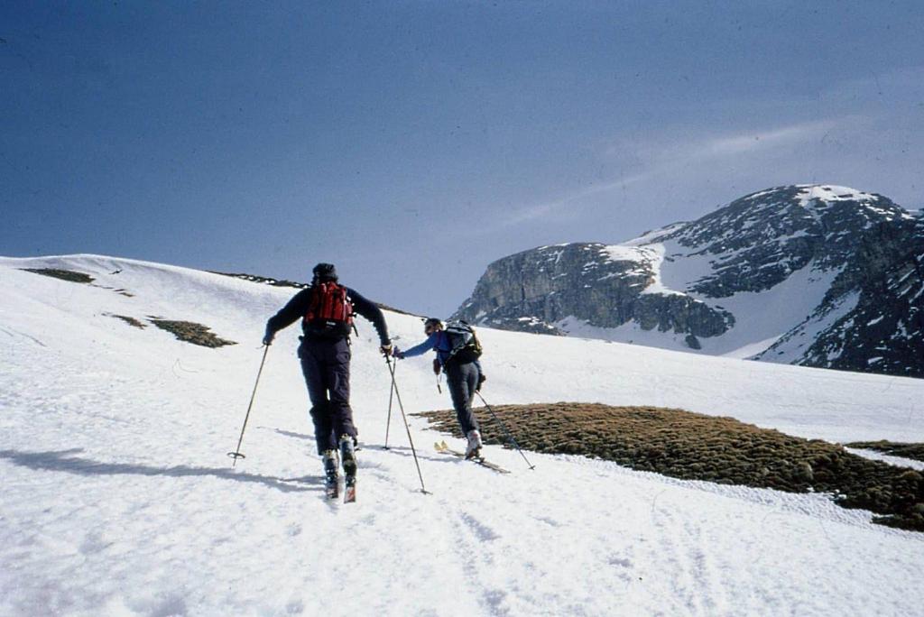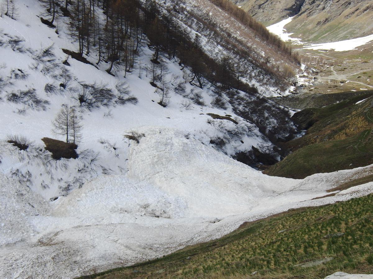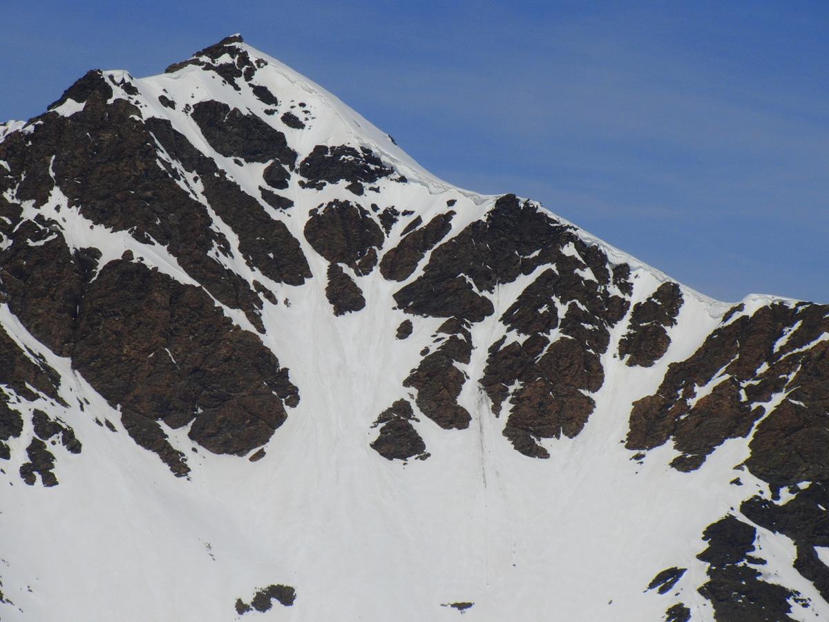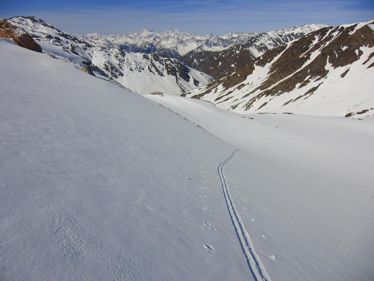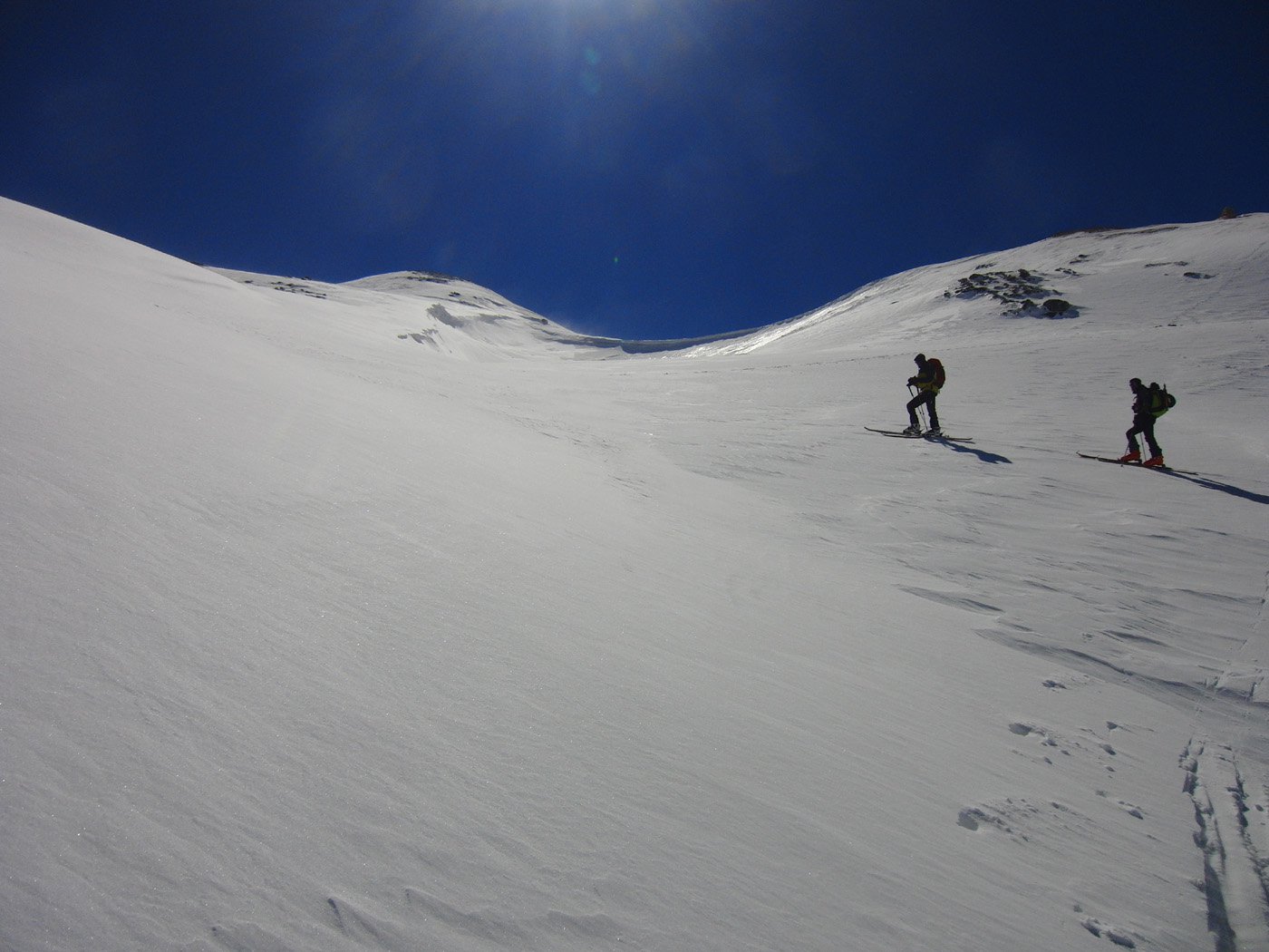 Discesa. Siccome l’itinerario di salita al Col d’Etiache, data l’esposizione a mezzogiorno, conserva poco la neve al di sotto della quota 2400 m, è molto più remunerativo effettuare la traversata scendendo dal Colletto dei Rochers Cornus che presenta un breve tratto un po’ sostenuto (o se in buone condizioni, direttamente il pendio dalla cima a quota 3041 – OS) nel vallone omonimo fino ad imboccare la gola con conoide sottostante che sbuca di fronte al Rifugio Scarfiotti.