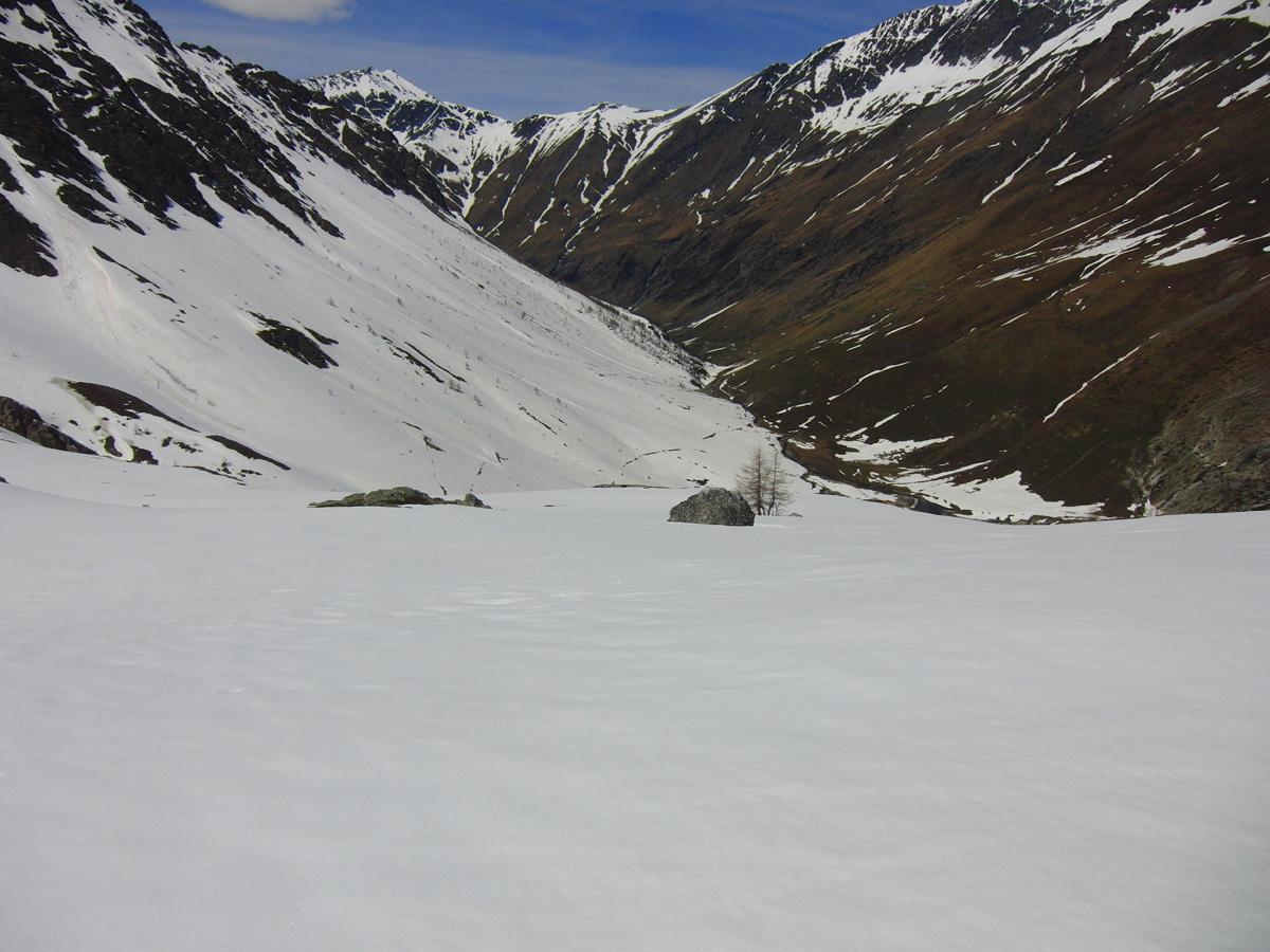 Qualora la conoide di fronte allo Scarfiotti fosse già priva di neve, conviene lambire la base del Bric del Mezzodì, attraversare il Vallone della Rognosa senza perdere quota e facilmente si giunge nella gola del Rio di Fond al di sotto del Pian dei Morti, in un punto un po’ più in basso della passerella, dove essendo stretta la gola si può attraversa facilmente senza dover scalettare; si prosegue poi sul classico itinerario e con giusto innevamento, tenendo la sx idr. si può giungere fino alla lapide del Picreaux (diversamente si segue la strada).