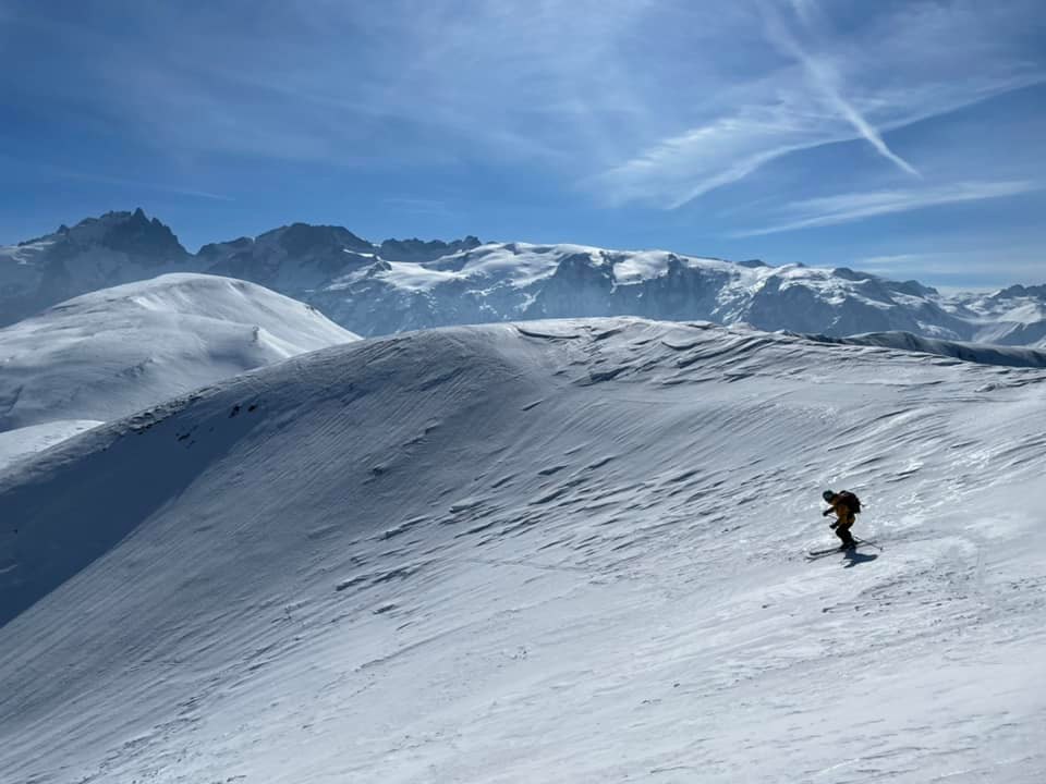 Dal ponte della sciovia Plateau, risalire la pista o meglio la dorsle più a Sud (sinistra) fino alla cresta dove esce lo skilift. Seguire quinti vs Nord-Ovest la spalla di Serre Bernard, dapprima in salita e poi dolce, poi in leggerissima discesa su vasto pianoro puntare alla cresta rocciosa con cornici, tenersi alla sua sinistra (Sud) e con ampi e piatti pendii raggiungere una sella sotto il cupolone sommitale, si giunge in cima con un ultimo giro vs sinistra. Discesa per la via di salita.