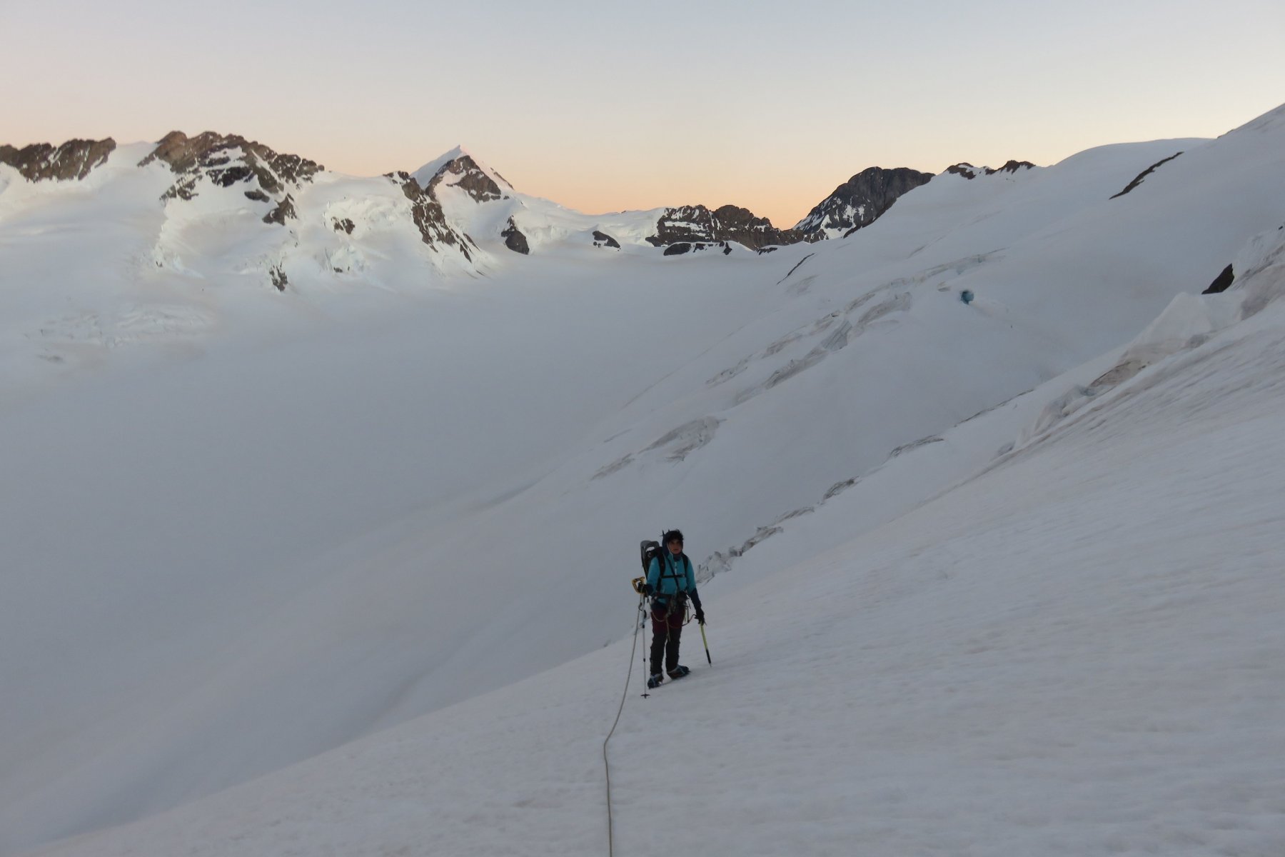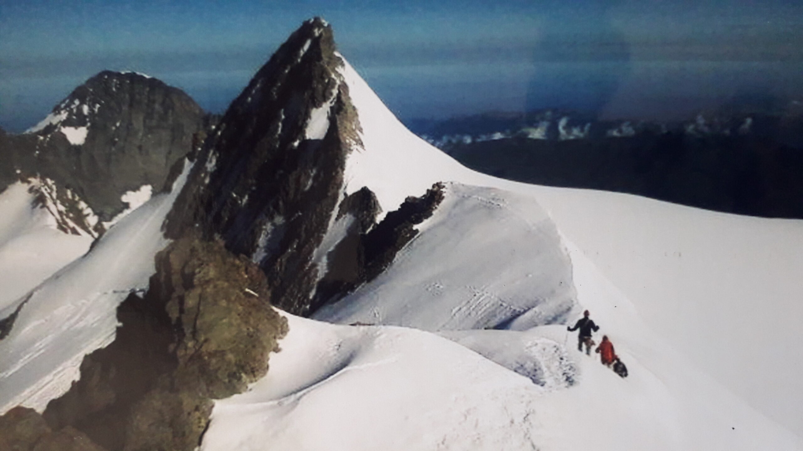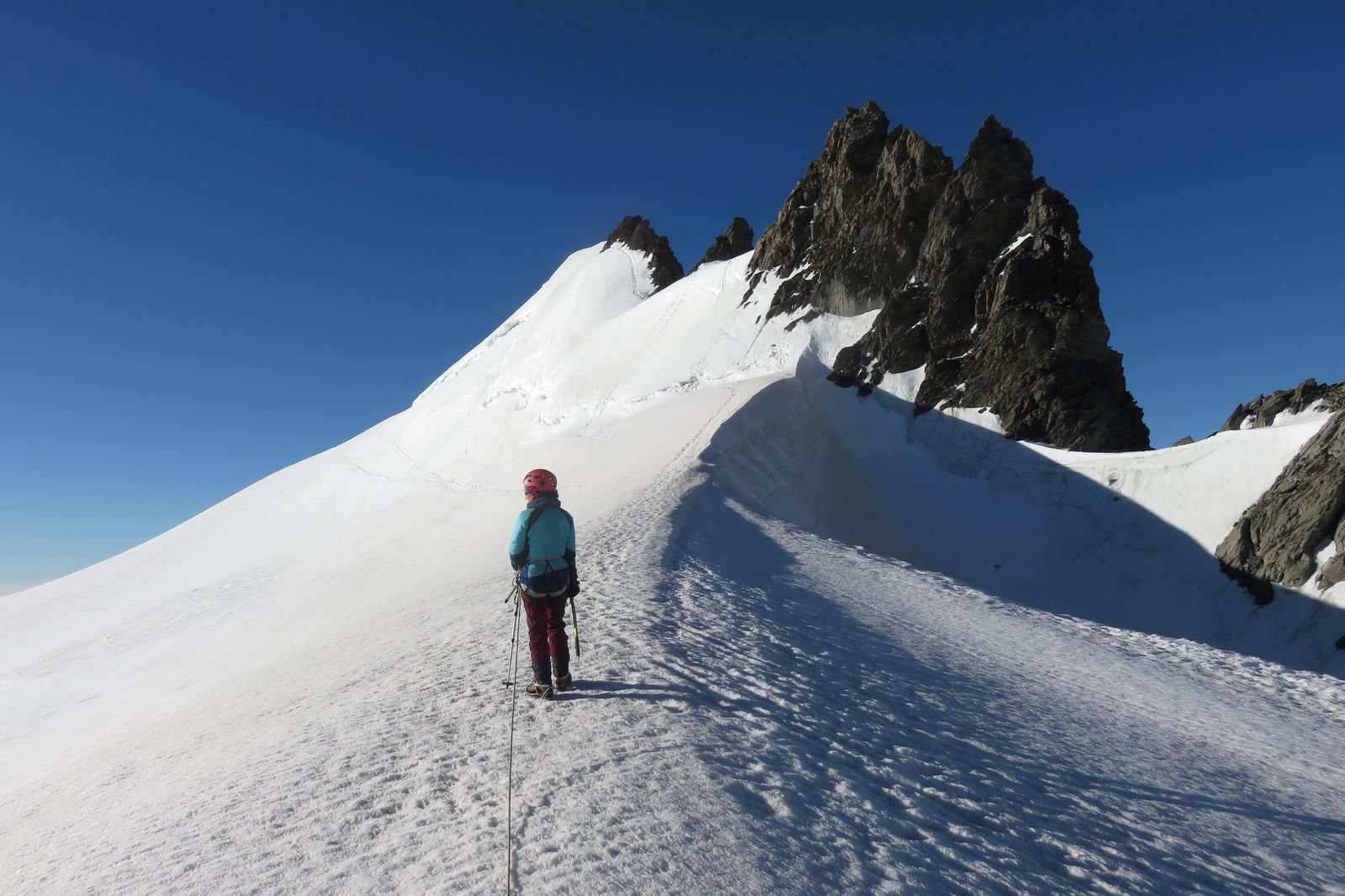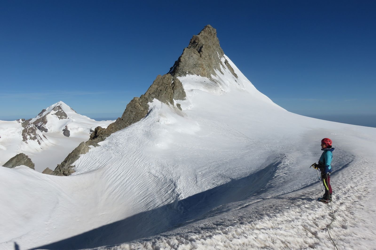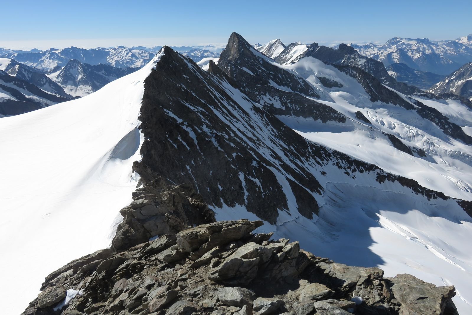 Per salire anche l’Hinterfiescherhorn conviene, una volta tornati alla Fieschersattel, portarsi sul ghiacciaio a sx, traversare per circa un centinaio di metri e attaccare la paretina che porta sulla cresta NO (attenzione ghiaccio vivo, cordone x doppia in discesa) quindi direttamente alla cima senza difficoltà. Oppure proseguire sul ghiacciaio fin sotto la verticale della vetta quindi raggiungere la cresta poco distante dalla cima con un breve traverso su ripido pendio nevoso.