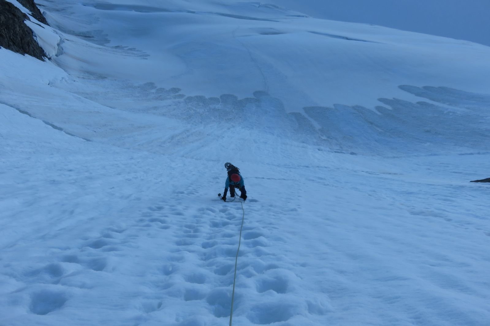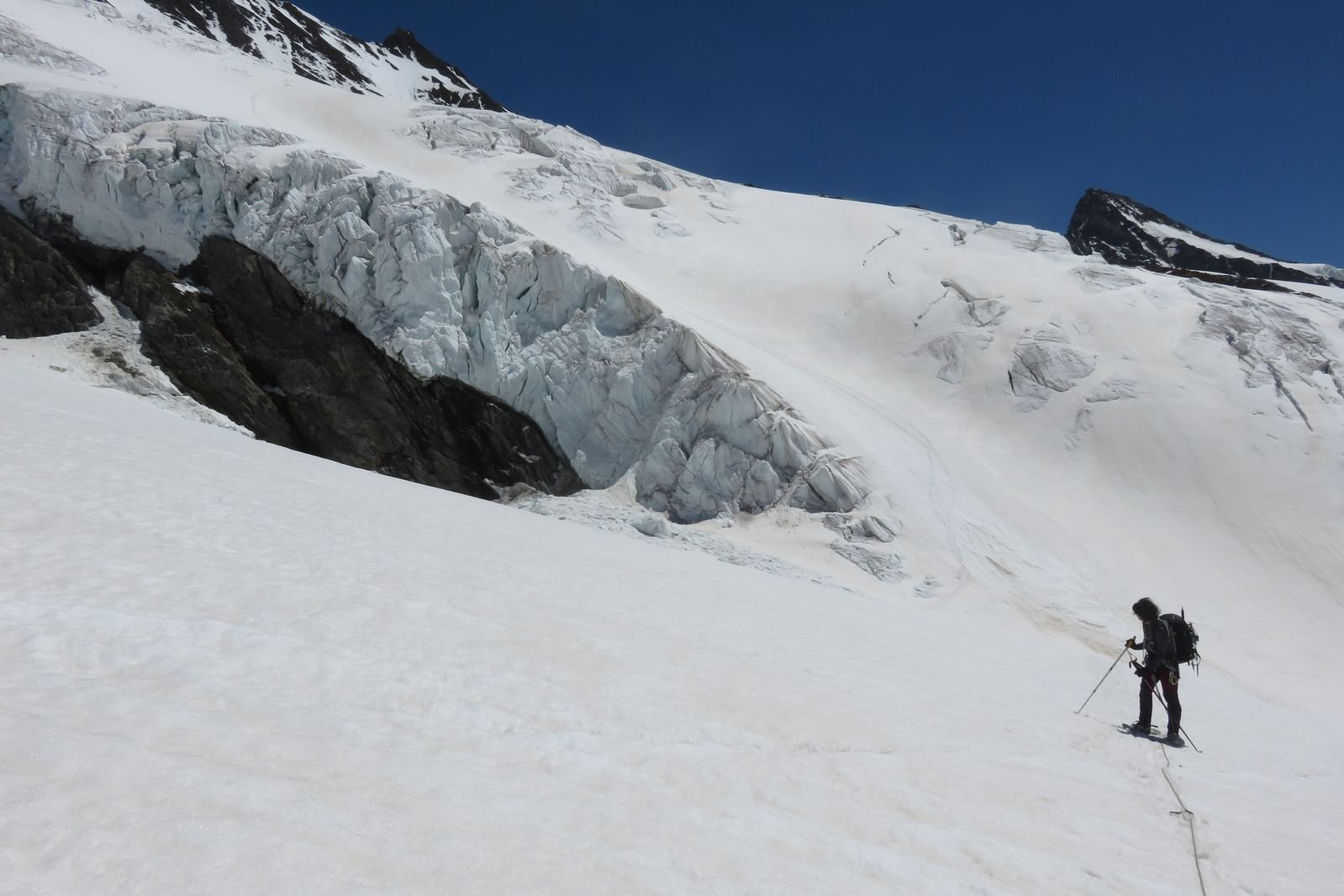 La salita del ghiacciaio che porta al passo richiede prudenza dato che è molto crepacciato. La parete che adduce al colle è ripida (200m 45/50°) e non così banale (prestare molta attenzione soprattutto in discesa quando la neve tende a cedere per il caldo). A stagione inoltrata può l’ultimo tratto presentarsi molto delicato perchè in ghiaccio e/o in ripidi sfasciumi (sosta a chiodi, cordoni e maillon per una calata dal passo e altri cordini poco sotto).