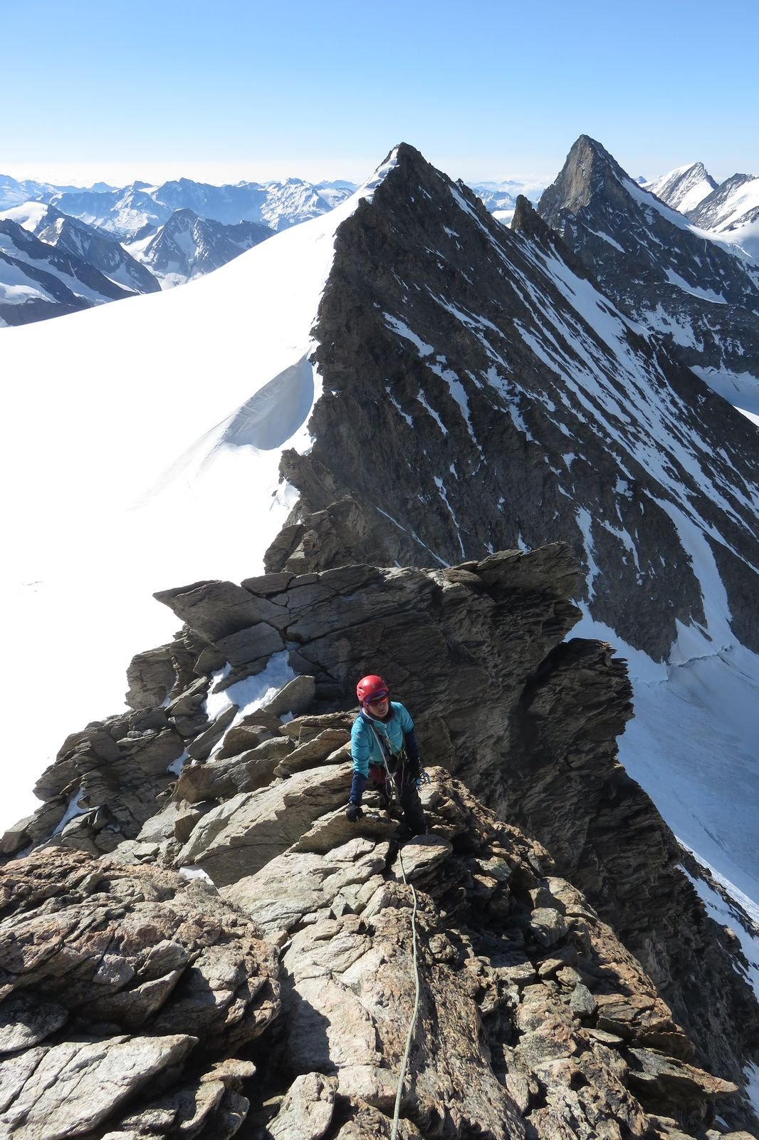 La cresta che adduce al Grossfiescherhorn non presenta passaggi impegnativi. Il primo grande torrione va evitato sulla dx per placche altrimenti costringe ad una breve calata in doppia per discenderlo (sosta in loco). L’ultima tratto affilato sotto la vetta può essere evitato sulla sx. Al ritorno dal colletto a monte del primo torrione è possibile calarsi sul versante NE sul ghiacciaio (calata da 50m).