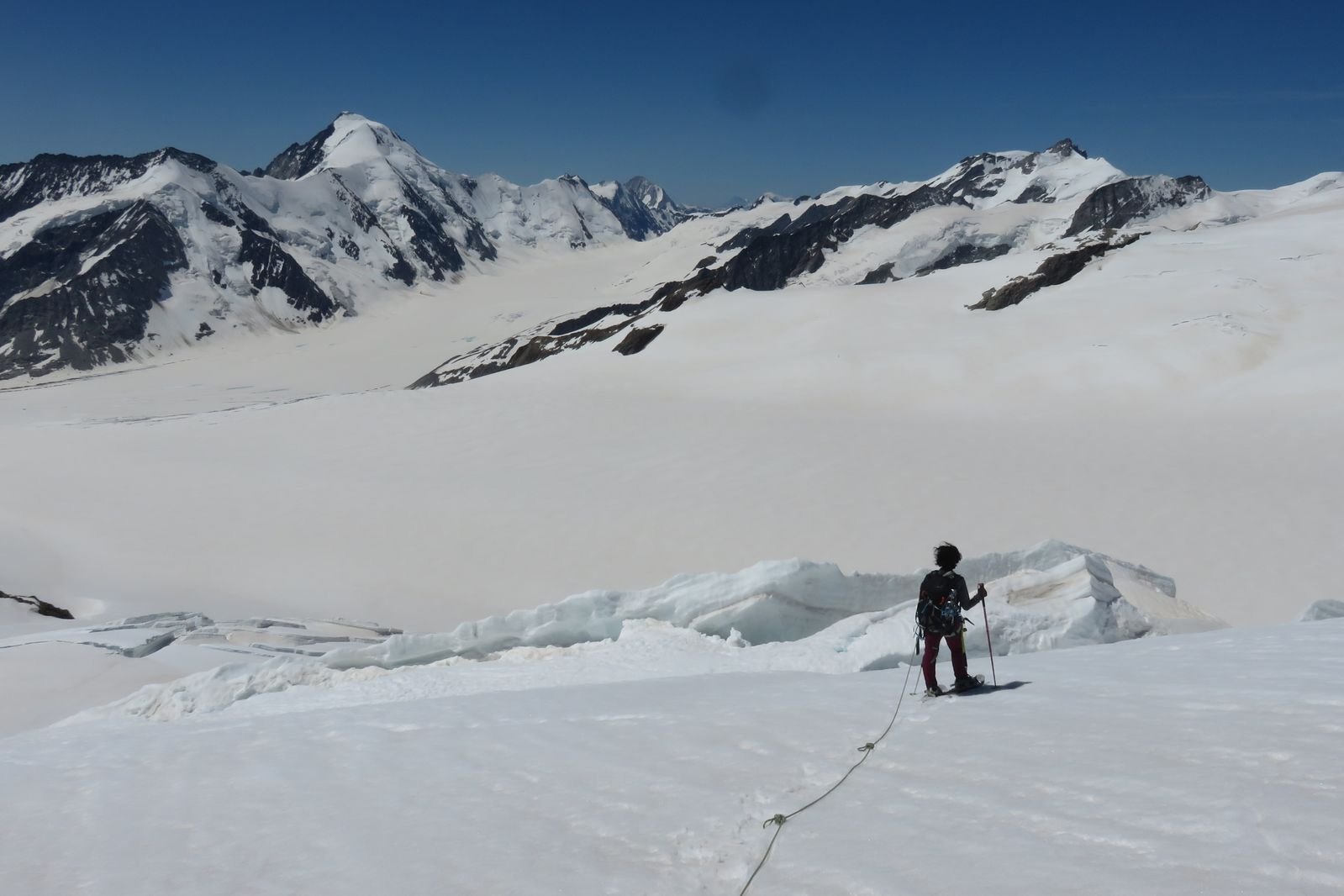 Dalla Monchjochhutte scendere nel ghiacciaio fino a 3300m. Attaccare a risalire verso la Fieschersattel 3923m dopo aver superato lo sperone SO del Grossfiescherhorn.