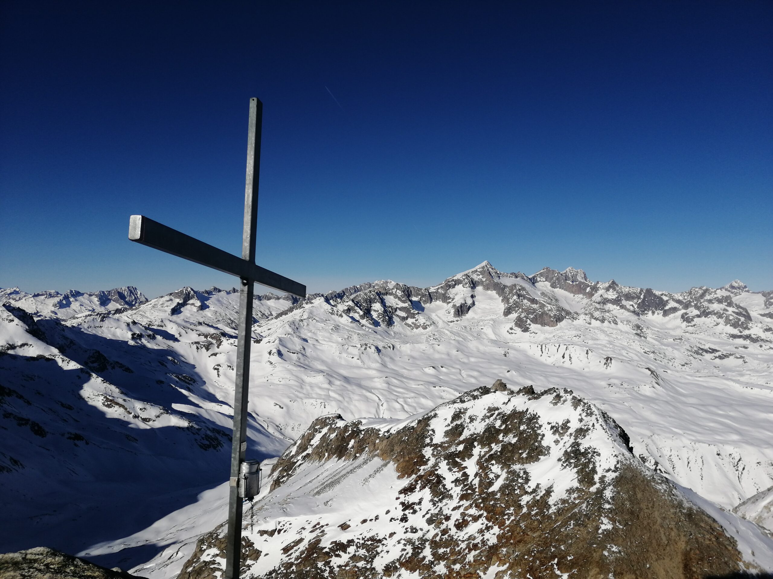 Buon innevamento a Realp. Niente di eccezionale ma rispetto alle Alpi Lombarde e Piemontesi, tanta roba. Pagamento naif con busta di carta in cui mettere 7 CHF e un biglietto con numero di targa… Percorso infinito fino alla Rotondo Hutte, poi sempre su evidente traccia, fino allo Skidepot. Mai pendii troppo ripidi, a parte gli ultimissimi metri. Su in cima con picca e ramponi, difficoltà F. Un tipo è salito e sceso senza ramponi, non imitare!