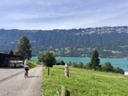 Arrivati a Gündlischwand il percorso diventa sterrato ma sempre ciclabile con una gravel e si arriva a Boenigend da qui bisogna seguire il percorso per bici 8 (o 9 che e’ in questo tratto lo stesso). Se si segue esattamente il percorso per le bici si risale leggermente a monte per poi scendere sul lago, oppure si puo’ semplicemente attraversare il paese per andare sulla strada che costeggia il lago Brienzersee dal colore meraviglioso.