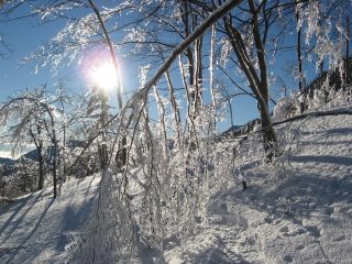 Seguito itinerario come descritto,,giornata spaziale e panorama splendido sulle Alpi ,fino al Rosa.Tratto nel bosco sotto le pendici del Monte Berlino da favola,con alberi coperti di neve e ghiaccio..
