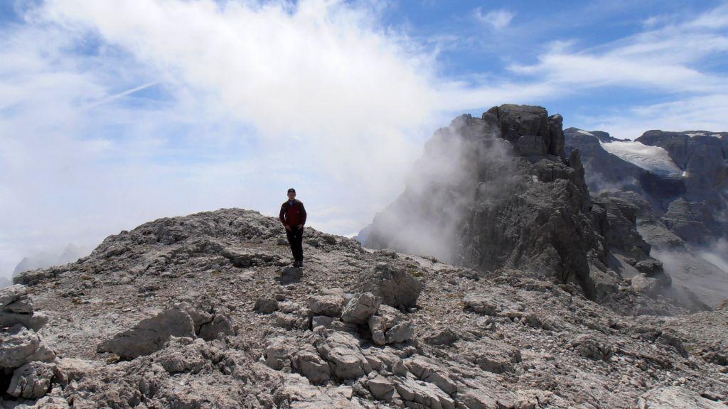 Dal Passo del Grostè (2432 m, h 0,30), comunque, si segue il filo del valico verso destra, con belle vedute sui ghiacciai della Presanella e sulle incredibili lastronate che, dall’altra parte, degradano dolcemente il Val Flavona. Raggiunto un grosso ometto, si scende in una piccola conca erbosa e, risalito un corto canalino (tracce), si esce sulle colate detritiche basali della Cima del Grostè. Da destra arriva il sentierino d’accesso: cartelli e scritte indicano l’inizio del Sentiero “Alfredo Benini” (2562 m, h 1,00). Il tracciato sale diagonalmente verso sinistra la pietraia, iniziando l’ampio aggiramento della massiccia Cima del Grostè: dopo poco, si incontra un bivio con cartello. Il sentiero attrezzato prosegue a sinistra, per la Cima del Grostè, invece, si risalgono direttamente i pendii detritici, con alcune facili roccette, seguendo ometti e segni rossi: raggiunta la base di un salto, si taglia decisamente a sinistra, per una esposta cengia, per poi risalire verso destra fino all’imbocco di un tetro canale-camino, formato da una quinta di roccia staccata dalla parete. Si risale il camino, con alcuni passi facili ma non banali (II-° grado) fino ad uscirne a sinistra. Ci si ritrova sulla vasta terrazza ghiaiosa che attraversa il versante Nord della cima, ben visibile anche dal basso. Si prosegue facilmente lungo la terrazza ghiaiosa verso sinistra, in leggera salita (attenzione ad eventuali lingue di neve dura), poi gli ometti ed i segni guidano nuovamente in alto, verso la fascia rocciosa superiore, in corrispondenza di un corto canalino che la incide diagonalmente. Risalito il facile canalino (I°-), si esce su una forcellina oramai sulla cresta principale. Procedendo verso sinistra, per dossi detritici, si raggiunge in breve la larga cima, dove sorge una caratteristica croce (2901 m, h 1,00 dal bivio). Fantastico panorama a giro d’orizzonte, dai ghiacciai dell’Adamello-Presanella a tutti i principali gruppi dolomitici. Vicinissima, incombe la grande parete di Cima Falkner, mentre dietro appare la muraglia incappucciata di ghiaccio di Cima Brenta.