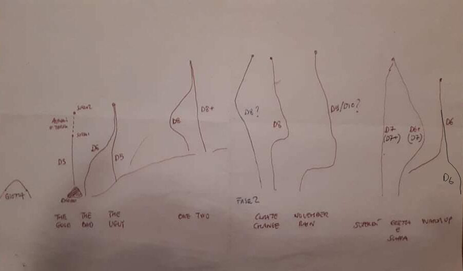 Falesia Dry con tiri atletici strapiombanti e tecnici sei gradi più semplici. I bolli rossi aiutano a leggere i tiri. Interamente spittata a spit inox da 10mm con alcuni rinvii fissi con catenella sui passi più strapiombanti.