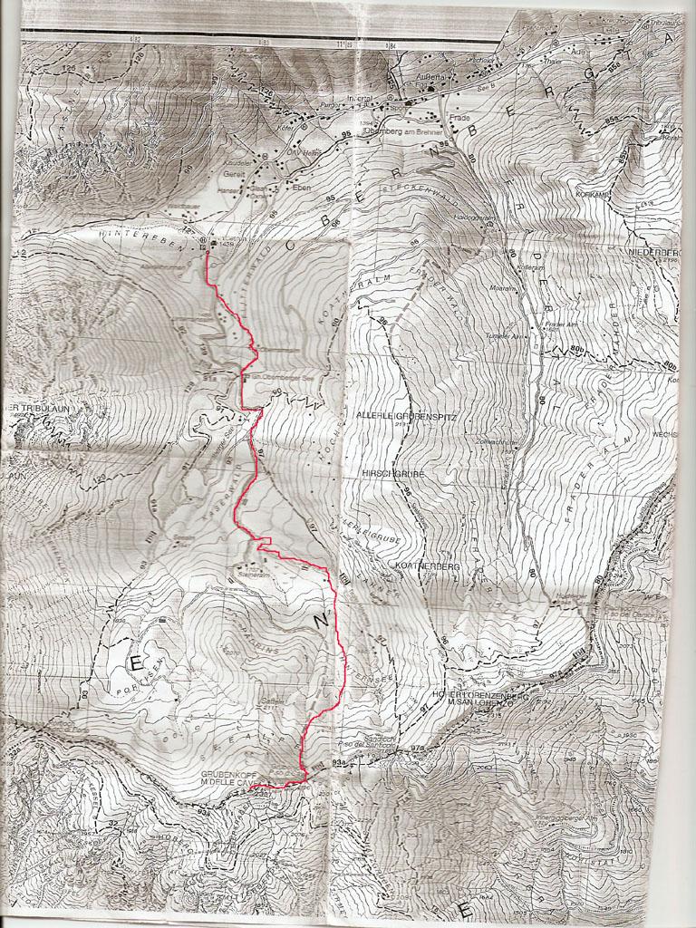 Da Waldesruh 1439 (parcheggio al termine della Obernbergtal, 3 euro al giorno) seguire per breve tratto la pista di slittino che oltrepassa il Seebach. Poco oltre il ponticello abbandonare la strada e per ampi prati si rimonta il pendio che conduce alla Oberrainsalm 1570 ca e da qui con traverso ascendente verso dx si giunge in breve alla Gasthof Obernbergsee (1594), sulle sponde dell’omonimo lago. Si contorna il lago con la strada in sponda dx e si giunge ad un primo bivio (Kapelle) dove occorre prendere a sx in leggera salita. Oltrepassato un crocifisso si giunge nuovamente ad un bivio (Kaserwald): ancora a sx dentro al bosco con un tratto più ripido; ignorare l’indicazione per il Sandjoch (it. 97) e proseguire sulla pista forestale che poi modera la pendenza e con ampia curva giunge a q. 1725 ca. dove occorre seguire le indicazioni per il Sandjoch. Dopo due ravvicinati tornanti si è in prossimità dell’ampia zona paludosa della Steineralm (Malga Steiner) che però non si raggiunge proseguendo sul bordo del bassopiano e giungendo a due isolati fienili a q. 1765 ca. alla base di un breve pendio sulla cui sommità e visibile un altro fienile. Raggiuntolo si prosegue sul dorso del pendio che evita un canale ed aggira un pendio più ripido di fronte a noi e conduce entro una vallecola poco ripida che si risale interamente fino a giungere in una zona pianeggiante a q. 2000 ca. (piccola baita). Da qui, ormai sotto al Grubenjoch, si sale il pendio di fronte a noi e si perviene nella conca sottostante il passo che da ultimo si raggiunge per pendio di moderata pendenza ( ev. cornice all’uscita). Dal valico (2196) si dirige a Ovest lungo il reticolato di confine italo-austriaco e si giunge in breve sull’anticima da dove con breve contropendenza si giunge alla croce di vetta del Grubenkopf (2337).