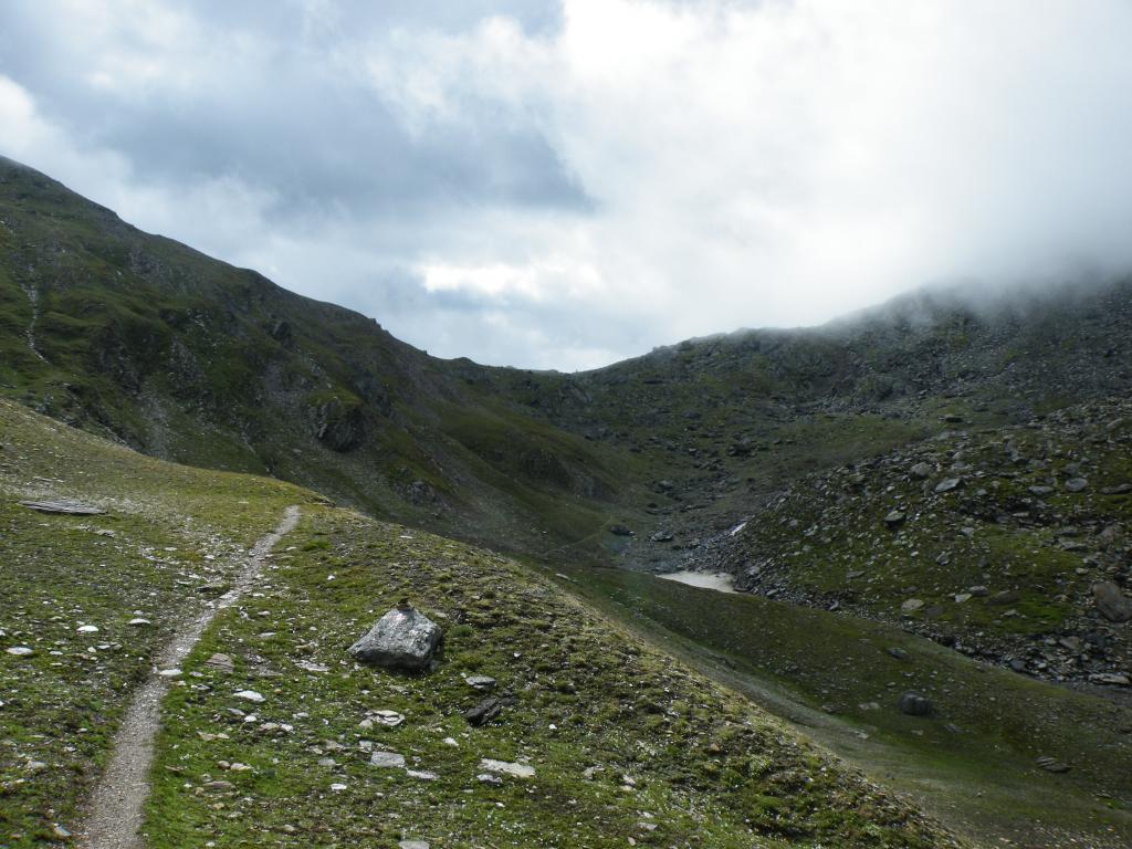 Da qui ,attraversato un ruscello, si risalgono innumerevoli pascoli e si transita nei pressi di un capanno (2190 m), si prosegue per un breve tratto in piano su pascolo fangoso, per riprendere poi a salire diversi dossi erbosi che terminano nei pressi del Lago Scheibsee.