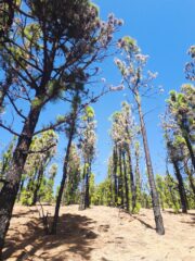 Il sentiero è ben segnalato e largo, e sale placido tra sempreverdi verso la catena montuosa che fa da corolla alla grande Canàda del Teide.