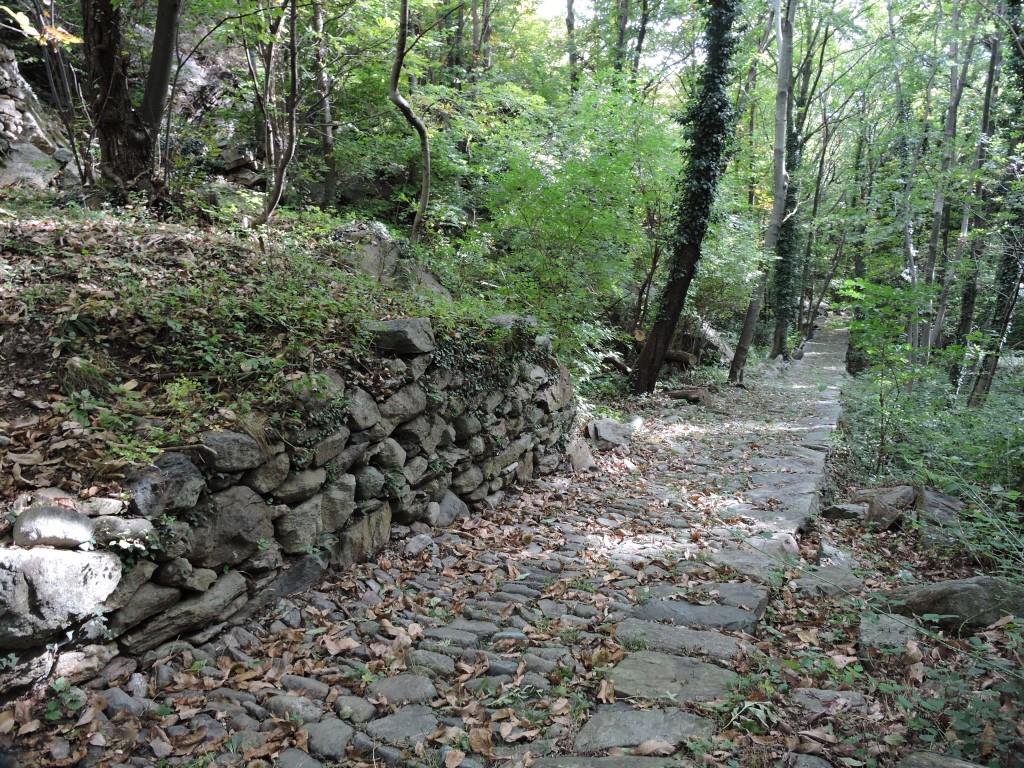 Percorrere ora la strada in discesa fino a Valcauda, 2 km. scarsi, e dalla chiesetta di San Grato scendere su larga mulattiera fino Campiglie sup., nel tornante di fronte al pilone votivo, seguire un sentiero in leggera salita che va ad attraversare il Rio Calamia su un bel ponte romanico in pietra, continua a risalire sul lato opposto, si incontrano alcune deviazioni, seguire sempre la traccia alta e si giunge ad immeterci nella mulattiera E1 nella zona denominata Truchet Culina. Seguire ora il sentiero E1 in discesa fino ad incrociare il percorso di andata.