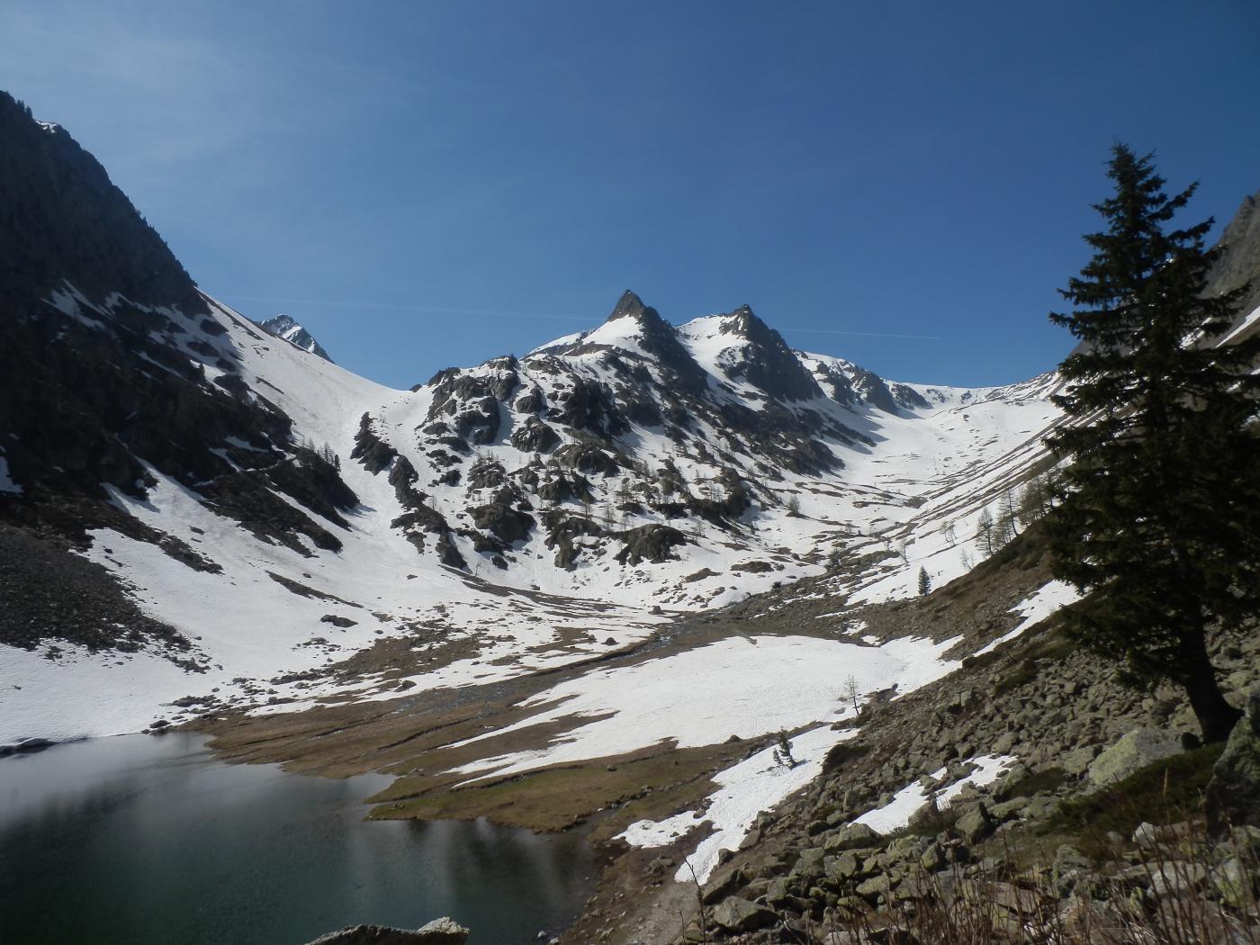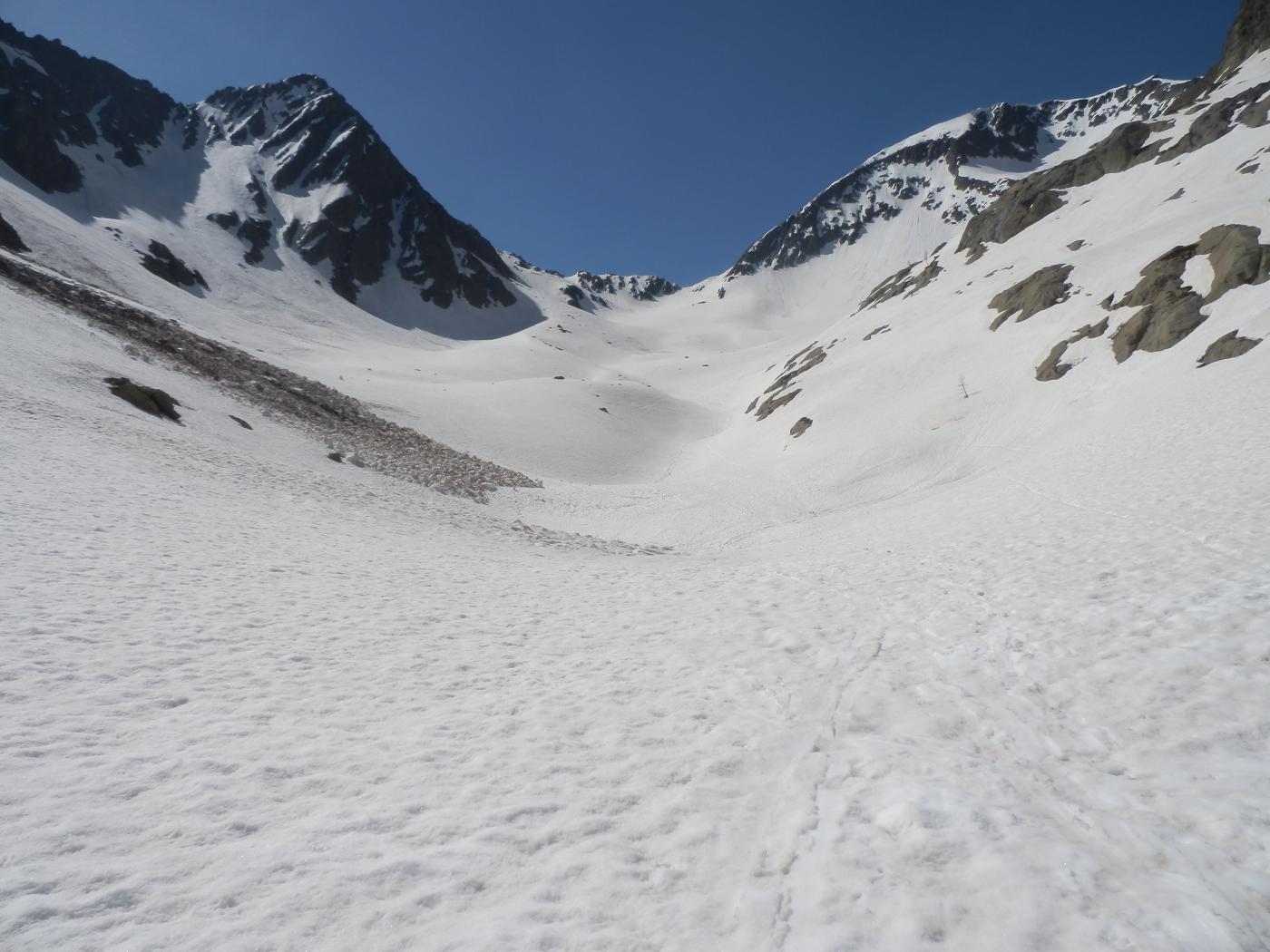Scendere al lago di San Bernolfo 1913m, costeggiare il lago lasciando sulla destra il largo vallone di Collalunga e poco dopo il lago innalzarsi per il ripido pendio-canale, sovente ricoperto da residui di valanga fino ad immettersi nella Comba della Guercia alla quota di 2150m che conduce all’omonimo colle.