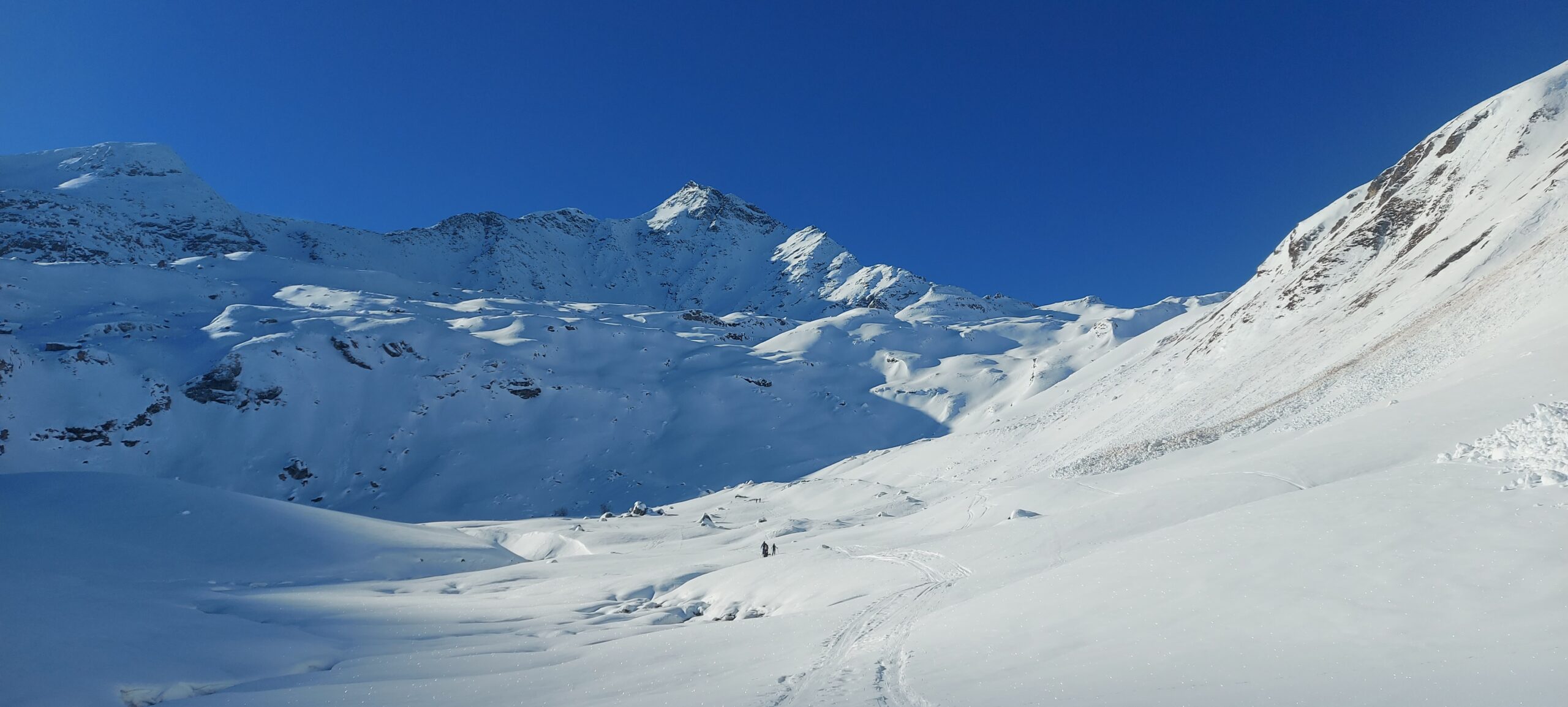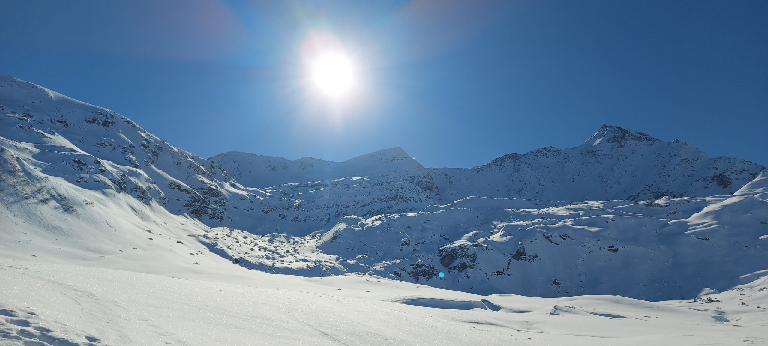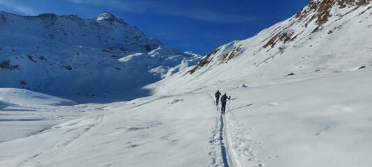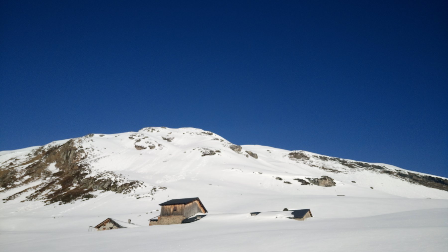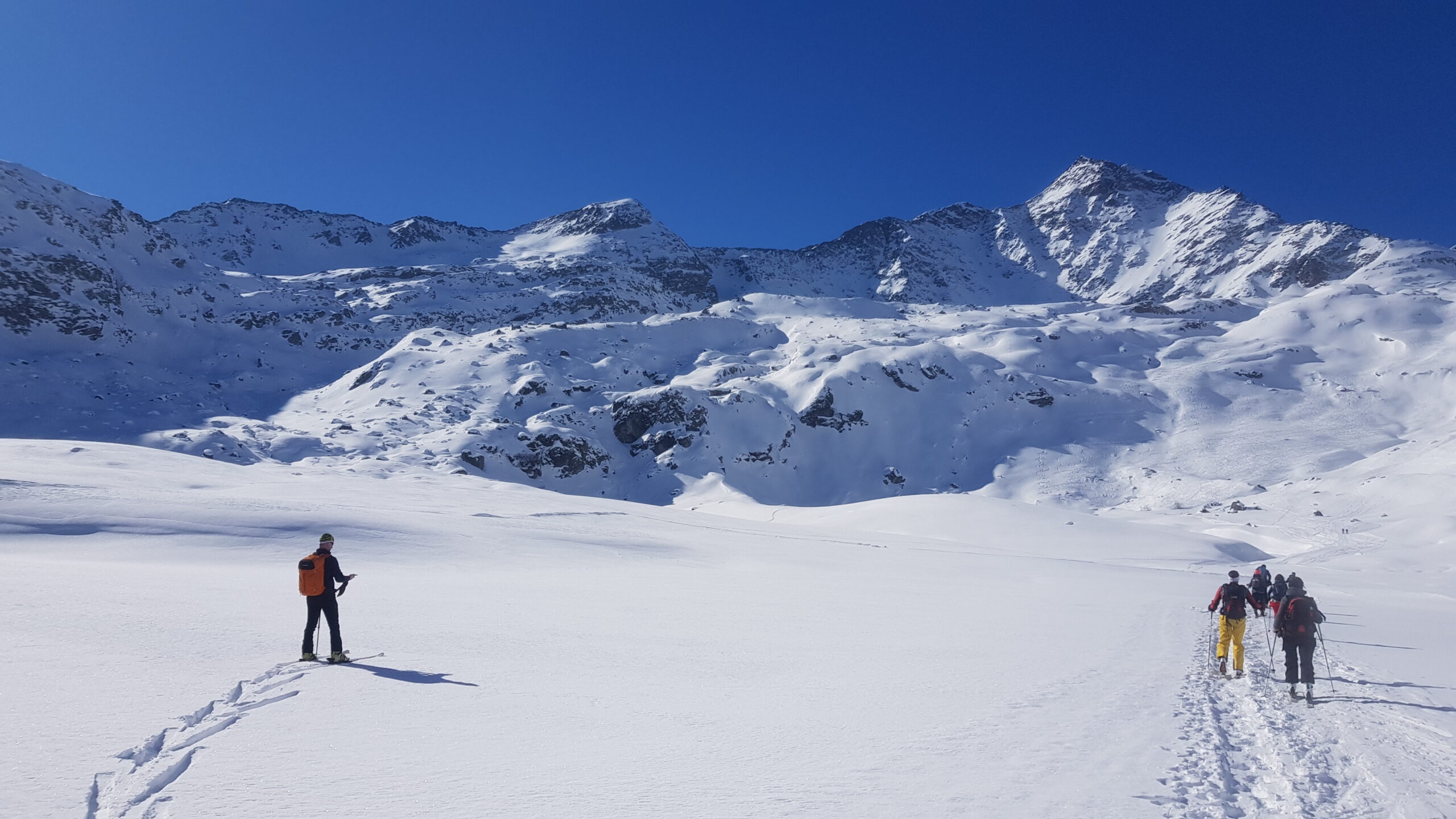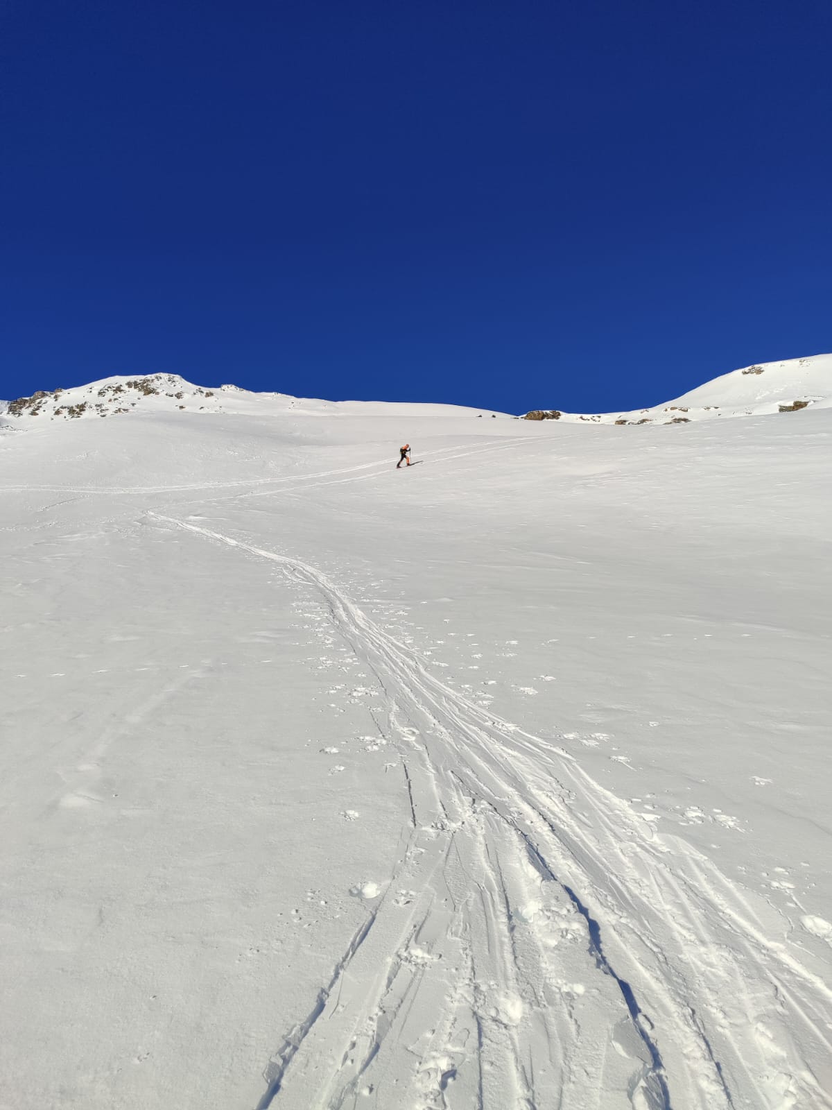 Si abbandona il comprensorio sciistico di Splügen ed attraversato il torrente di fondovalle ci si inoltra nella valle verso SW su terreno scarsamente inclinato in direzione dell’Areupass. Giunti a circa 2300 m di quota si devia verso NW e attraverso una serie di dossi ed avvallamenti si raggiunge un zona pianeggiante a circa 2600 m di quota (in Estate in questa zona sono presenti un paio di laghetti).