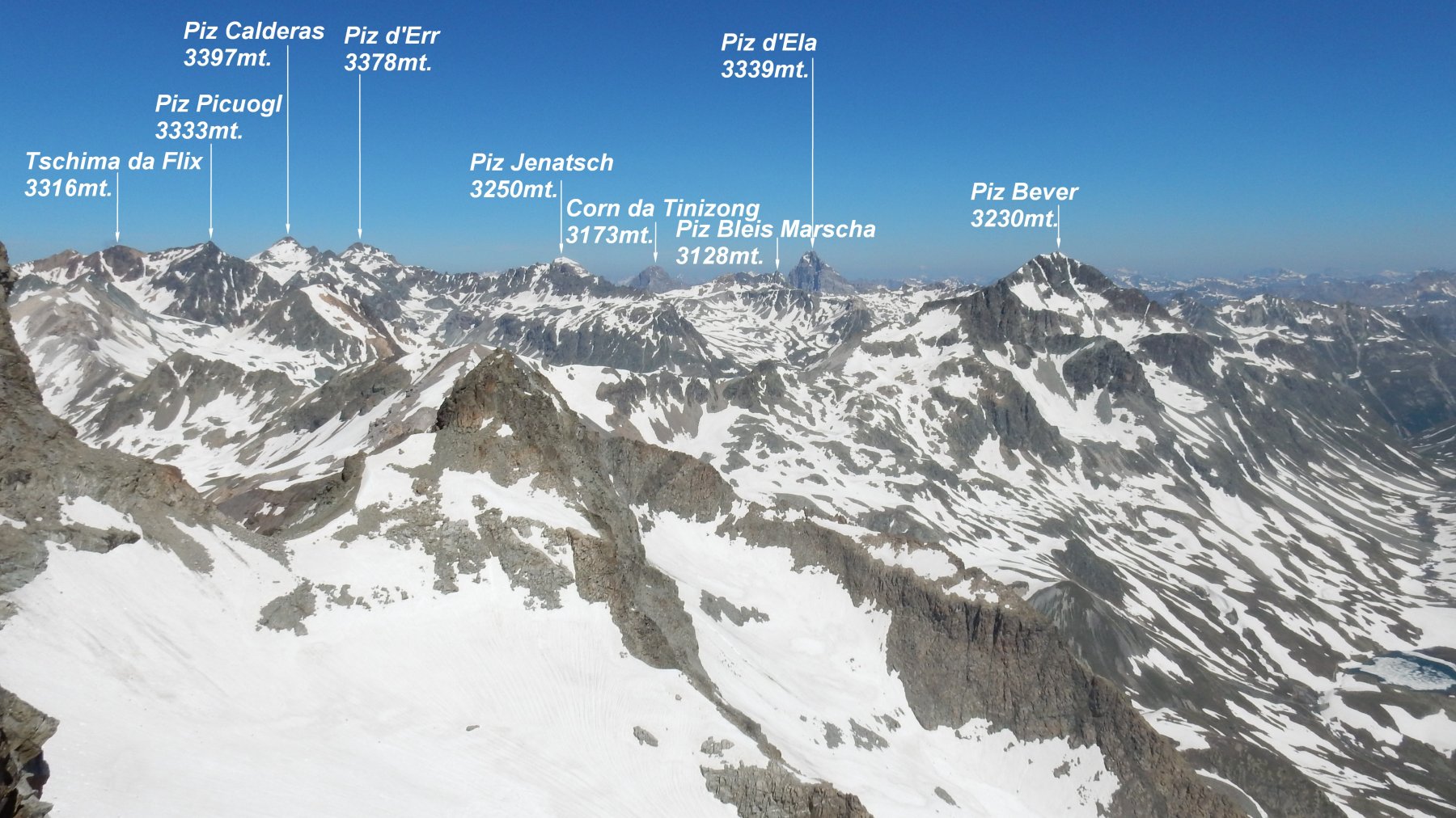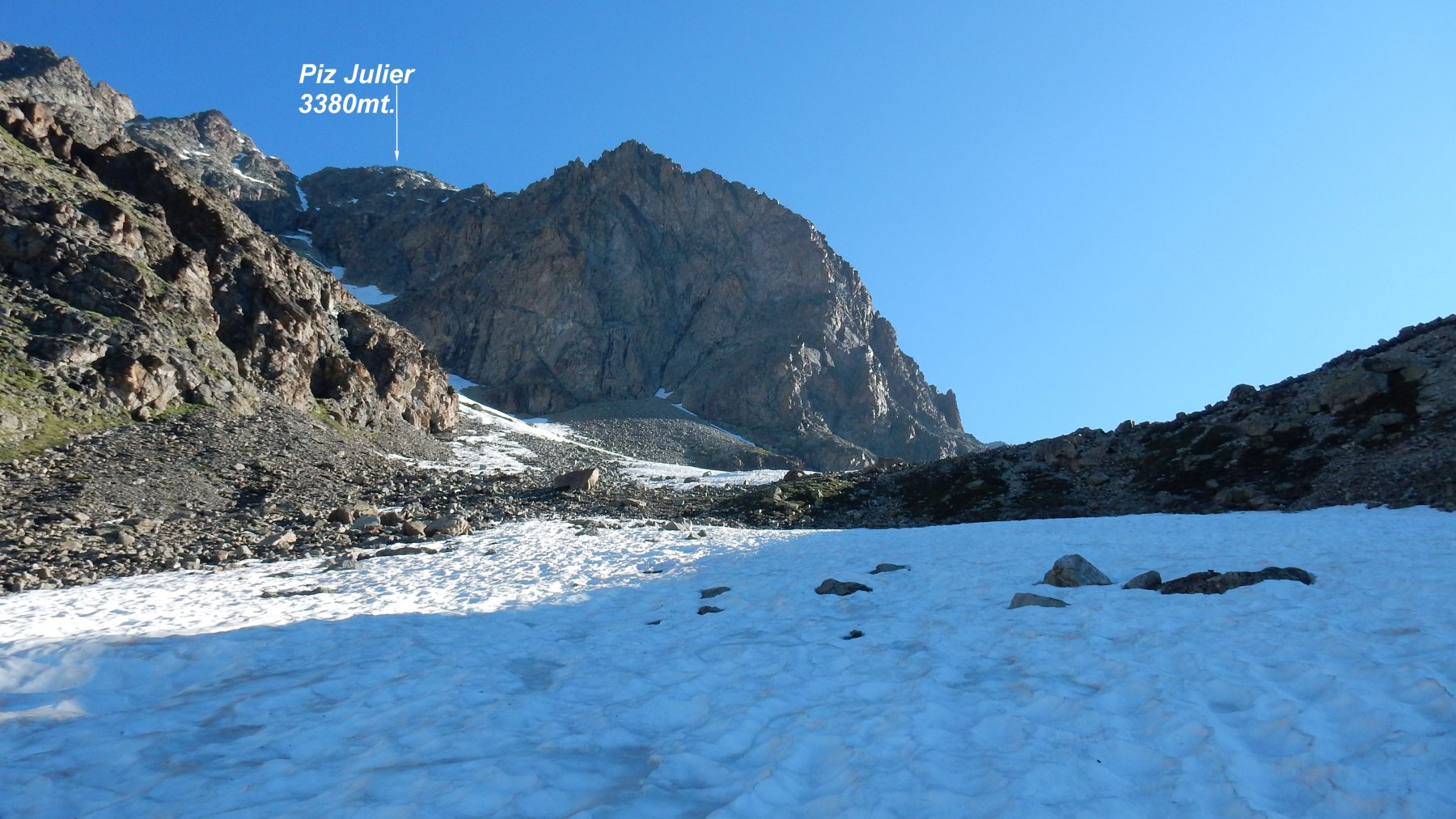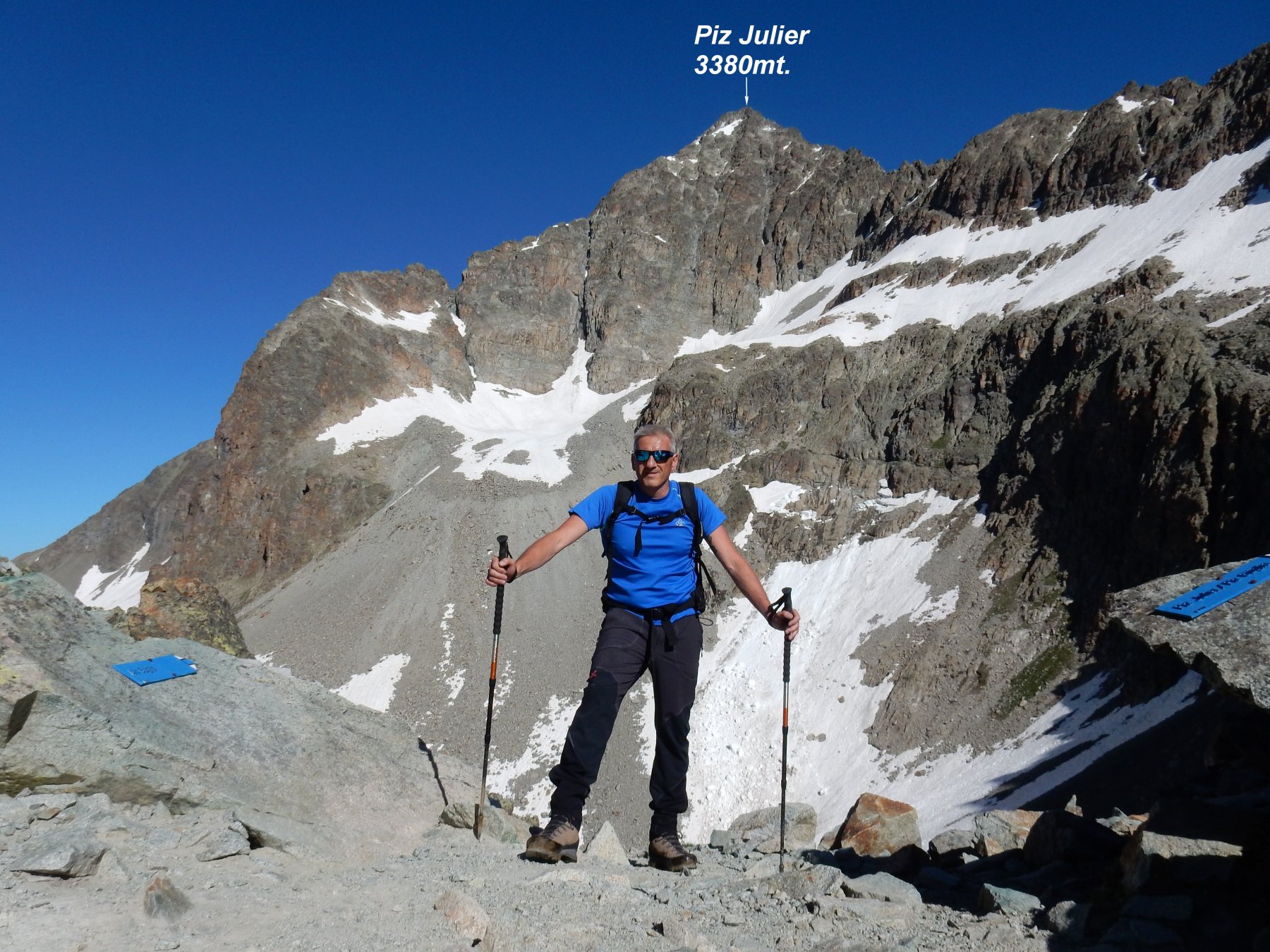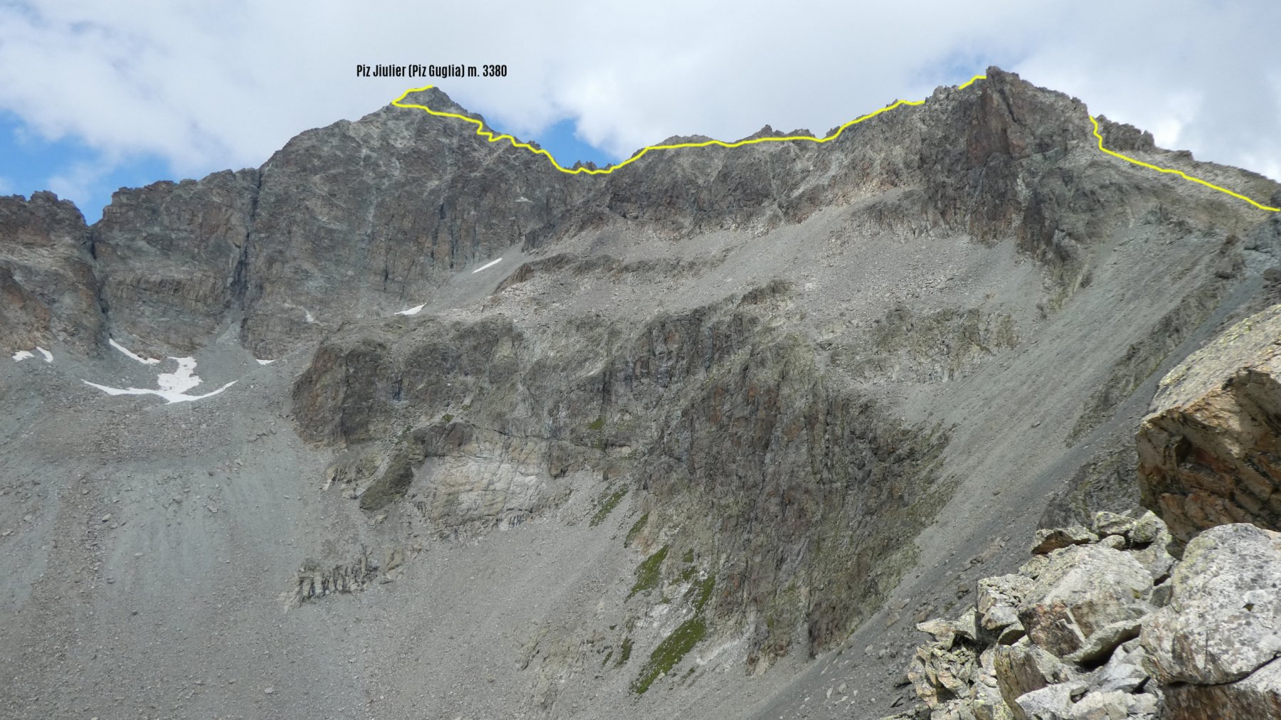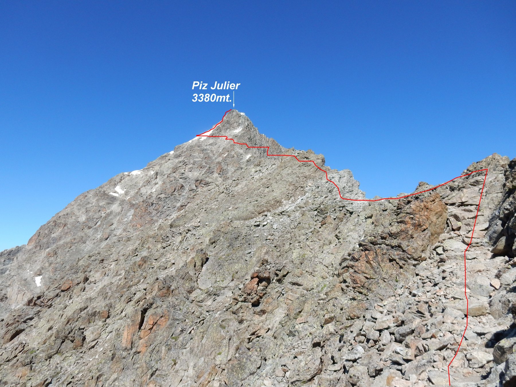 Dal parcheggio nei pressi dell’Alpe Guglia (ma la località è nota anche come Chamanna dal Stradin) si seguono le indicazioni (cartello indicatore per il Piz Jiulier, segnavia bianco-azzurri) e si inizia lungo il sentiero in leggera discesa che porta ad oltrepassare una conca di grossi pietroni per risalire subito dopo, uno ripido dosso erboso prima e detritico poi. Superato il dosso iniziale del vallone, si prosegue verso destra entrando in una vasta conca detritica (nota come Munteratsch), e da qui si supera una ripida rampa morenica a sinistra (sede di un antico ghiacciaio, ormai completamente scomparso) su pietroni di ogni dimensioni e non sempre stabili, con percorso non sempre agevole si raggiunge il culmine della rampa, dove si vede bene la conca terminale ed il colle della Fuorcla Albana che dovremo raggiungere (si può evitare il saliscendi tenendo il centro della conca terminale ed evitando il tratto in salita, evitando di seguire i segnavia e gli ometti presenti). Si scende ora per pietroni e qualche gradino roccioso nel fondo della conca terminale, da dove un sentierino che sale in diagonale verso destra, su terreno più stabile, raggiungendo la Fuorcla Albana m. 2870, dove si trova un piccolo bivacco di emergenza senza nome. Qui arriva anche un altro sentiero, proveniente dall’Alpe Suvretta (Saint Moritz). Si prosegue ora lungo la “Crasta da la Senda”, lungo il sentierino che si tiene a sinistra e qualche metro sotto il filo di cresta, segue poi un traverso a destra che permette di evitare una balza rocciosa, entrando in un ripido canalone detritico, che con percorso ripido e abbastanza diretto, superando alcune facili roccette e un gradone (attrezzato con catene) riporta sul filo di cresta. Si prosegue per un breve tratto lungo la cresta, poi si traversa nuovamente a destra per evitare alcuni torrioni su alcune cenge, segue un altro tratto di cresta, un traverso a sinistra e il primo intaglio (esposto, ma protetto da paletti e catene) e successivamente si incontra il passaggio più impegnativo della salita, una placchetta liscia, inclinata ed esposta (passo di II) ma attrezzata anche in questo caso con catene. Ci si trova ora sotto la Cima Est o anticima, che viene aggirata completamente a sinistra seguendo una lunga cengia quasi pianeggiante, prima facile e poi si restringe, diventando più impegnativa ed aerea (catene), alcuni gradini rocciosi e un tratto aereo lungo il filo di cresta portano al secondo intaglio esposto, anche qui si trovano le catene e i corrimano. Un ultimo tratto di cengette, canalini e qualche gradino roccioso portano al tratto finale di cresta, una traccia di sentiero e alcune facili roccette porta alla cima, indicata semplicemente da un grande ometto di pietre. Attenzione a non smuovere pietre mobili, presenti quasi ovunque, dato che la cima gode di una ottima frequentazione. (ore 4.00 indicative dall’Alpe Guglia alla cima). In discesa si percorre integralmente lo stesso percorso di salita.