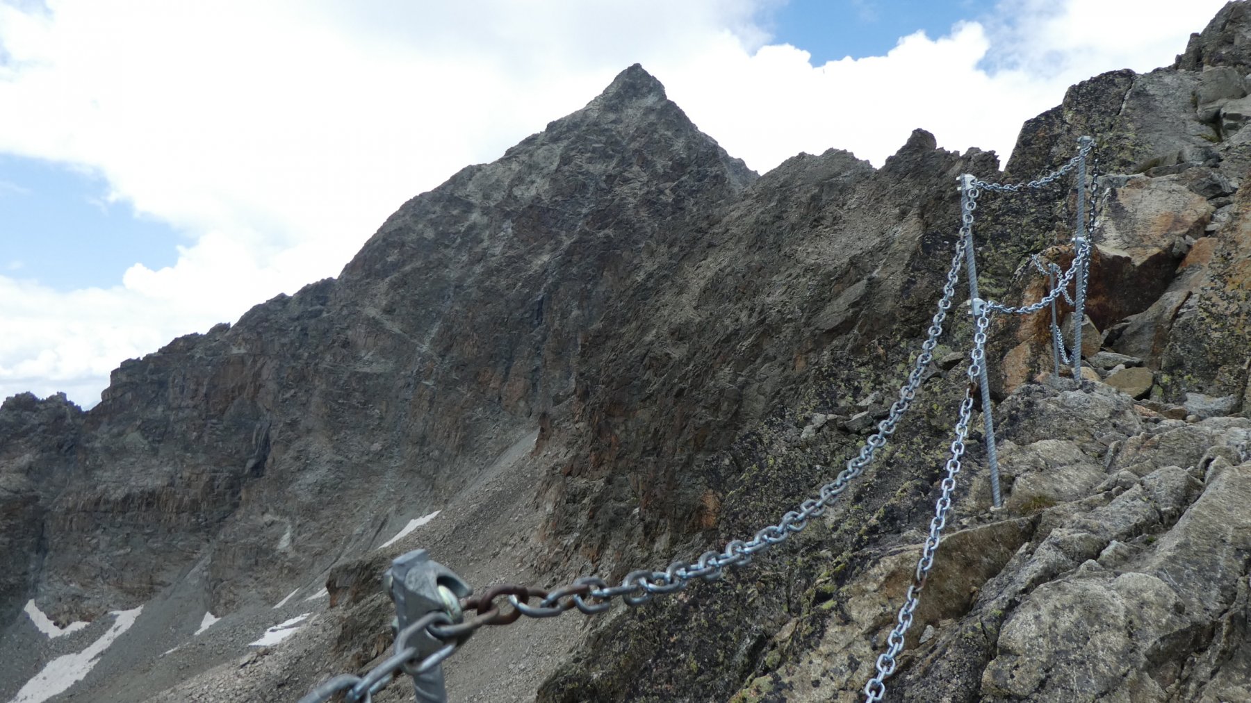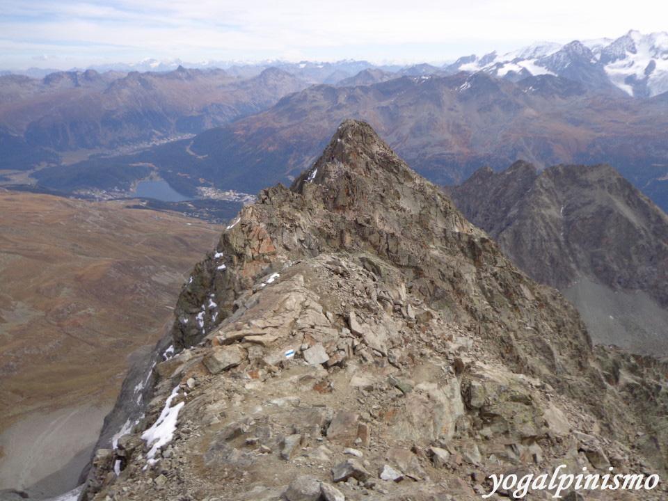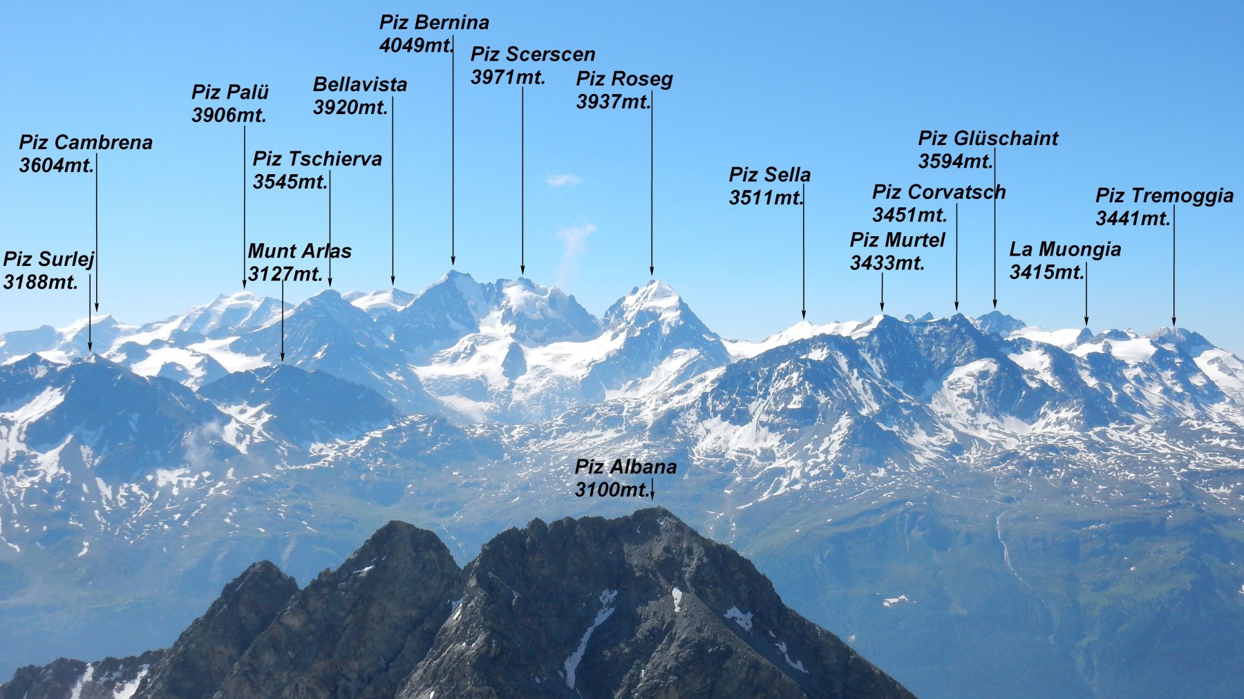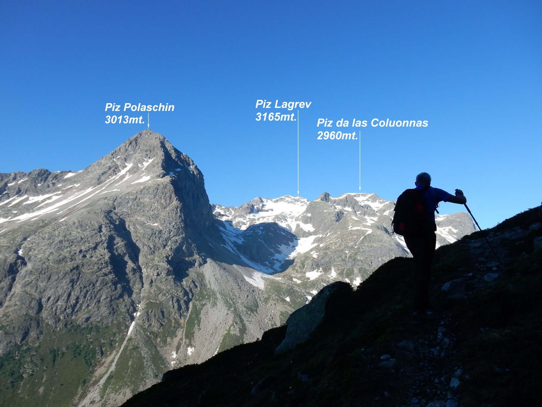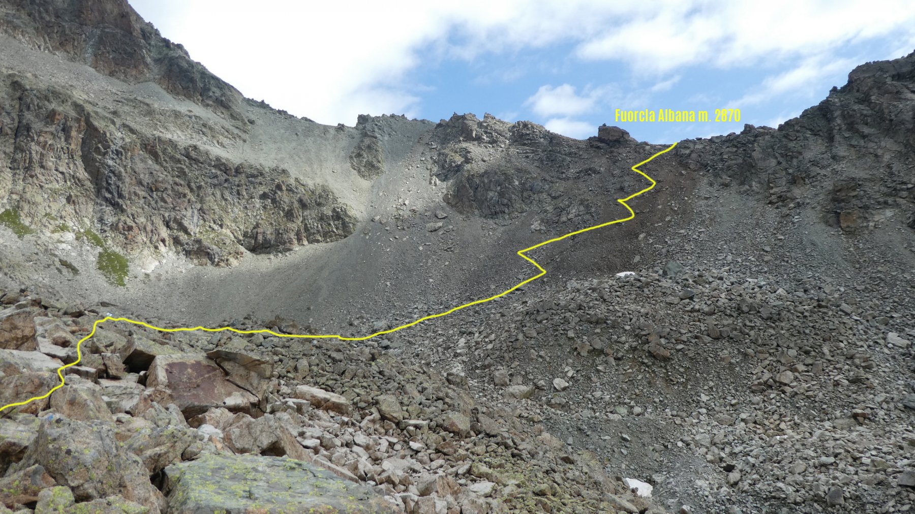 Dal parcheggio nei pressi dell’Alpe Guglia (ma la località è nota anche come Chamanna dal Stradin) si seguono le indicazioni (cartello indicatore per il Piz Jiulier, segnavia bianco-azzurri) e si inizia lungo il sentiero in leggera discesa che porta ad oltrepassare una conca di grossi pietroni per risalire subito dopo, uno ripido dosso erboso prima e detritico poi. Superato il dosso iniziale del vallone, si prosegue verso destra entrando in una vasta conca detritica (nota come Munteratsch), e da qui si supera una ripida rampa morenica a sinistra (sede di un antico ghiacciaio, ormai completamente scomparso) su pietroni di ogni dimensioni e non sempre stabili, con percorso non sempre agevole si raggiunge il culmine della rampa, dove si vede bene la conca terminale ed il colle della Fuorcla Albana che dovremo raggiungere (si può evitare il saliscendi tenendo il centro della conca terminale ed evitando il tratto in salita, evitando di seguire i segnavia e gli ometti presenti). Si scende ora per pietroni e qualche gradino roccioso nel fondo della conca terminale, da dove un sentierino che sale in diagonale verso destra, su terreno più stabile, raggiungendo la Fuorcla Albana m. 2870, dove si trova un piccolo bivacco di emergenza senza nome. Qui arriva anche un altro sentiero, proveniente dall’Alpe Suvretta (Saint Moritz). Si prosegue ora lungo la “Crasta da la Senda”, lungo il sentierino che si tiene a sinistra e qualche metro sotto il filo di cresta, segue poi un traverso a destra che permette di evitare una balza rocciosa, entrando in un ripido canalone detritico, che con percorso ripido e abbastanza diretto, superando alcune facili roccette e un gradone (attrezzato con catene) riporta sul filo di cresta. Si prosegue per un breve tratto lungo la cresta, poi si traversa nuovamente a destra per evitare alcuni torrioni su alcune cenge, segue un altro tratto di cresta, un traverso a sinistra e il primo intaglio (esposto, ma protetto da paletti e catene) e successivamente si incontra il passaggio più impegnativo della salita, una placchetta liscia, inclinata ed esposta (passo di II) ma attrezzata anche in questo caso con catene. Ci si trova ora sotto la Cima Est o anticima, che viene aggirata completamente a sinistra seguendo una lunga cengia quasi pianeggiante, prima facile e poi si restringe, diventando più impegnativa ed aerea (catene), alcuni gradini rocciosi e un tratto aereo lungo il filo di cresta portano al secondo intaglio esposto, anche qui si trovano le catene e i corrimano. Un ultimo tratto di cengette, canalini e qualche gradino roccioso portano al tratto finale di cresta, una traccia di sentiero e alcune facili roccette porta alla cima, indicata semplicemente da un grande ometto di pietre. Attenzione a non smuovere pietre mobili, presenti quasi ovunque, dato che la cima gode di una ottima frequentazione. (ore 4.00 indicative dall’Alpe Guglia alla cima). In discesa si percorre integralmente lo stesso percorso di salita.