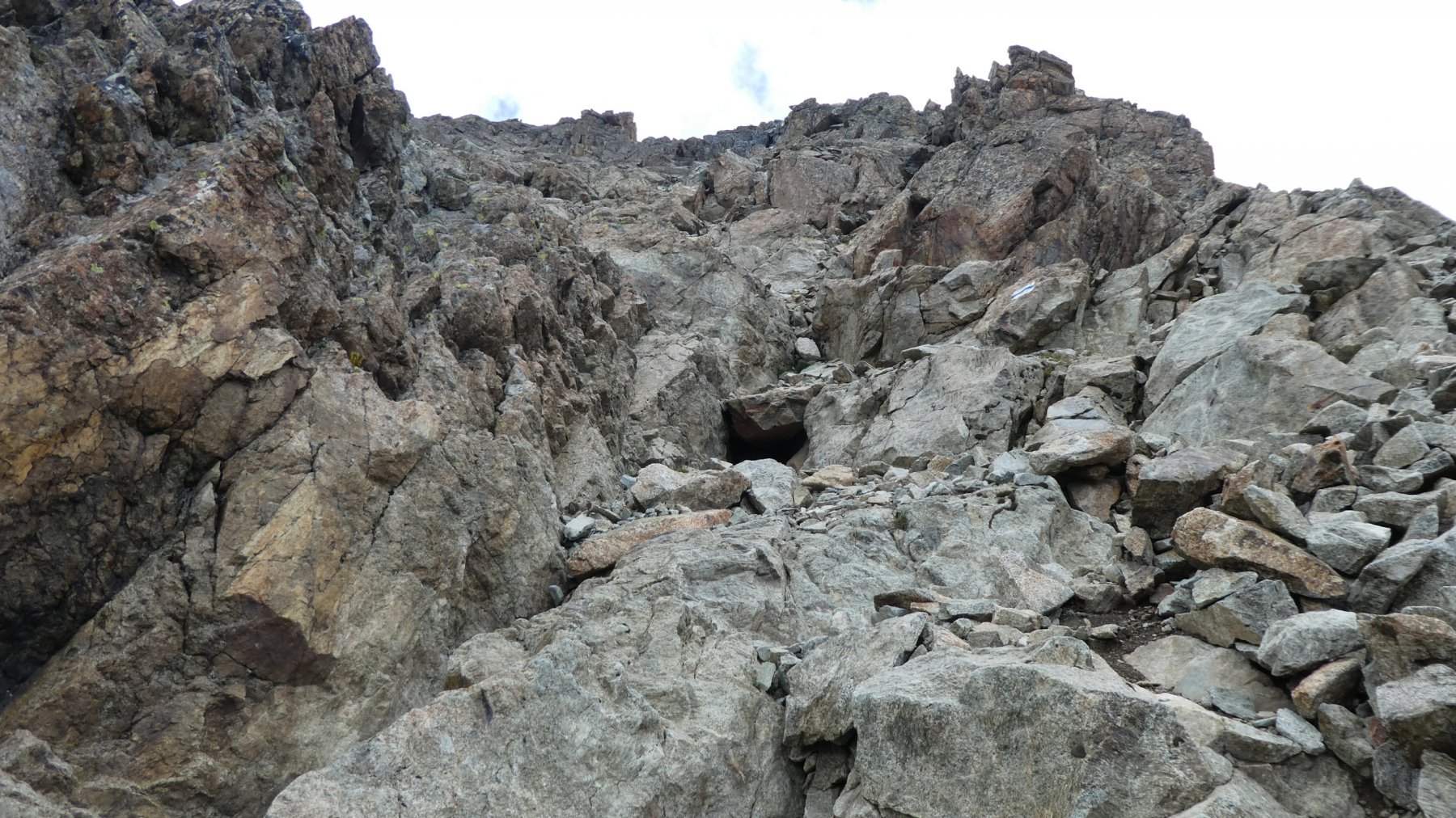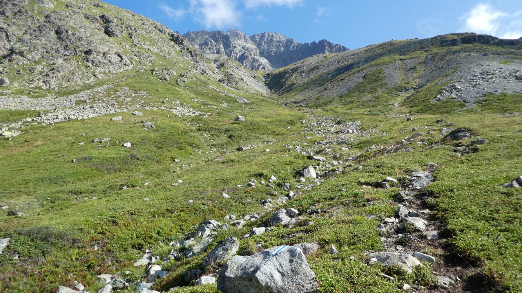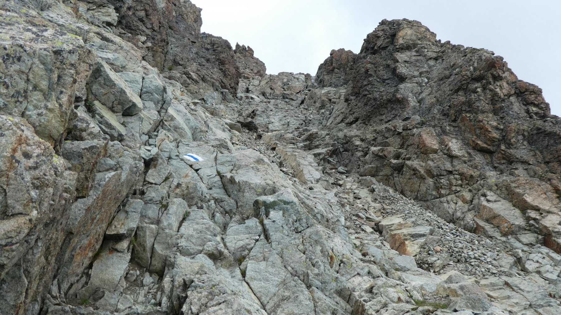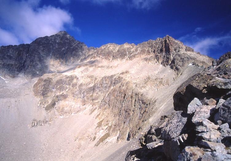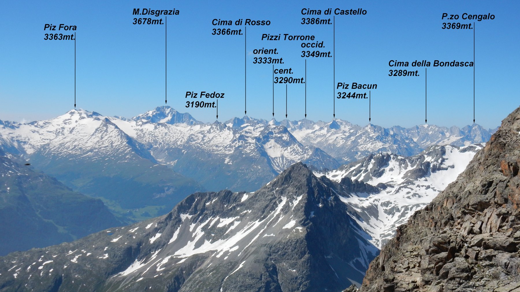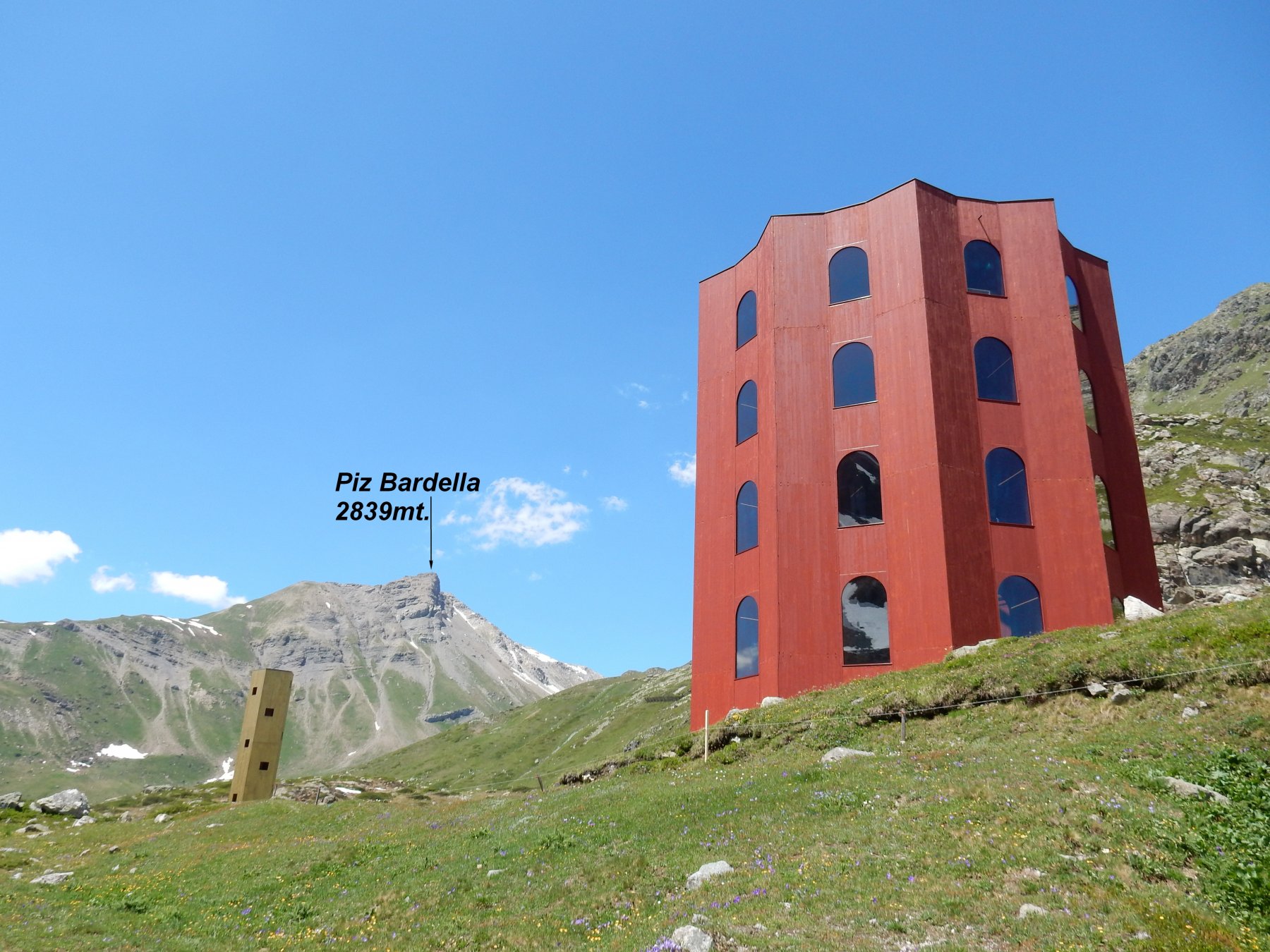 Dal parcheggio nei pressi dell’Alpe Guglia (ma la località è nota anche come Chamanna dal Stradin) si seguono le indicazioni (cartello indicatore per il Piz Jiulier, segnavia bianco-azzurri) e si inizia lungo il sentiero in leggera discesa che porta ad oltrepassare una conca di grossi pietroni per risalire subito dopo, uno ripido dosso erboso prima e detritico poi. Superato il dosso iniziale del vallone, si prosegue verso destra entrando in una vasta conca detritica (nota come Munteratsch), e da qui si supera una ripida rampa morenica a sinistra (sede di un antico ghiacciaio, ormai completamente scomparso) su pietroni di ogni dimensioni e non sempre stabili, con percorso non sempre agevole si raggiunge il culmine della rampa, dove si vede bene la conca terminale ed il colle della Fuorcla Albana che dovremo raggiungere (si può evitare il saliscendi tenendo il centro della conca terminale ed evitando il tratto in salita, evitando di seguire i segnavia e gli ometti presenti). Si scende ora per pietroni e qualche gradino roccioso nel fondo della conca terminale, da dove un sentierino che sale in diagonale verso destra, su terreno più stabile, raggiungendo la Fuorcla Albana m. 2870, dove si trova un piccolo bivacco di emergenza senza nome. Qui arriva anche un altro sentiero, proveniente dall’Alpe Suvretta (Saint Moritz). Si prosegue ora lungo la “Crasta da la Senda”, lungo il sentierino che si tiene a sinistra e qualche metro sotto il filo di cresta, segue poi un traverso a destra che permette di evitare una balza rocciosa, entrando in un ripido canalone detritico, che con percorso ripido e abbastanza diretto, superando alcune facili roccette e un gradone (attrezzato con catene) riporta sul filo di cresta. Si prosegue per un breve tratto lungo la cresta, poi si traversa nuovamente a destra per evitare alcuni torrioni su alcune cenge, segue un altro tratto di cresta, un traverso a sinistra e il primo intaglio (esposto, ma protetto da paletti e catene) e successivamente si incontra il passaggio più impegnativo della salita, una placchetta liscia, inclinata ed esposta (passo di II) ma attrezzata anche in questo caso con catene. Ci si trova ora sotto la Cima Est o anticima, che viene aggirata completamente a sinistra seguendo una lunga cengia quasi pianeggiante, prima facile e poi si restringe, diventando più impegnativa ed aerea (catene), alcuni gradini rocciosi e un tratto aereo lungo il filo di cresta portano al secondo intaglio esposto, anche qui si trovano le catene e i corrimano. Un ultimo tratto di cengette, canalini e qualche gradino roccioso portano al tratto finale di cresta, una traccia di sentiero e alcune facili roccette porta alla cima, indicata semplicemente da un grande ometto di pietre. Attenzione a non smuovere pietre mobili, presenti quasi ovunque, dato che la cima gode di una ottima frequentazione. (ore 4.00 indicative dall’Alpe Guglia alla cima). In discesa si percorre integralmente lo stesso percorso di salita.