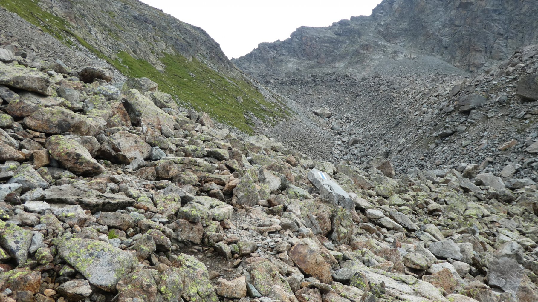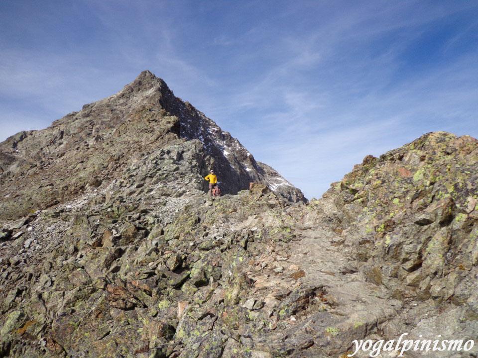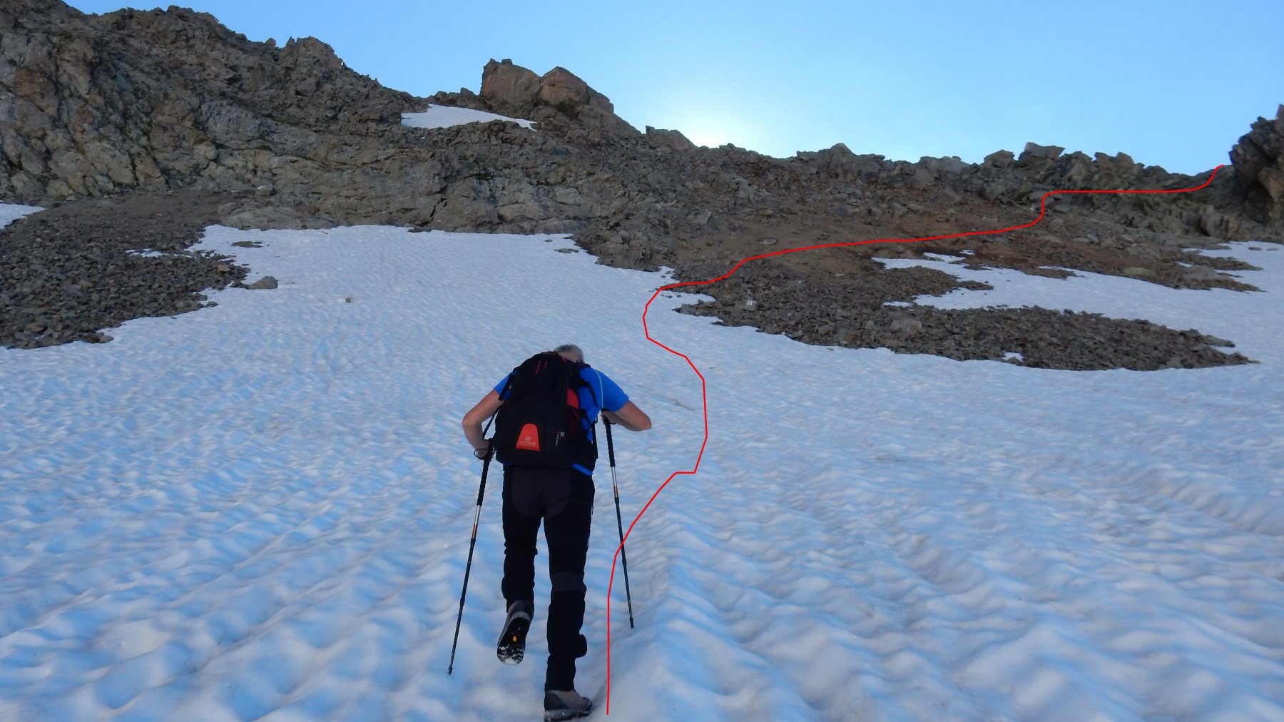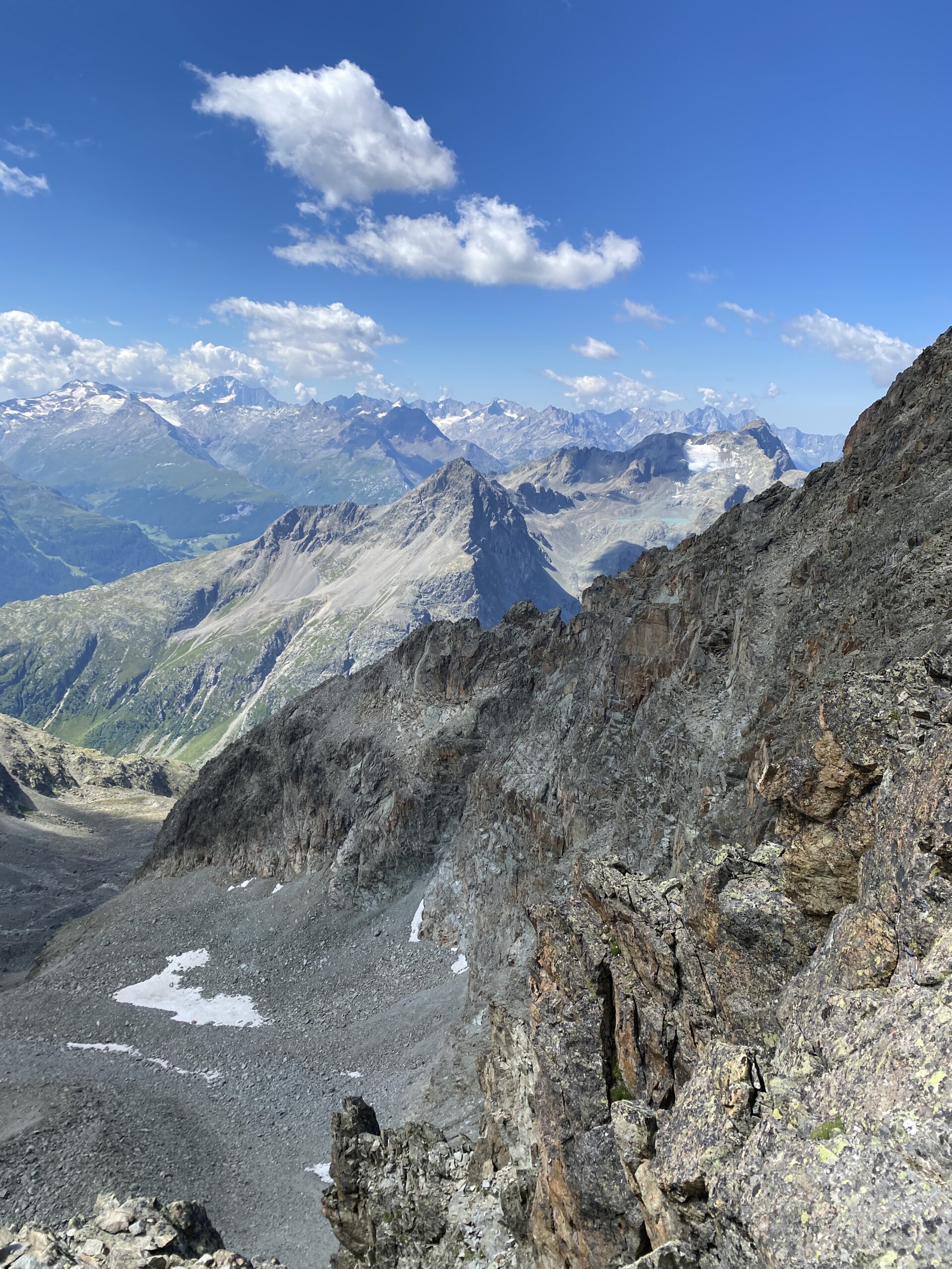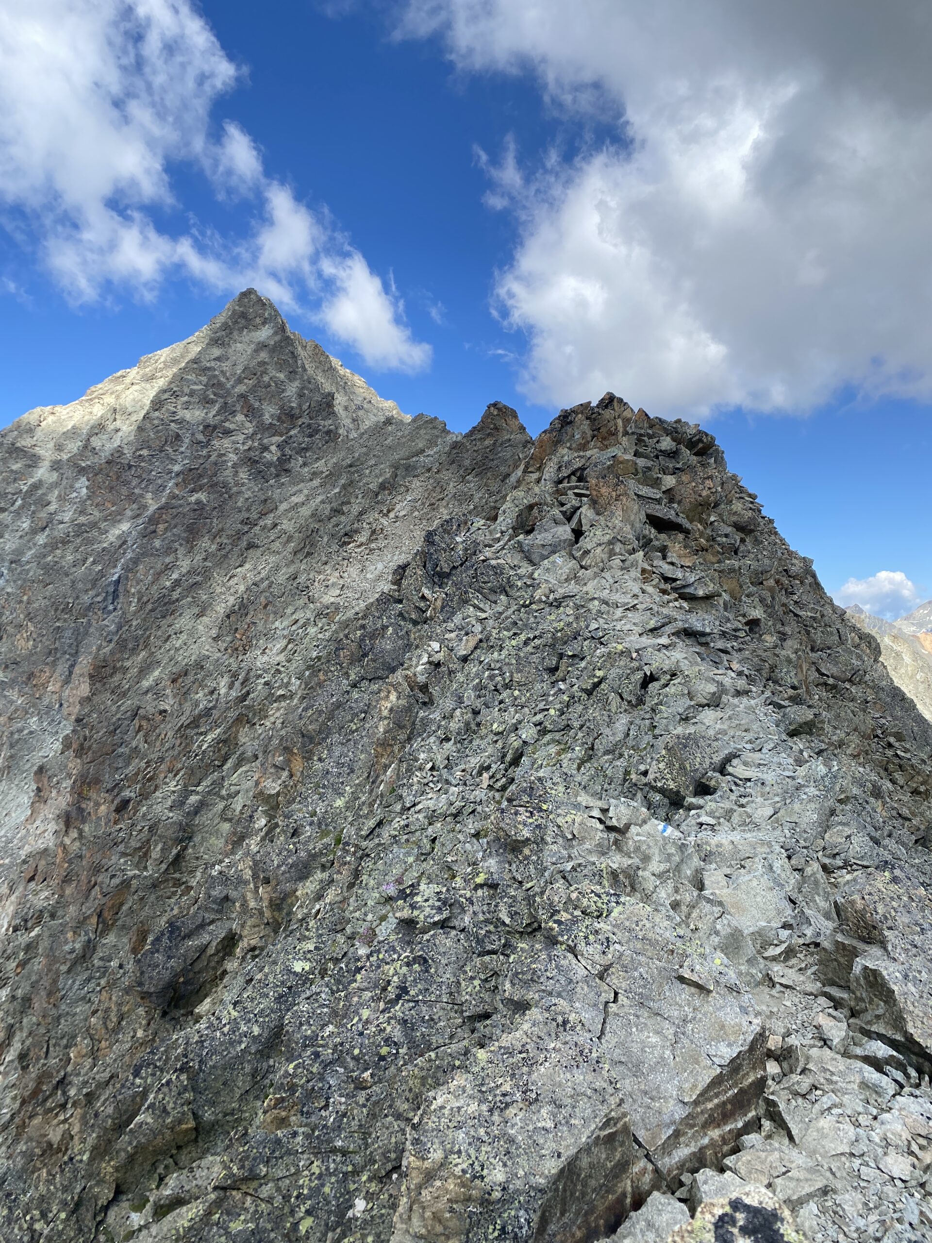 Dal parcheggio nei pressi dell’Alpe Guglia (ma la località è nota anche come Chamanna dal Stradin) si seguono le indicazioni (cartello indicatore per il Piz Jiulier, segnavia bianco-azzurri) e si inizia lungo il sentiero in leggera discesa che porta ad oltrepassare una conca di grossi pietroni per risalire subito dopo, uno ripido dosso erboso prima e detritico poi. Superato il dosso iniziale del vallone, si prosegue verso destra entrando in una vasta conca detritica (nota come Munteratsch), e da qui si supera una ripida rampa morenica a sinistra (sede di un antico ghiacciaio, ormai completamente scomparso) su pietroni di ogni dimensioni e non sempre stabili, con percorso non sempre agevole si raggiunge il culmine della rampa, dove si vede bene la conca terminale ed il colle della Fuorcla Albana che dovremo raggiungere (si può evitare il saliscendi tenendo il centro della conca terminale ed evitando il tratto in salita, evitando di seguire i segnavia e gli ometti presenti). Si scende ora per pietroni e qualche gradino roccioso nel fondo della conca terminale, da dove un sentierino che sale in diagonale verso destra, su terreno più stabile, raggiungendo la Fuorcla Albana m. 2870, dove si trova un piccolo bivacco di emergenza senza nome. Qui arriva anche un altro sentiero, proveniente dall’Alpe Suvretta (Saint Moritz). Si prosegue ora lungo la “Crasta da la Senda”, lungo il sentierino che si tiene a sinistra e qualche metro sotto il filo di cresta, segue poi un traverso a destra che permette di evitare una balza rocciosa, entrando in un ripido canalone detritico, che con percorso ripido e abbastanza diretto, superando alcune facili roccette e un gradone (attrezzato con catene) riporta sul filo di cresta. Si prosegue per un breve tratto lungo la cresta, poi si traversa nuovamente a destra per evitare alcuni torrioni su alcune cenge, segue un altro tratto di cresta, un traverso a sinistra e il primo intaglio (esposto, ma protetto da paletti e catene) e successivamente si incontra il passaggio più impegnativo della salita, una placchetta liscia, inclinata ed esposta (passo di II) ma attrezzata anche in questo caso con catene. Ci si trova ora sotto la Cima Est o anticima, che viene aggirata completamente a sinistra seguendo una lunga cengia quasi pianeggiante, prima facile e poi si restringe, diventando più impegnativa ed aerea (catene), alcuni gradini rocciosi e un tratto aereo lungo il filo di cresta portano al secondo intaglio esposto, anche qui si trovano le catene e i corrimano. Un ultimo tratto di cengette, canalini e qualche gradino roccioso portano al tratto finale di cresta, una traccia di sentiero e alcune facili roccette porta alla cima, indicata semplicemente da un grande ometto di pietre. Attenzione a non smuovere pietre mobili, presenti quasi ovunque, dato che la cima gode di una ottima frequentazione. (ore 4.00 indicative dall’Alpe Guglia alla cima). In discesa si percorre integralmente lo stesso percorso di salita.