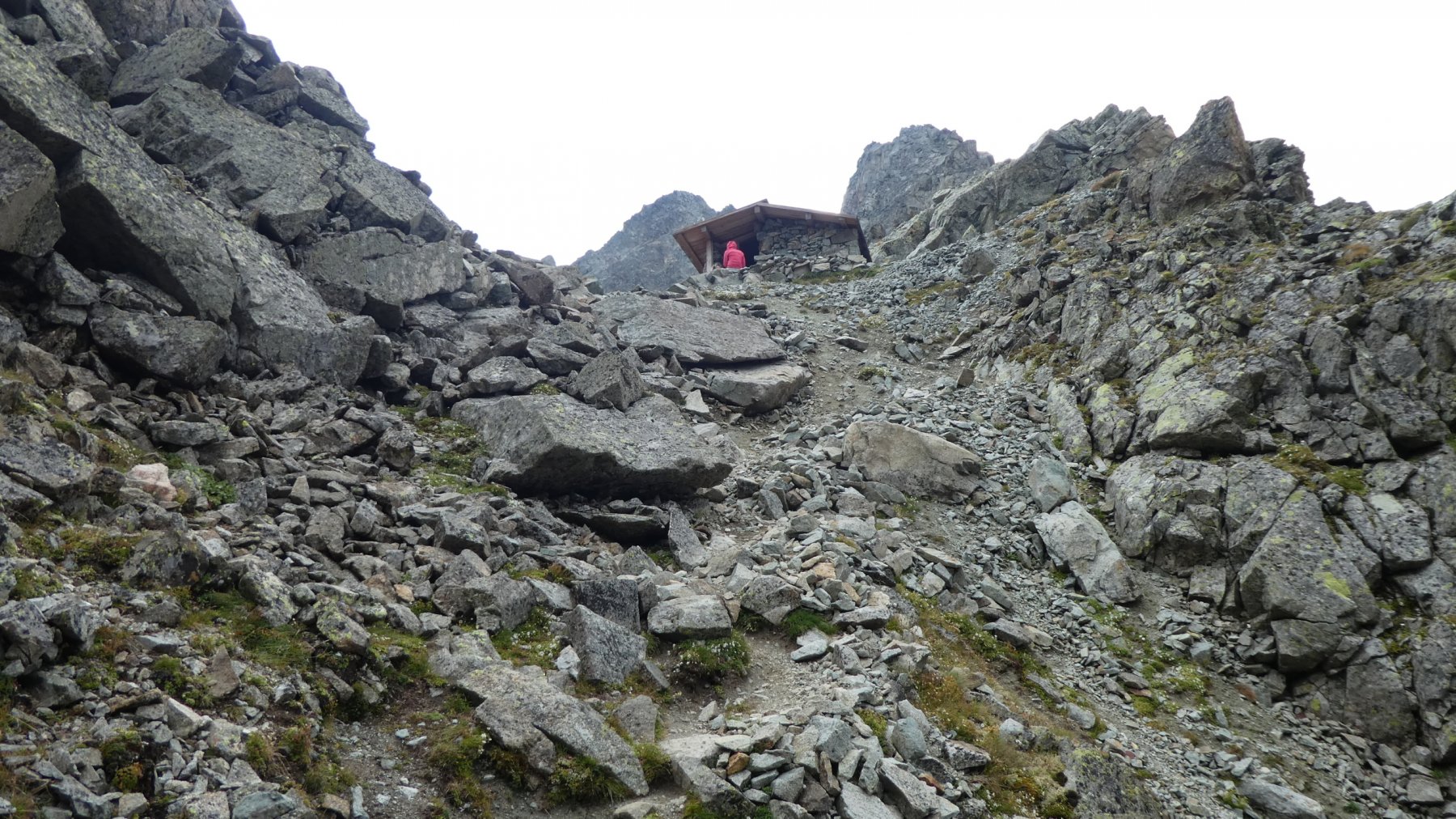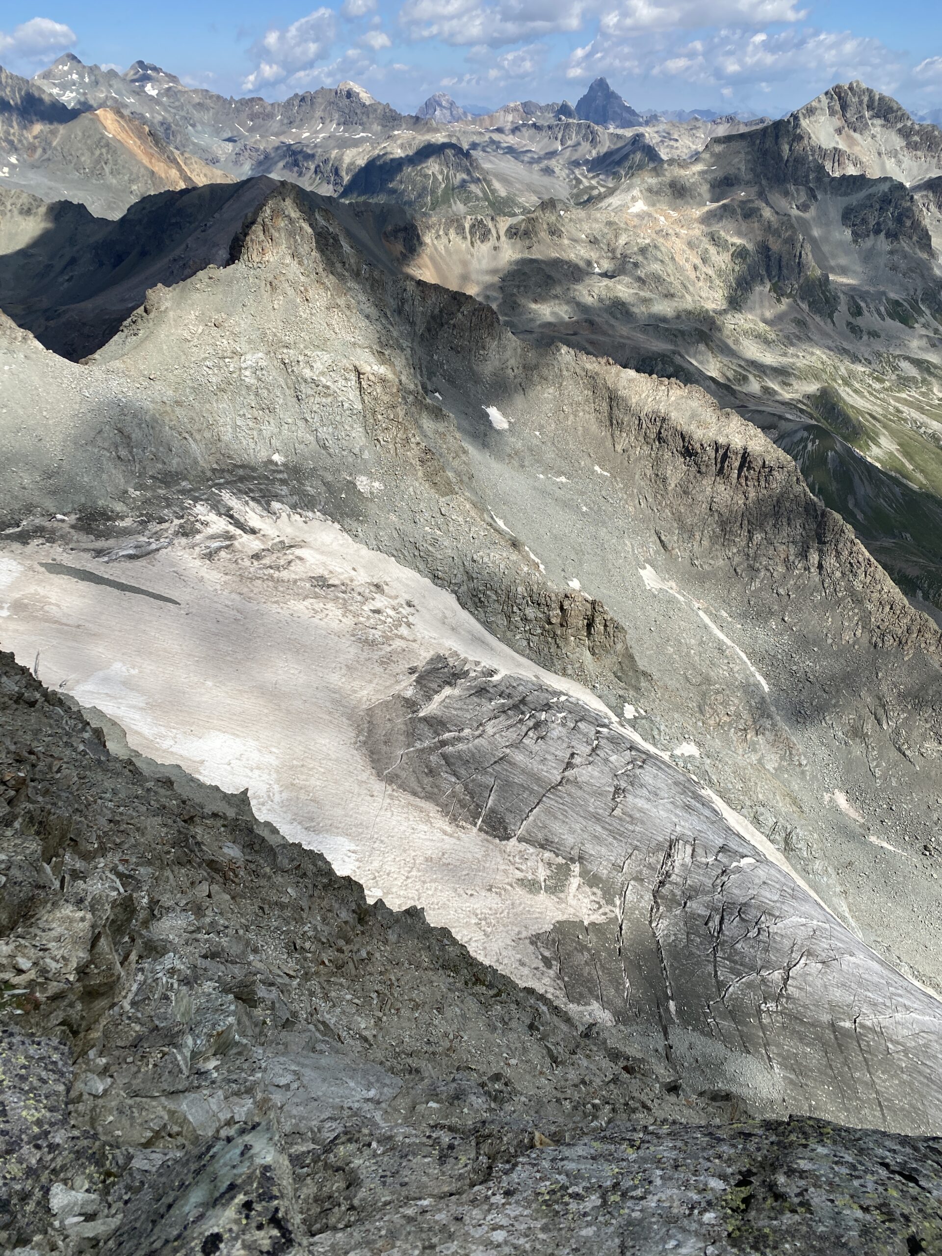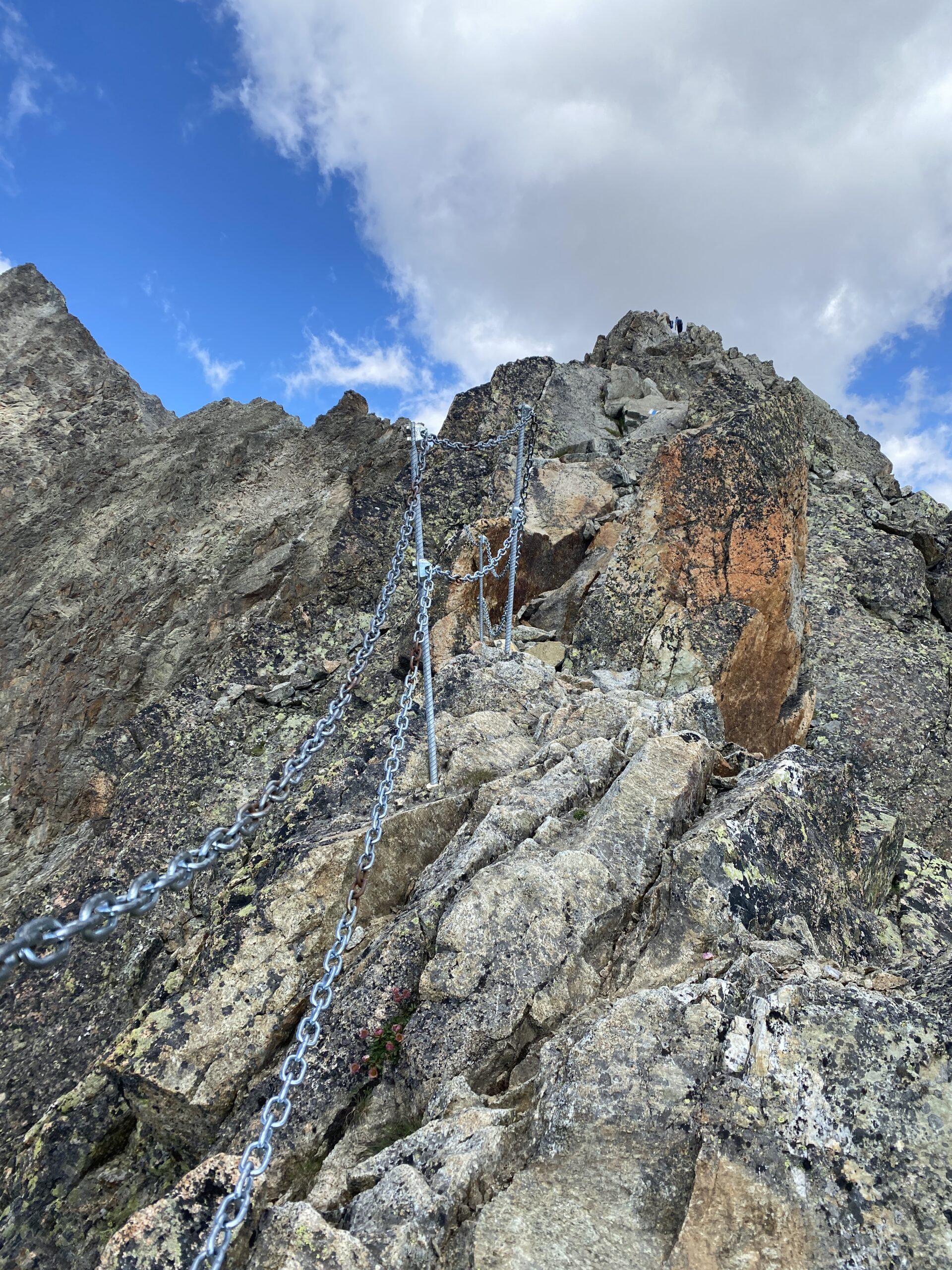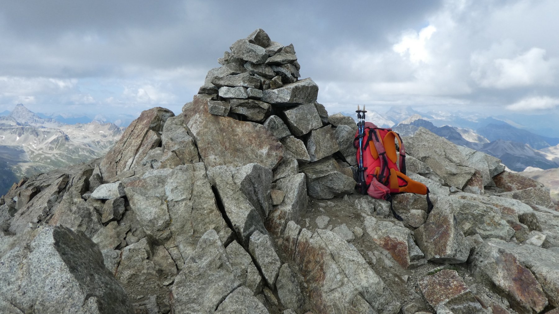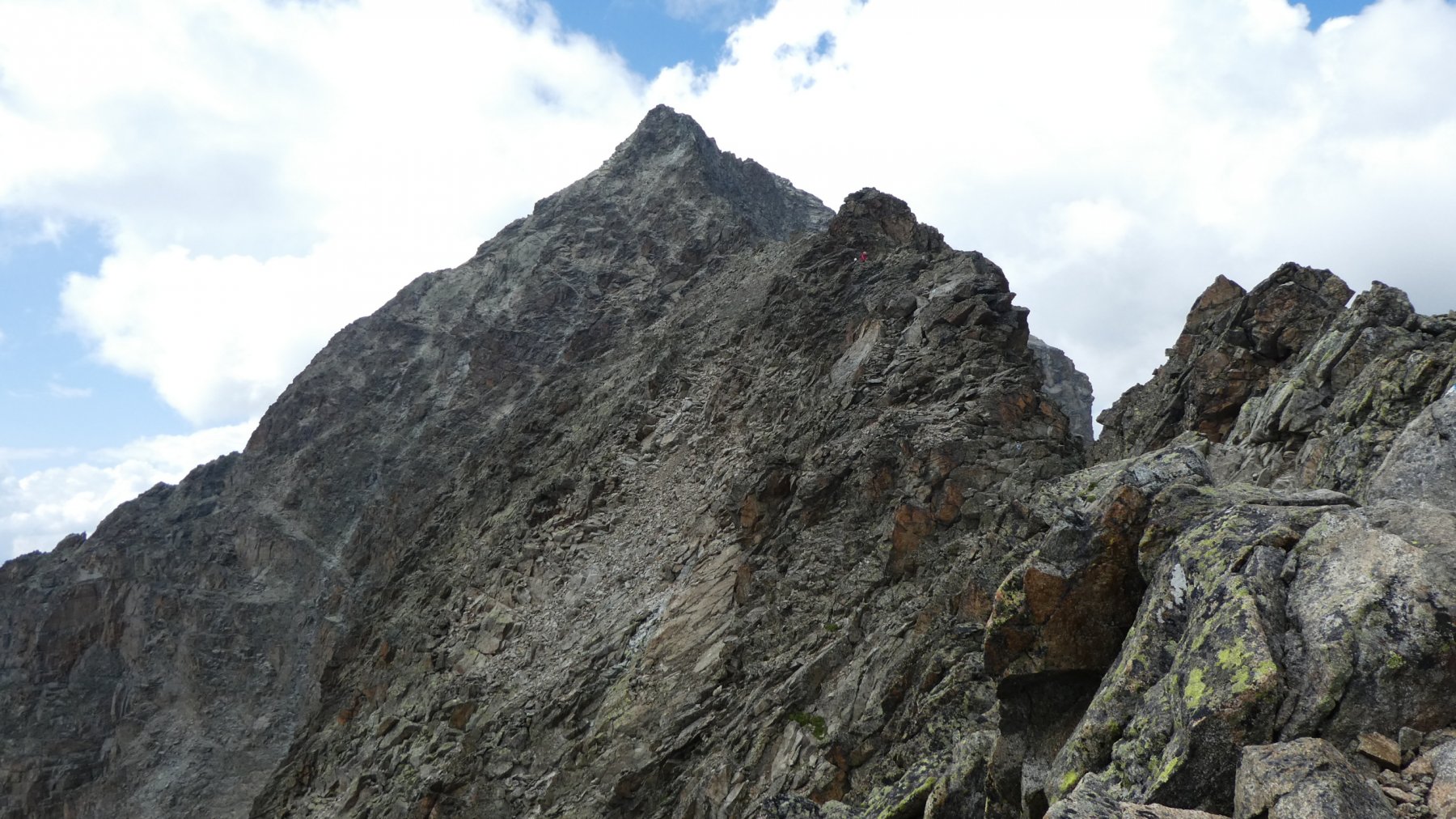 Dal parcheggio nei pressi dell’Alpe Guglia (ma la località è nota anche come Chamanna dal Stradin) si seguono le indicazioni (cartello indicatore per il Piz Jiulier, segnavia bianco-azzurri) e si inizia lungo il sentiero in leggera discesa che porta ad oltrepassare una conca di grossi pietroni per risalire subito dopo, uno ripido dosso erboso prima e detritico poi. Superato il dosso iniziale del vallone, si prosegue verso destra entrando in una vasta conca detritica (nota come Munteratsch), e da qui si supera una ripida rampa morenica a sinistra (sede di un antico ghiacciaio, ormai completamente scomparso) su pietroni di ogni dimensioni e non sempre stabili, con percorso non sempre agevole si raggiunge il culmine della rampa, dove si vede bene la conca terminale ed il colle della Fuorcla Albana che dovremo raggiungere (si può evitare il saliscendi tenendo il centro della conca terminale ed evitando il tratto in salita, evitando di seguire i segnavia e gli ometti presenti). Si scende ora per pietroni e qualche gradino roccioso nel fondo della conca terminale, da dove un sentierino che sale in diagonale verso destra, su terreno più stabile, raggiungendo la Fuorcla Albana m. 2870, dove si trova un piccolo bivacco di emergenza senza nome. Qui arriva anche un altro sentiero, proveniente dall’Alpe Suvretta (Saint Moritz). Si prosegue ora lungo la “Crasta da la Senda”, lungo il sentierino che si tiene a sinistra e qualche metro sotto il filo di cresta, segue poi un traverso a destra che permette di evitare una balza rocciosa, entrando in un ripido canalone detritico, che con percorso ripido e abbastanza diretto, superando alcune facili roccette e un gradone (attrezzato con catene) riporta sul filo di cresta. Si prosegue per un breve tratto lungo la cresta, poi si traversa nuovamente a destra per evitare alcuni torrioni su alcune cenge, segue un altro tratto di cresta, un traverso a sinistra e il primo intaglio (esposto, ma protetto da paletti e catene) e successivamente si incontra il passaggio più impegnativo della salita, una placchetta liscia, inclinata ed esposta (passo di II) ma attrezzata anche in questo caso con catene. Ci si trova ora sotto la Cima Est o anticima, che viene aggirata completamente a sinistra seguendo una lunga cengia quasi pianeggiante, prima facile e poi si restringe, diventando più impegnativa ed aerea (catene), alcuni gradini rocciosi e un tratto aereo lungo il filo di cresta portano al secondo intaglio esposto, anche qui si trovano le catene e i corrimano. Un ultimo tratto di cengette, canalini e qualche gradino roccioso portano al tratto finale di cresta, una traccia di sentiero e alcune facili roccette porta alla cima, indicata semplicemente da un grande ometto di pietre. Attenzione a non smuovere pietre mobili, presenti quasi ovunque, dato che la cima gode di una ottima frequentazione. (ore 4.00 indicative dall’Alpe Guglia alla cima). In discesa si percorre integralmente lo stesso percorso di salita.
