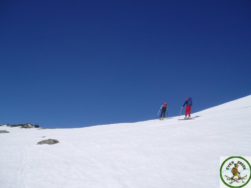 In discesa abbiamo avuto prima neve trasformata ma ancora duretta, complice un leggero venticello freddo, poi bellissimo firn, quindi un pò di marcetta e di nuovo firn, scorrevole anche se non molto veloce la strada. Tuttavia sempre tutto ben sciabile.