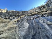 Oltrepassare i piloni dello skilift della rossa e prendere un evidente sentiero sulla sx su prato che porta a una cresta erbosa, panorama verso il basso dei pilasti occidentali.Proseguire in discesa fin a un primo colle vicino alla cima cusio e proseguire in mezza costa (bolli blu) finoa un secondo colle con scritta "climb" su roccia.Andare oltre fino al colle successivo quello delle capre.