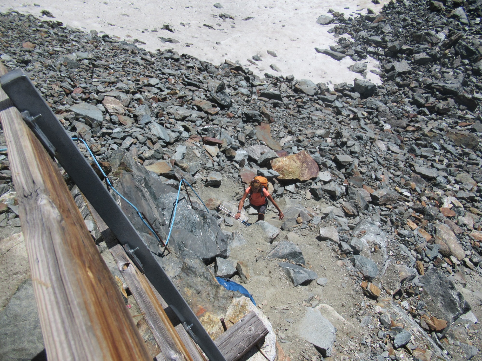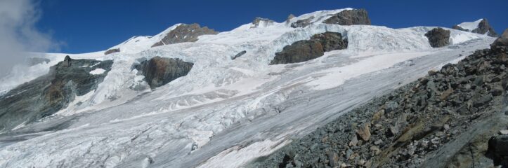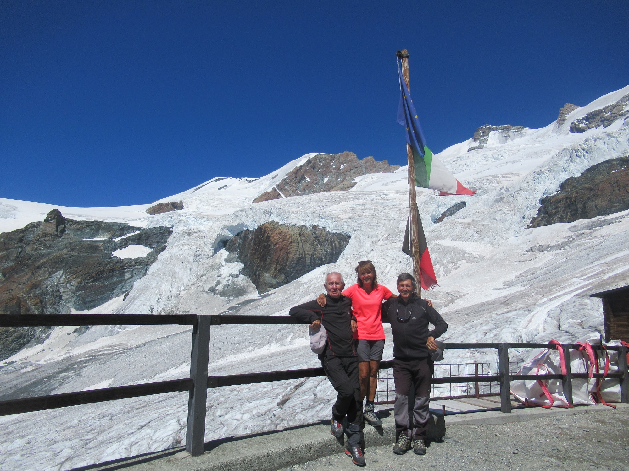 Oggi porto gli amici Sergio e Graziella in questi stupendi luoghi. La giornata è bella, anche se troppo calda, solo qualche nebbia bassa che non da fastidio: il Rosa si mostra in tutta la sua bellezza. Prendiamo la Jeep, che dal parcheggio in località Frachey ci porta fino al Pian di Verra Superiore, per abbreviare il percorso, che comunque è già bello lungo e faticoso. Arriviamo dopo un paio di ore al Rifugio Mezzalama e proseguiamo superando una balza rocciosa. Il sentiero è sempre ben evidente, segnalato con bolli e tanti ometti. Arriviamo sulla lingua terminale del ghiacciaio che attraversiamo senza problemi (in queste condizioni non servono i ramponi). Affrontiamo poi il tratto su ripida pietraia. Qui la situazione è peggiorata rispetto ad anni fa quando ero venuto. La traccia è poco visibile e la pietraia è parecchio instabile anche se non pericolosa. Arriviamo comunque all’ultimo tratto attrezzato con corde e passerelle in legno e finalmente al rifugio. Tantissima gente in giro. Panorama eccezionale! Durante la salita prima del Mezzalama visto un bello stambecco che si è messo in posa per le foto. Ritornati sullo stesso percorso e rientro nuovamente con Jeep. Bellissima escursione e giornata.
