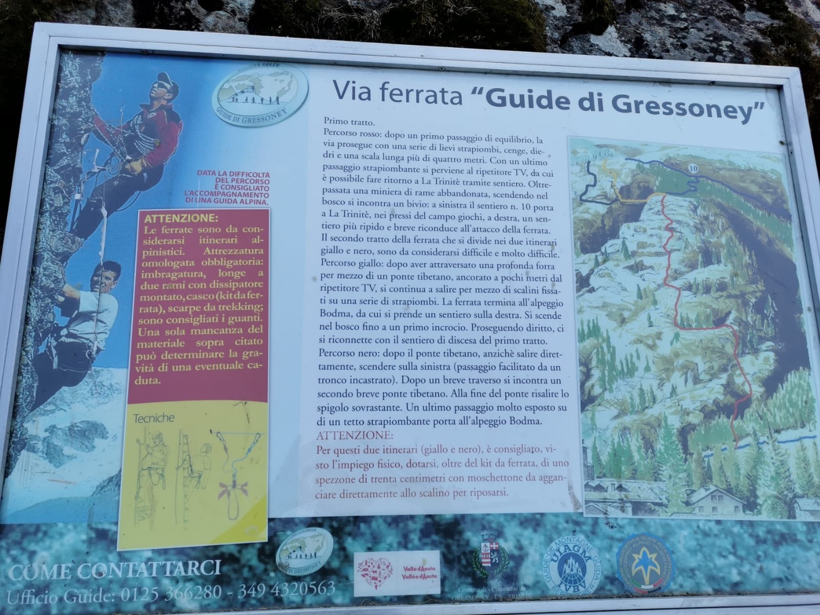 prima parte (tratto rosso) non eccessivamente tecnica, qualche tratto strapiombante ma di facile superamento. seconda parte si può scegliere tratto giallo (serve buon allenamento e forza di braccia per parte in strapiombo non banale) o tratto nero (notevole impegno fisico, tratto super atletico e da non sottovalutare anche per persone ben allenate). Come da cartello di inizio ferrata sono indispensabili i rinvii per sosta in parete, a mio avviso ferrata impossibile da eseguire senza soste nei tratti strapiombanti più lunghi (tratto nero). Tutta la ferrata si presenta in ottime condizioni di manutenzione.