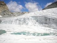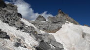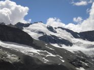 Attaccato il ghiacciaio e raggiunto il plateau sotto la francesetti conviene attraversare alto verso sinistra passando non lontano dalla Corrà, evitando così i pochi crepacci presenti. Oltrepassare una fascia rocciosa e portarsi nel valloncello glaciale sotto il Col du Grand Mean, che si raggiunge in breve per rocce gradinate. Attraversare verso dx sulla parte alta del Gl. du Mulinet e portarsi sotto un evidente canalino (terminale ben chiusa nella parte centrale) che porta al colletto della Gura tra l’Uja e la punta Mezzenile.