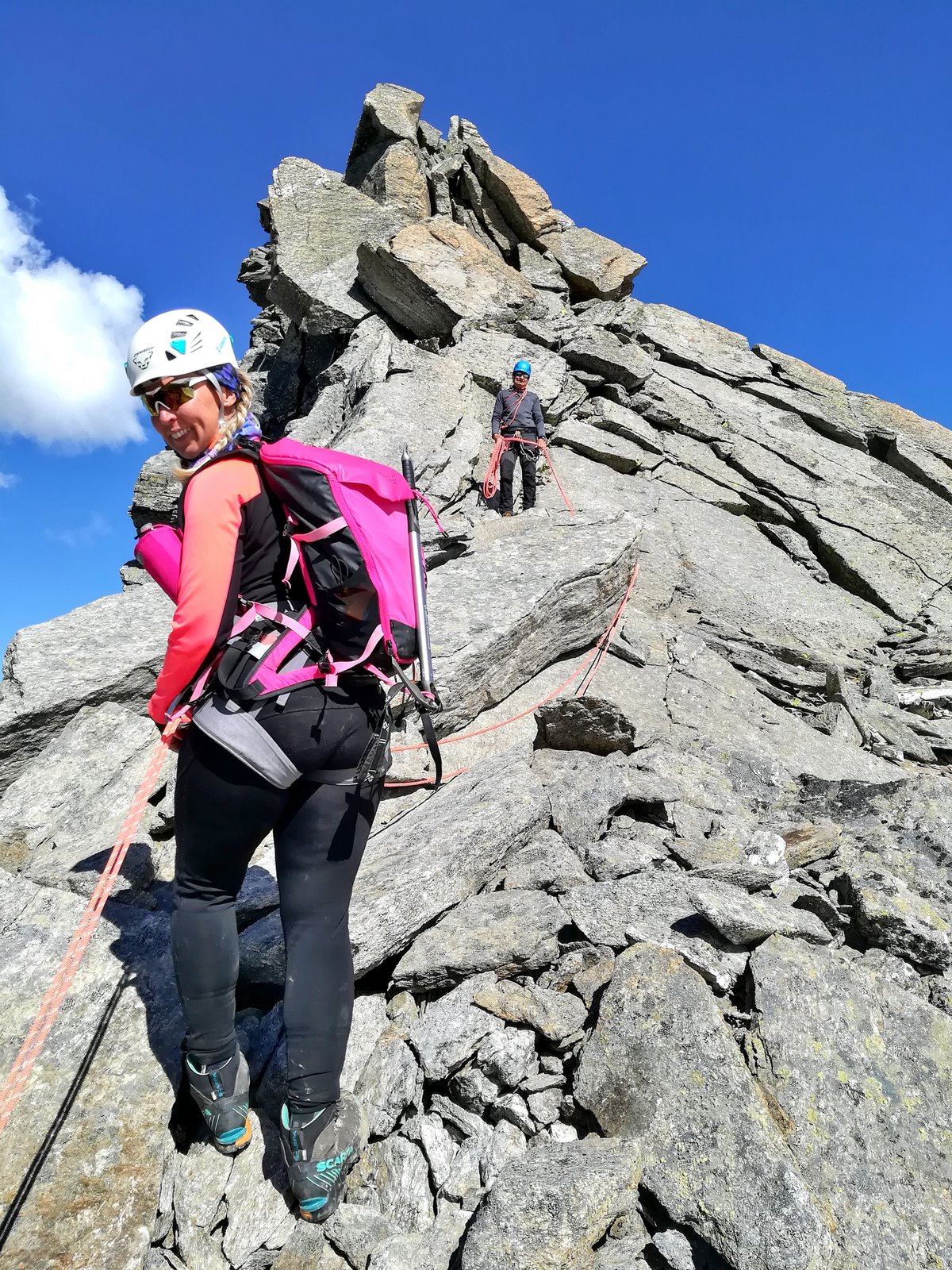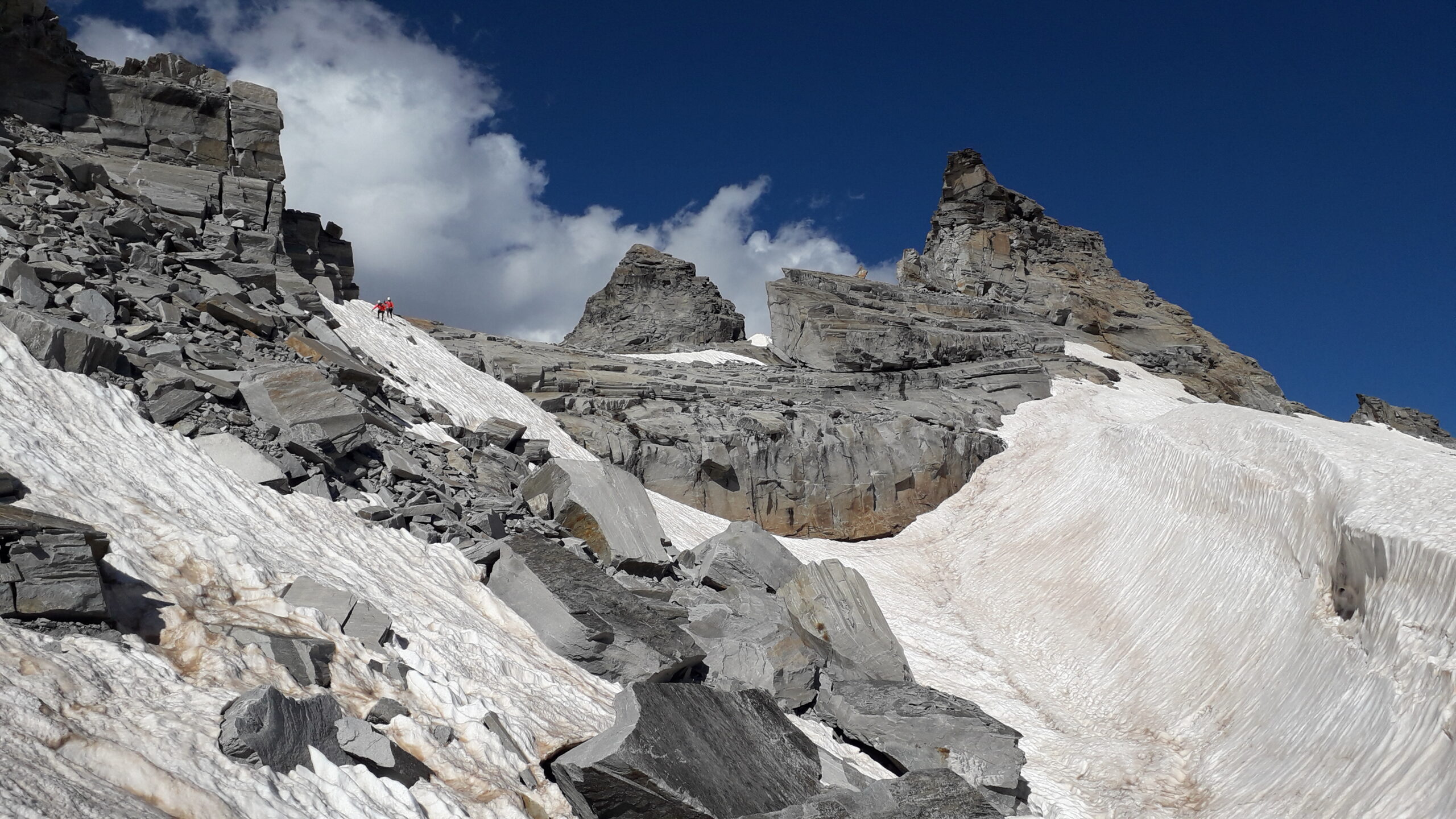 All’uscita dal colle si ha davanti la cresta inizialmente pianeggiante, poi più ripida. I punti più critici si superano sulla dx grazie ad una comoda cengia. Raggiunto invece il castelletto sommitale conviene restare sul filo. Il colpo d’occhio è splendido, essendo nodo orografico tra 2 ghiacciai, e vista la posizione dominante sulla conca di Forno AG. Il Pd è secondo me dovuto alla cresta finale, esposta e dove il II° prevale sul primo. Fino al colletto ci sta un F+.