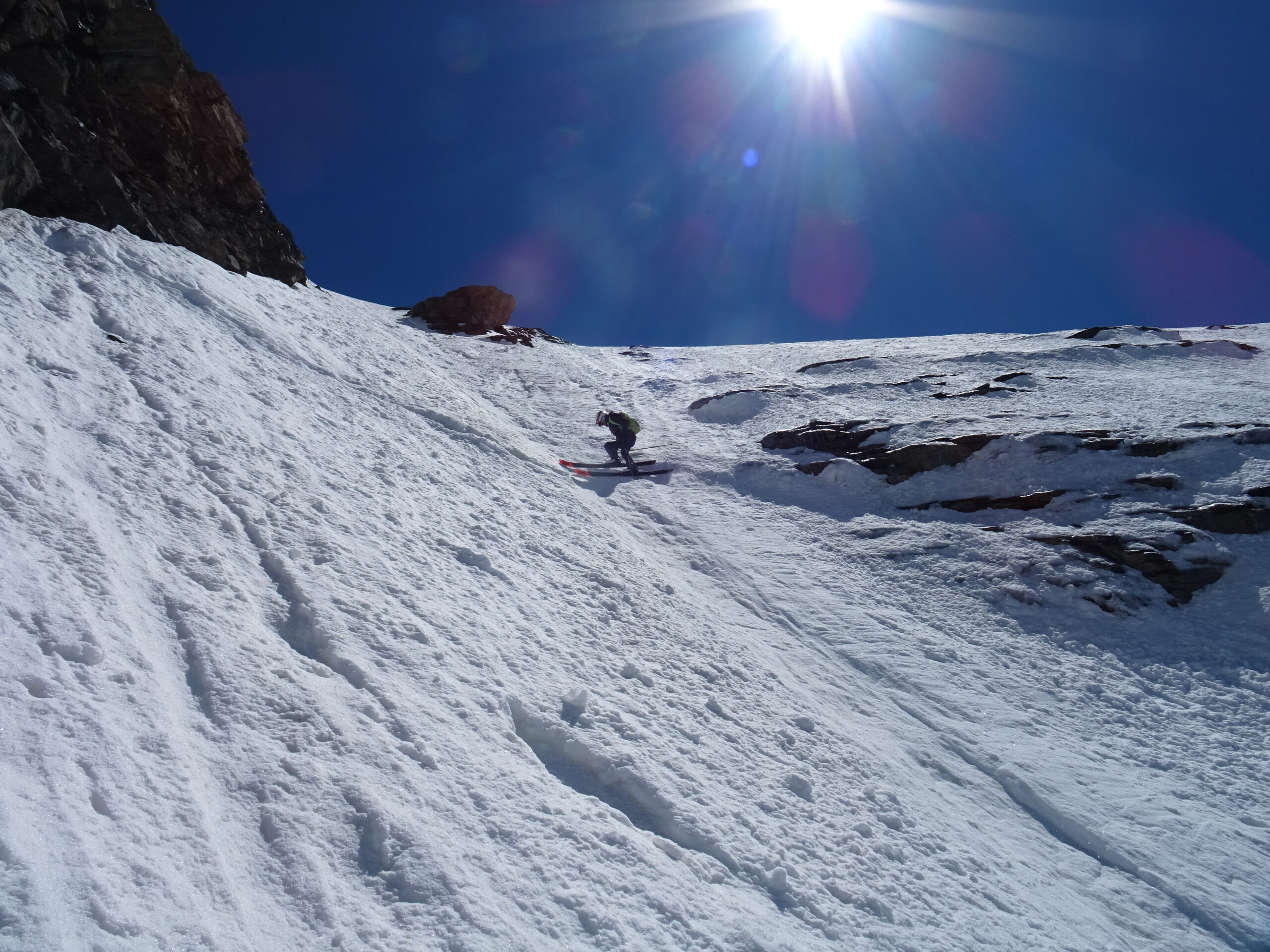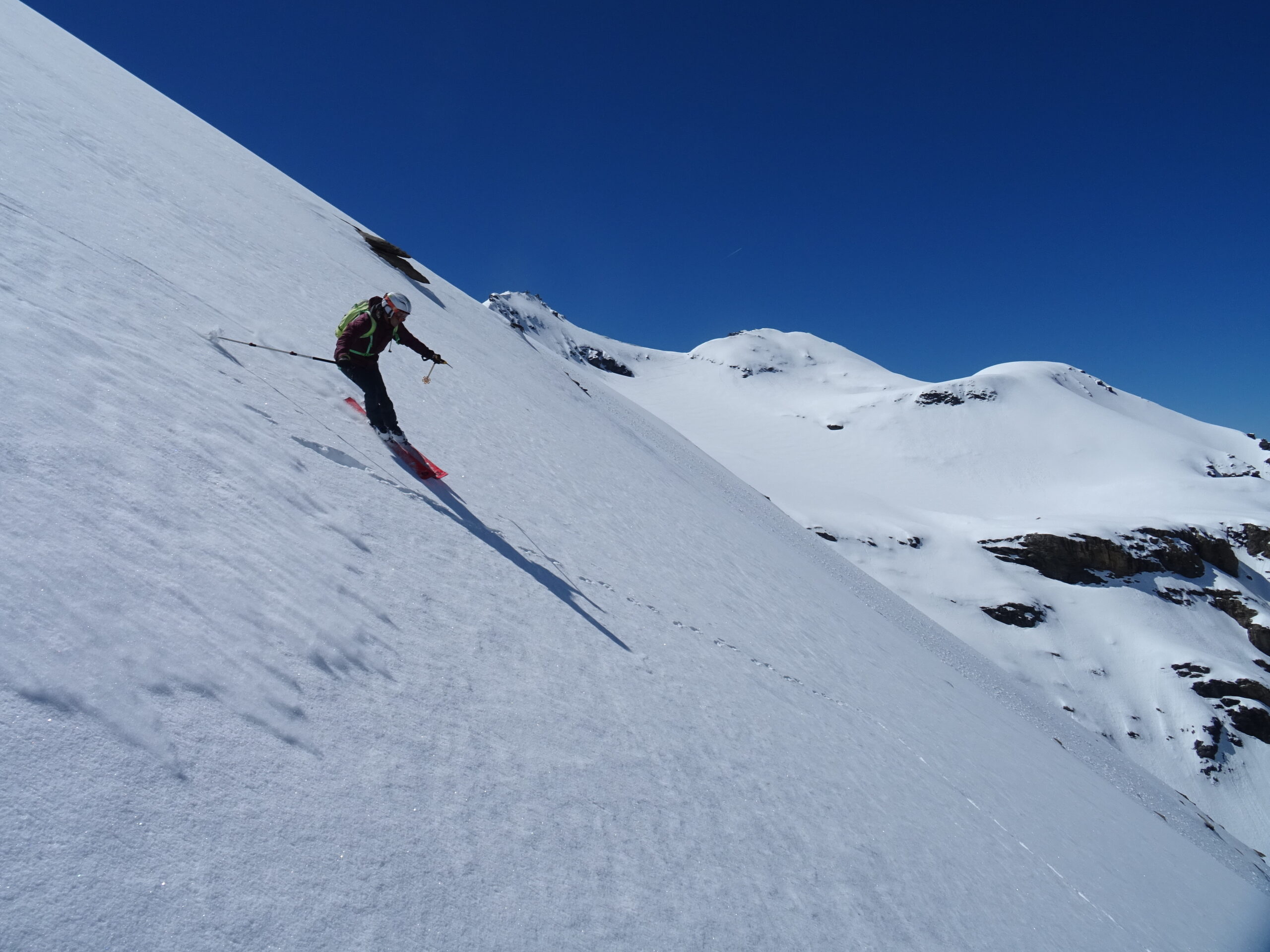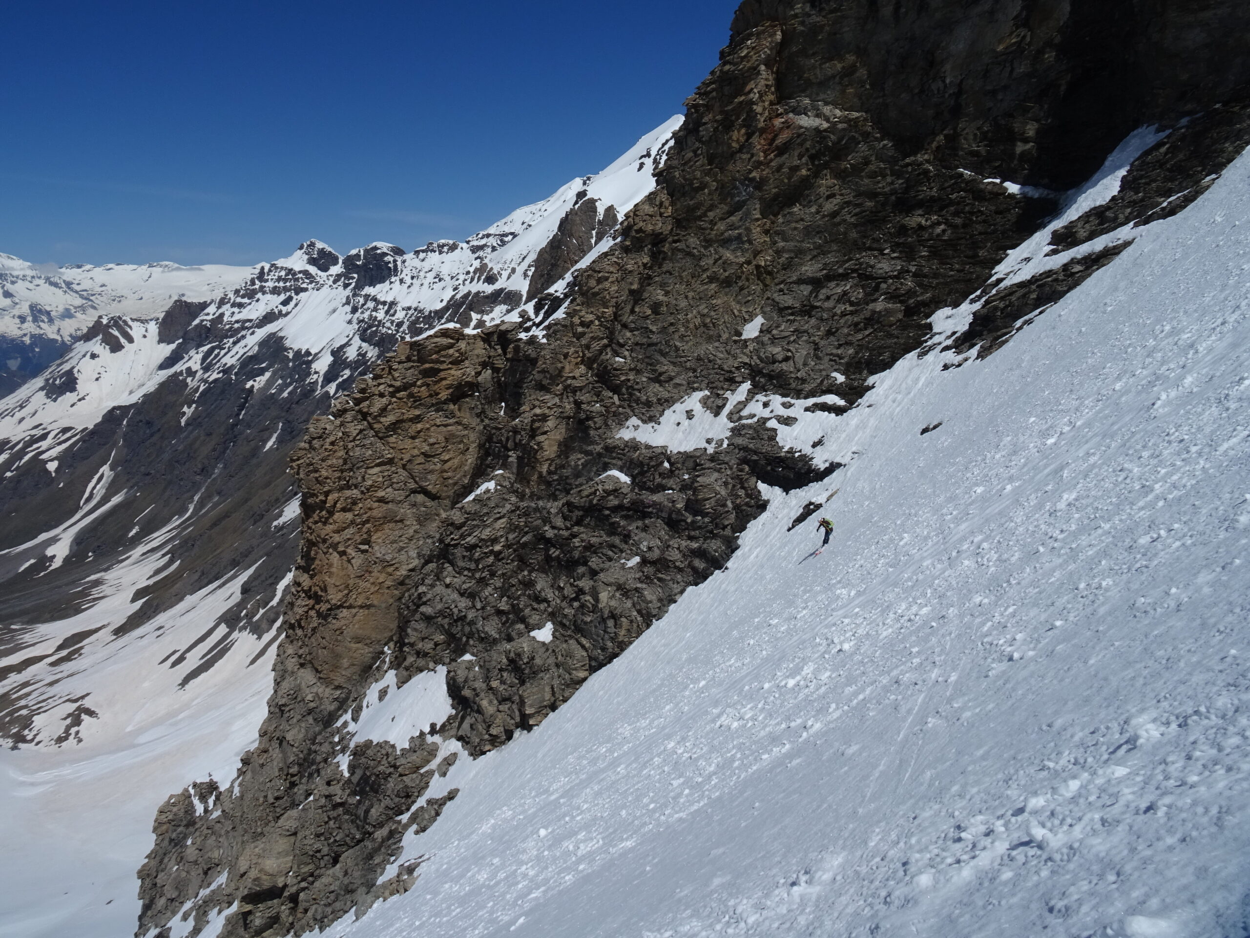Possibile la discesa in boucle. Dalla cima divallare tendendo a dx, la parete acquista pendenza gradualmente. Dopo un inizio sui 40° le pendenze diventano costanti sui 47°. Si scia costantemente esposti sulla barra di rocce basale. Nella parte bassa della parete è necessario portarsi in estrema destra dove si raccorda l’unico passaggio possibile della barra con punte sui 50°. Lunghezza parete 400m circa.