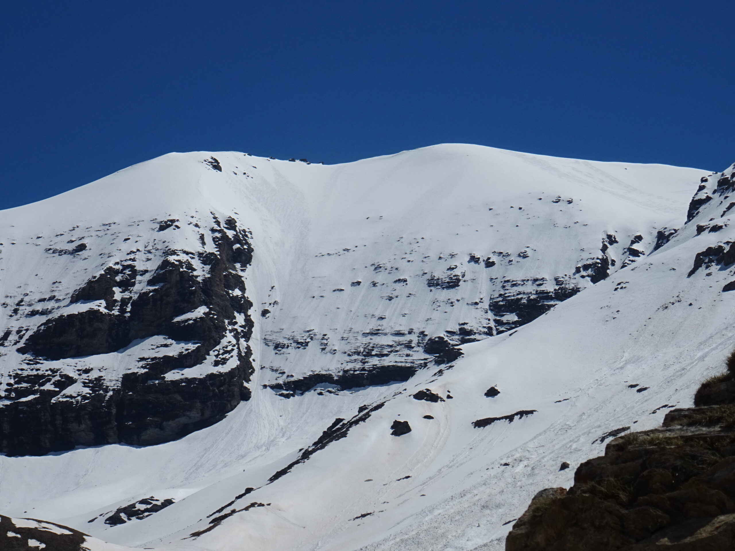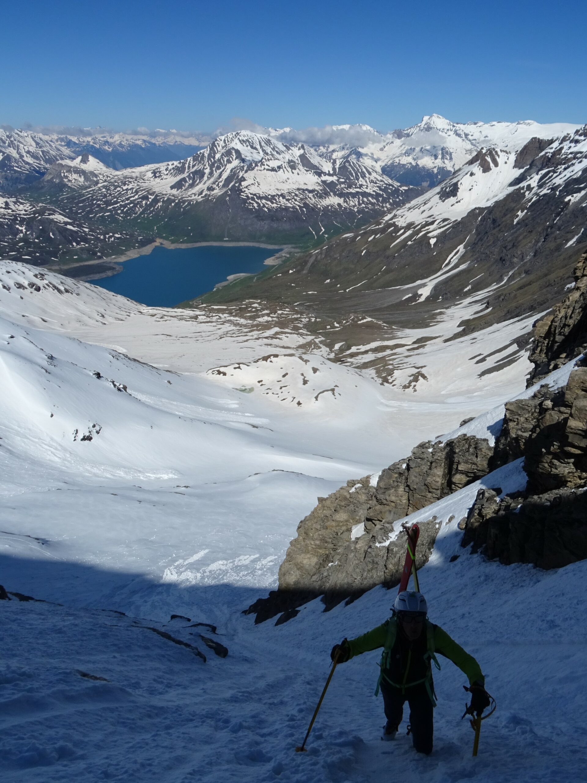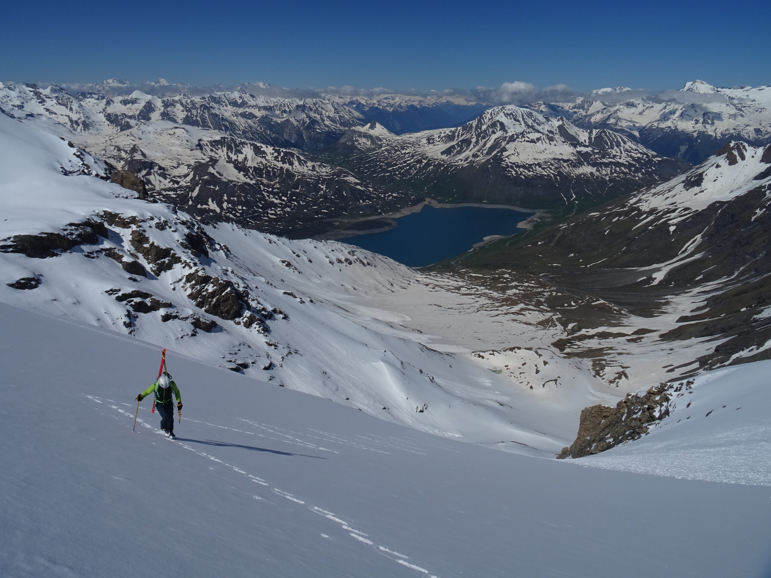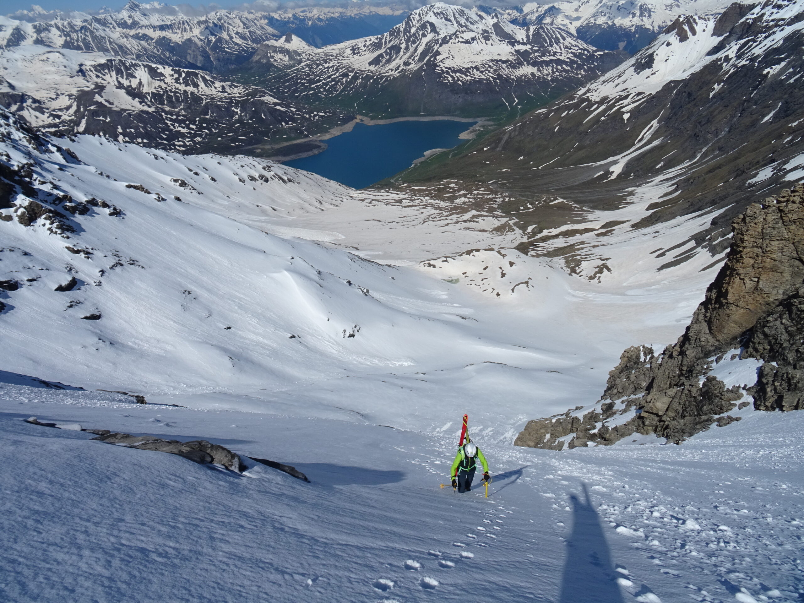 Possibile la discesa in boucle. Dalla cima divallare tendendo a dx, la parete acquista pendenza gradualmente. Dopo un inizio sui 40° le pendenze diventano costanti sui 47°. Si scia costantemente esposti sulla barra di rocce basale. Nella parte bassa della parete è necessario portarsi in estrema destra dove si raccorda l’unico passaggio possibile della barra con punte sui 50°. Lunghezza parete 400m circa.