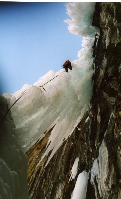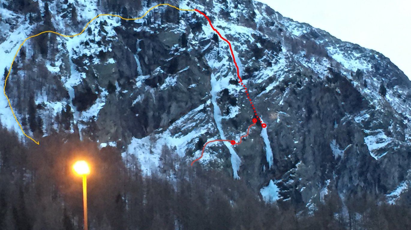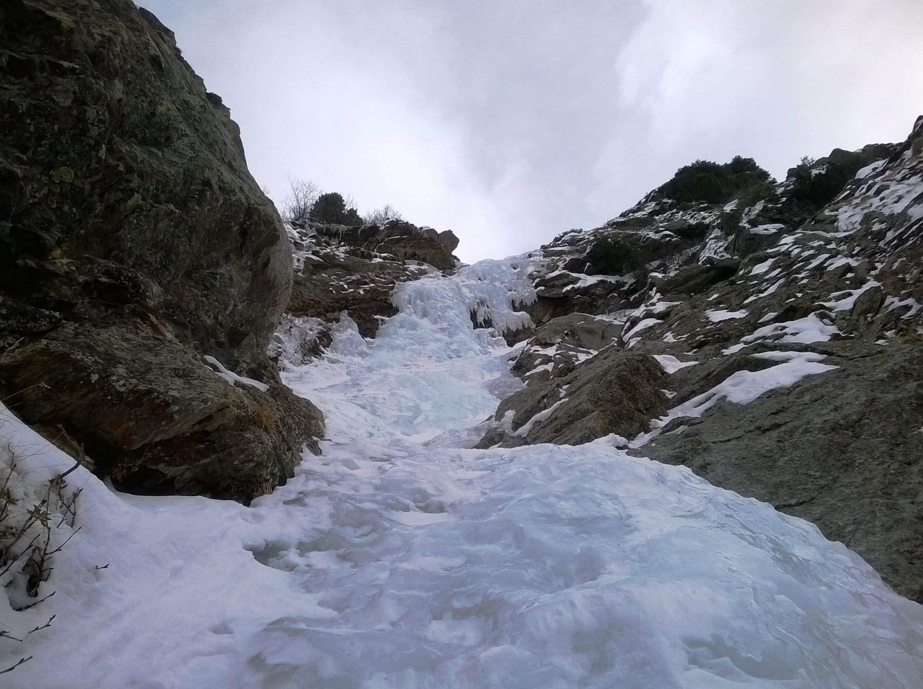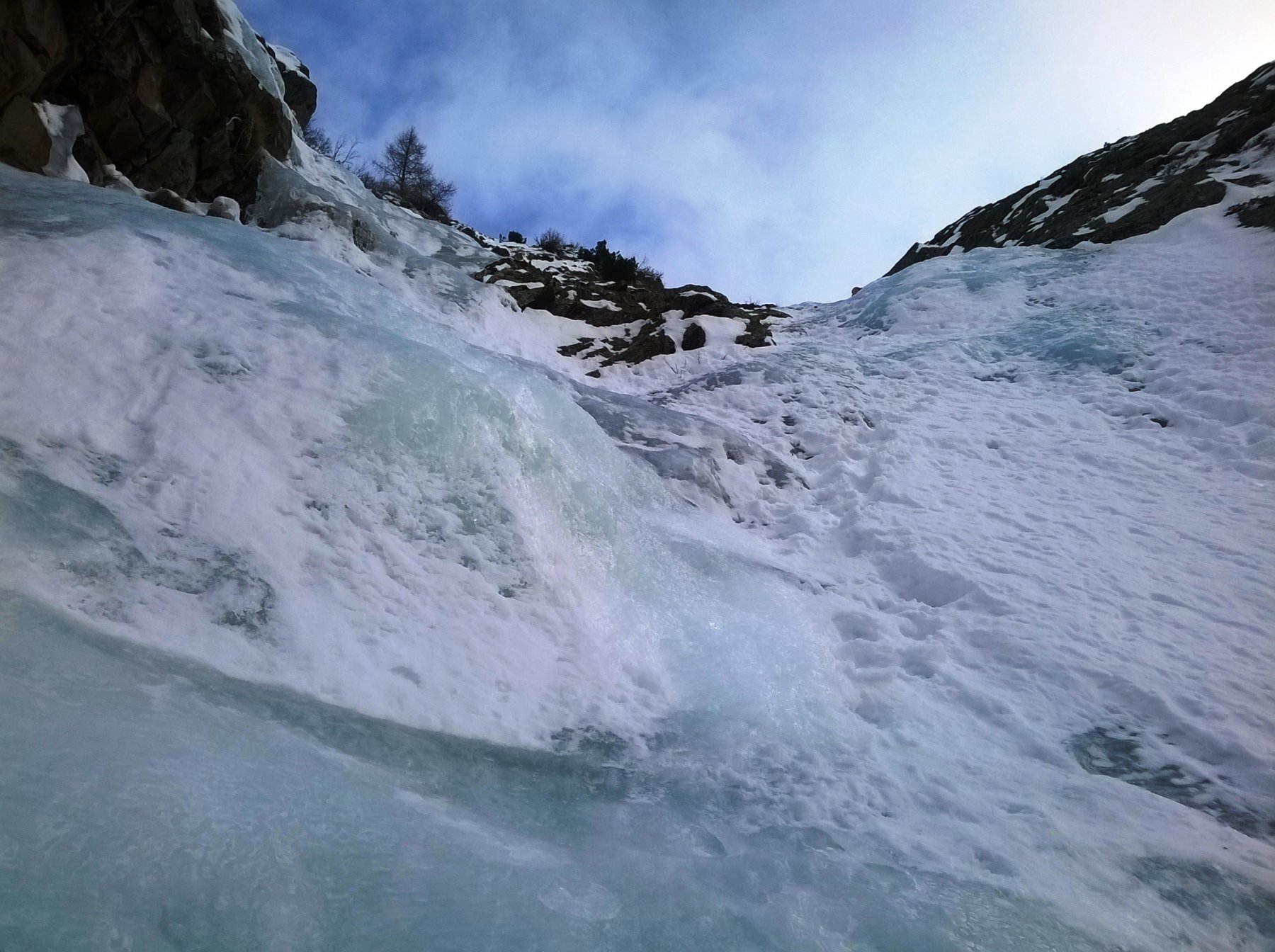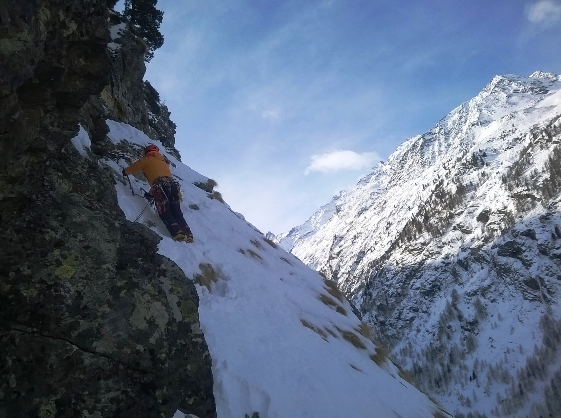 Traversare a destra e superare il canalone di "Pattinaggio artistico" fino alla sosta. Da qui inizia il tiro di collegamento su una delicata rampa, fino a traversare uno spigolo molto esposto (gradato di V e quindi non banale coi ramponi), e risalire alcune rocce fino a una sosta a spit. Su tutto il traverso sono presenti chiodi (alcuni probabilmente originali di Grassi), ma è utile integrare con qualche nut e friend. Dalla sosta calarsi in doppia per una ventina di metri e portarsi all'attacco della cascata dove si può sostare su un tronco rovesciato.