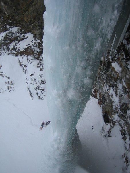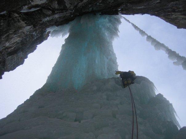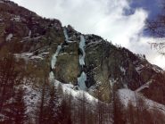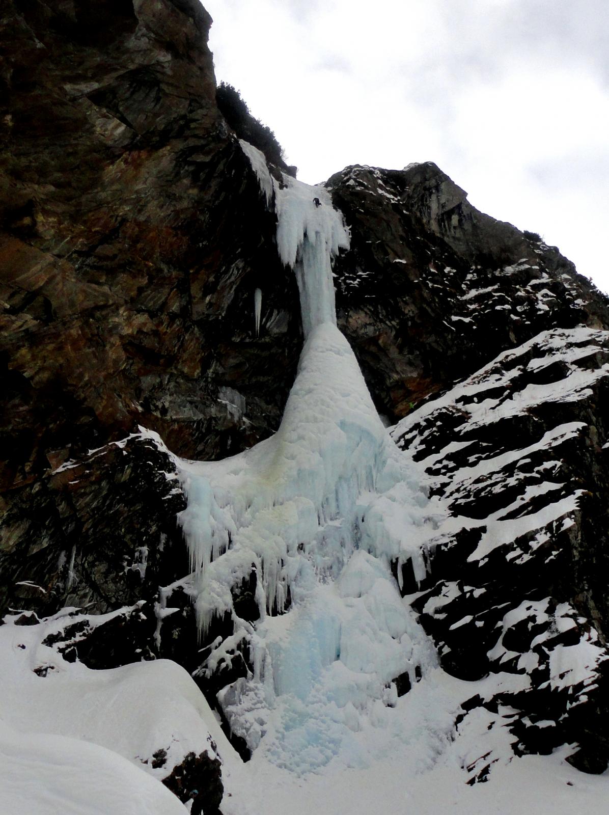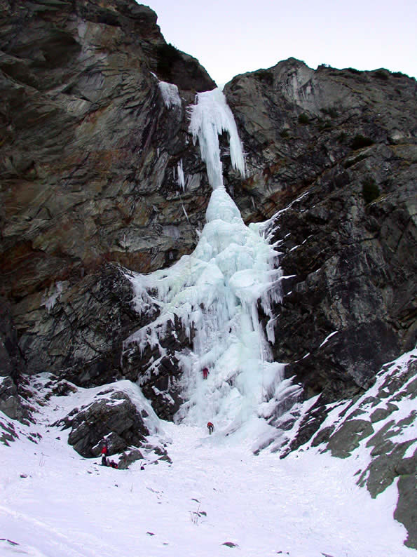 Dopodiché le difficoltà diminuiscono, si risale un canalone di neve con un ultimo saltino di 2 grado. Salire ancora ed uscire su roccette sulla sinistra (a meno di non voler scendere con Abalakov, ma allora conviene scendere dopo il terzo tiro). Traversare nel bosco perdendo progressivamente quota fino ad immettersi nel canalone che riporta all’attacco di “Tutto relativo”. Attenzione a non tenersi troppo alti, o si rischia di finire su un ripido pendio su placca innevata che termina all’uscita di un altra cascata più a valle. In tal caso si possono fare due doppie da alberi fino a reperire una una sosta a chiodi (da ribattere perchè poco utilizzata, essendo sopra un un candelone che si forma raramente – quindi sosta pericolosa). Di qui un’ultima doppia porta alla base della cascata e in 10min si ritorna al punto di partenza.