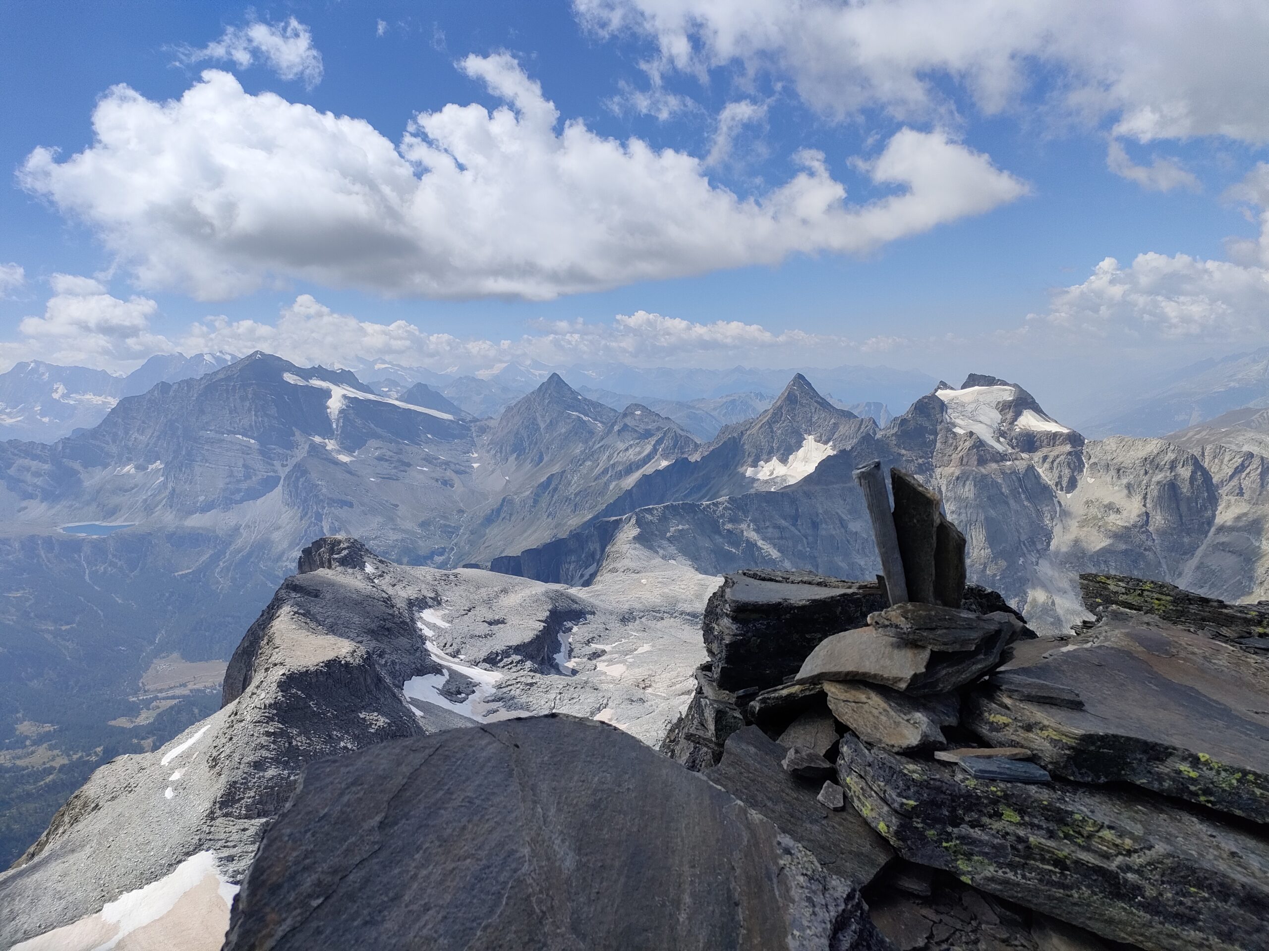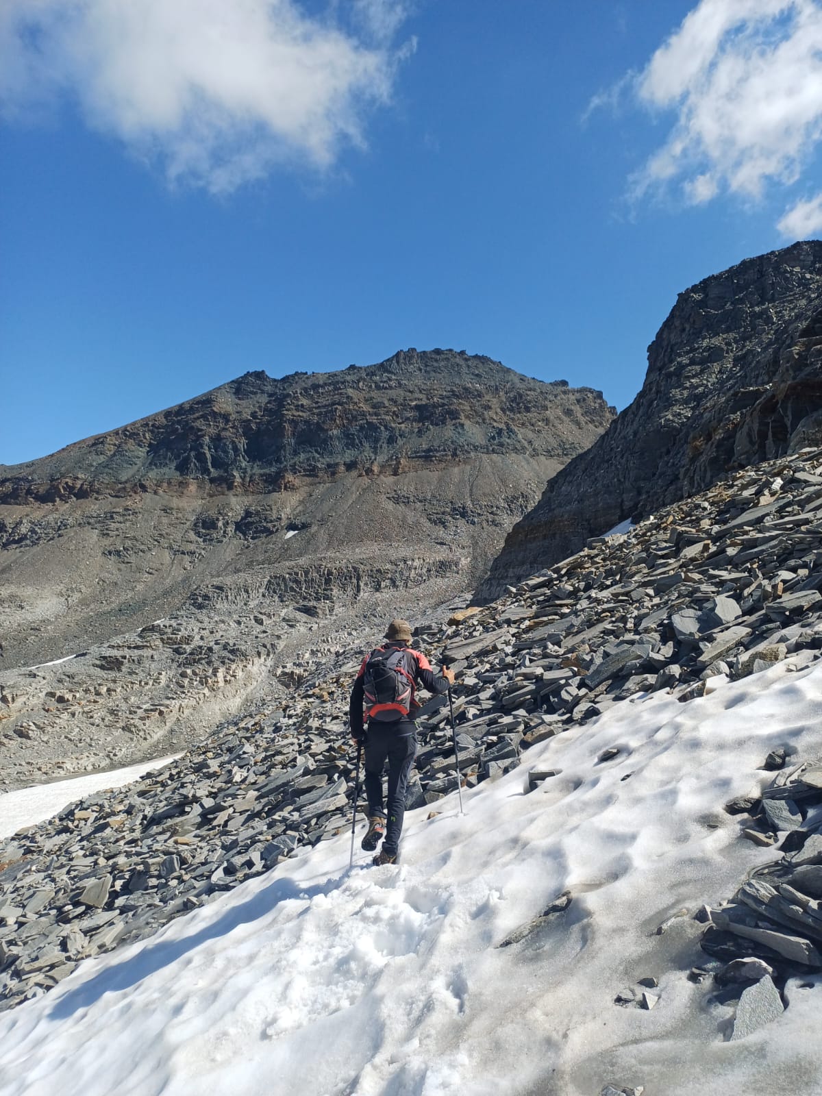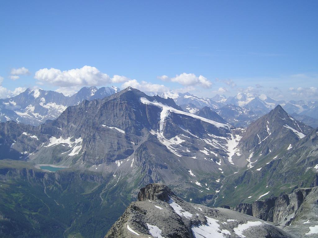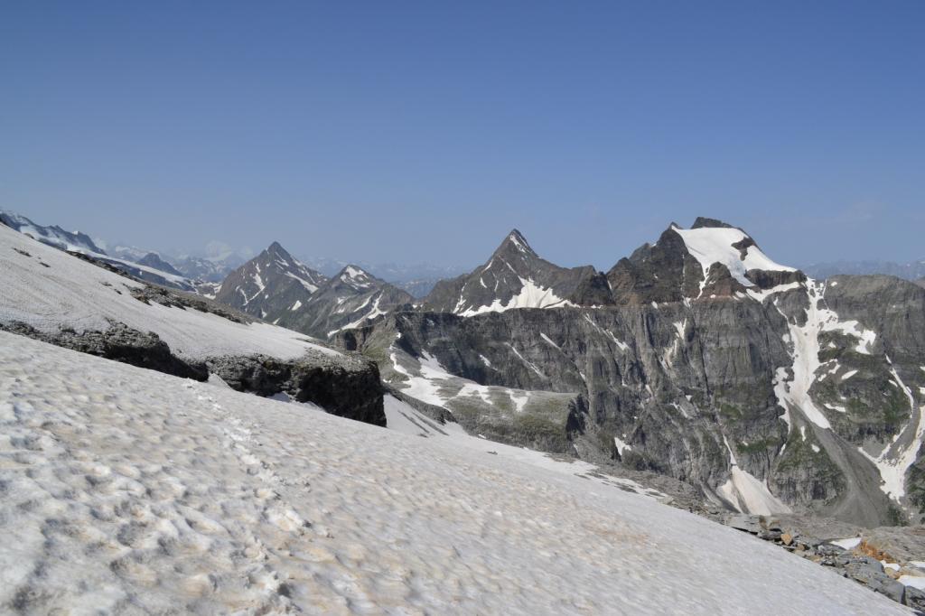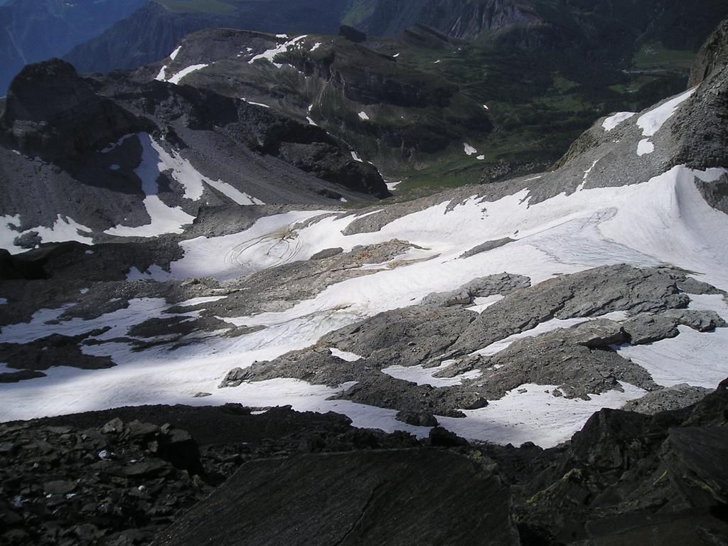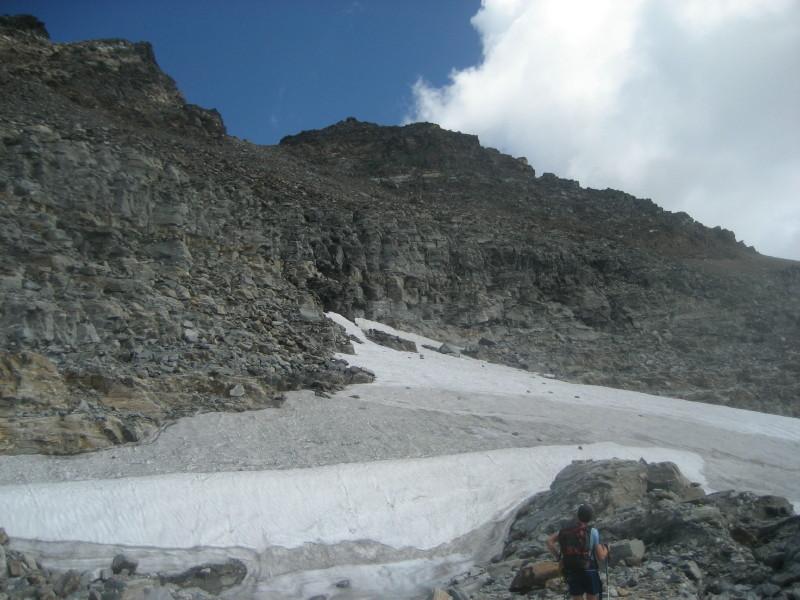 Lo si risale verso ENE passando sotto la costiera della Cima Delle Piodelle, evitando qualche crepaccetto. In vista della grande sella glaciale 3032 m, elevandosi sul pendio nevoso e sugli sfasciumi si raggiunge la cresta SE poco prima della vetta.