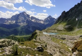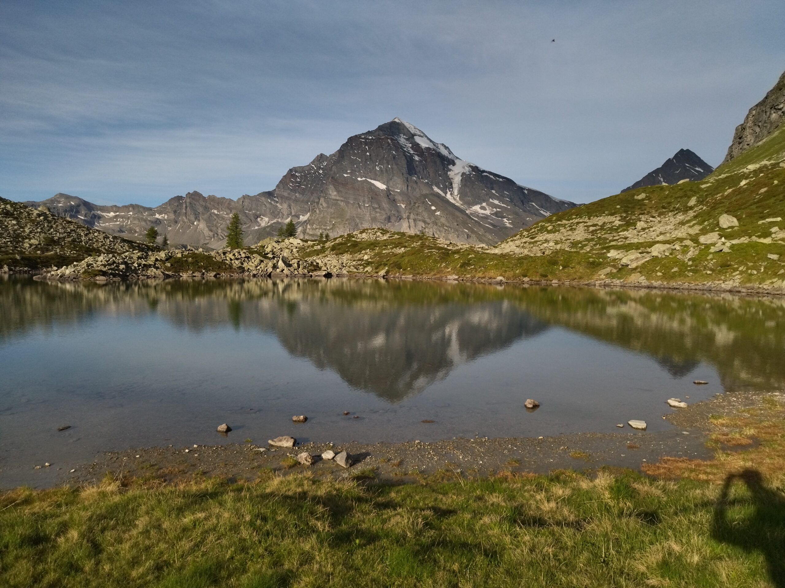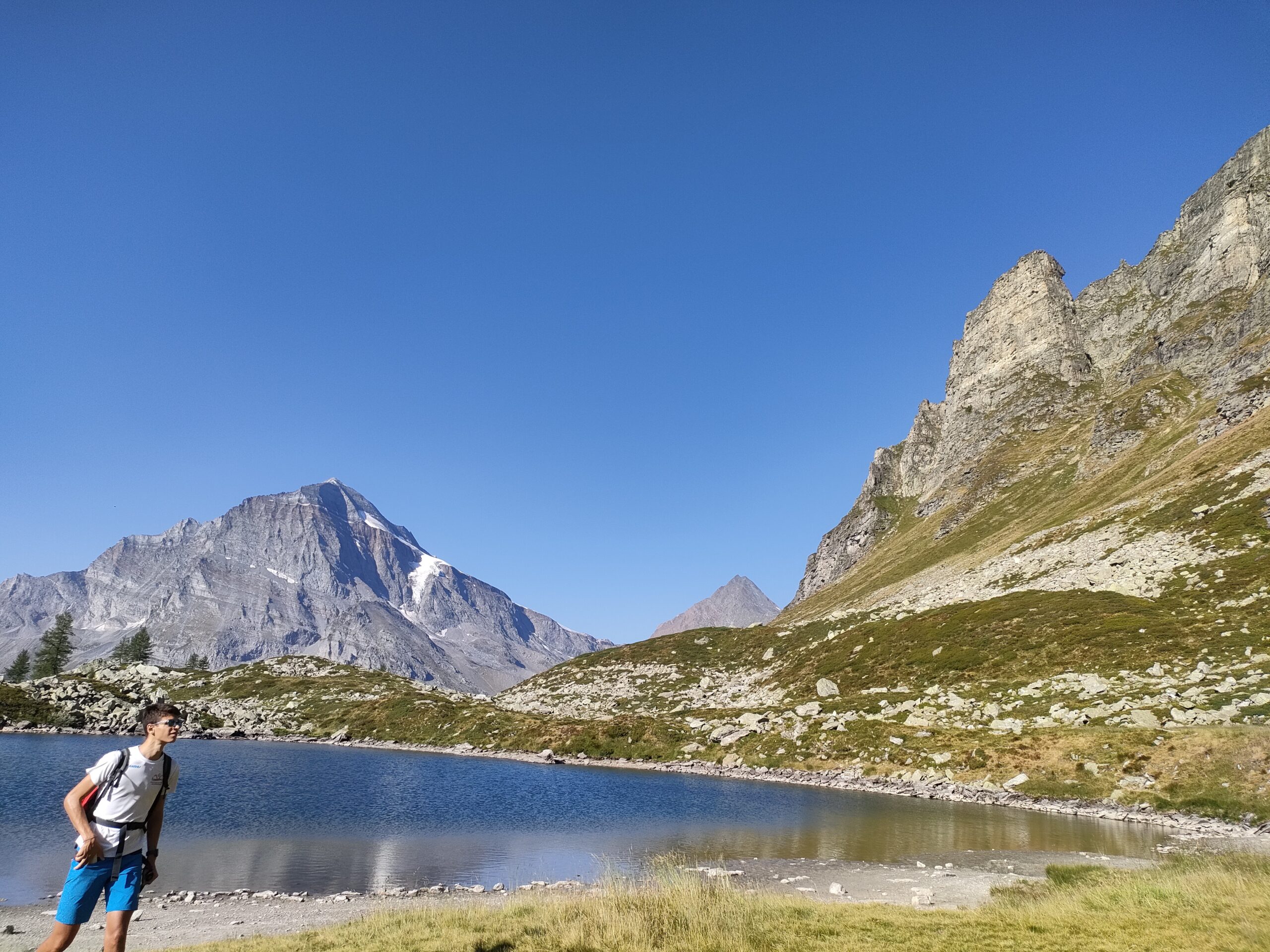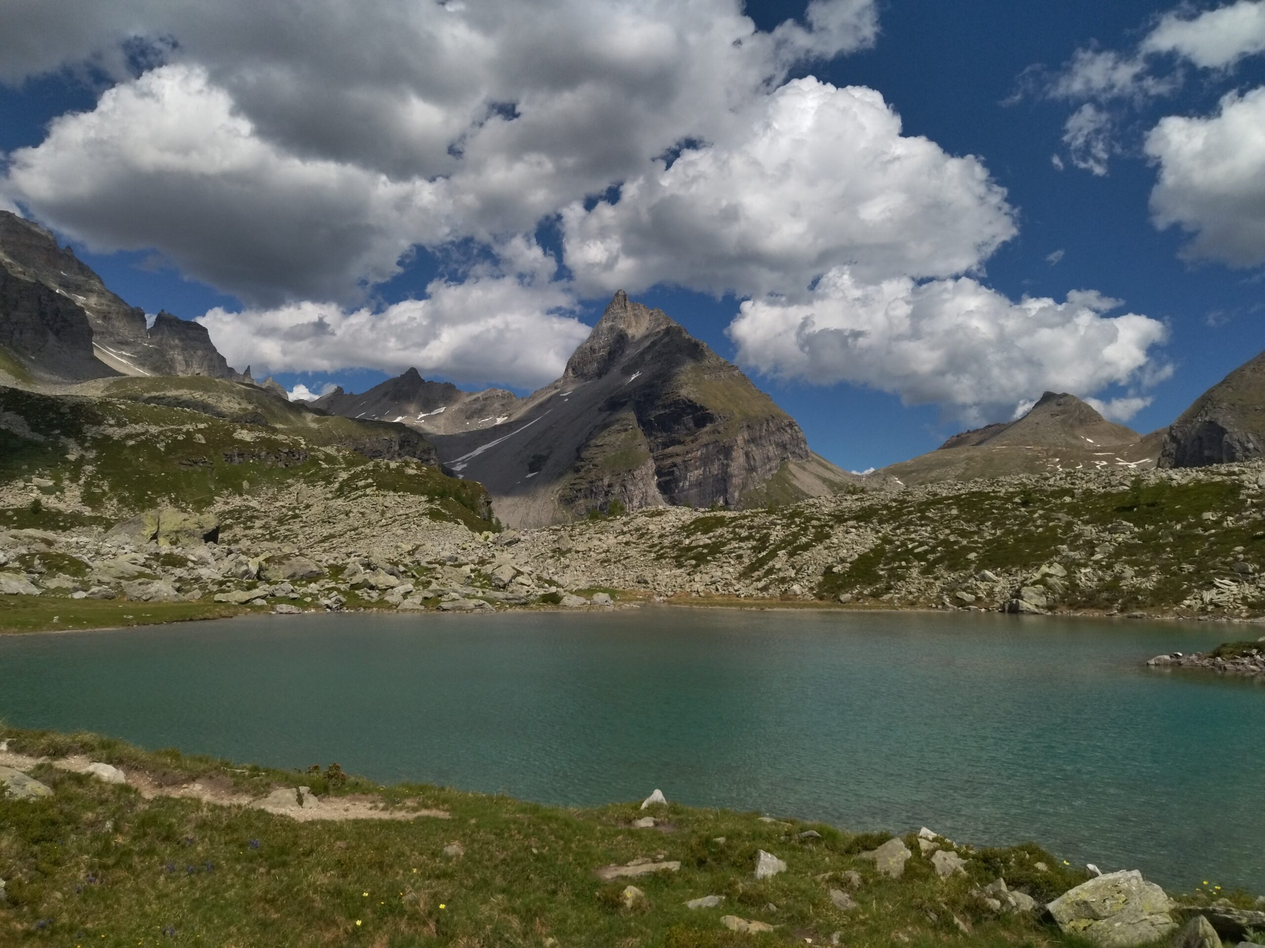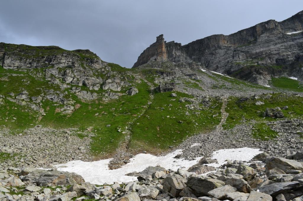 Aggirarlo, tenendosi bassi sulla riva sud-orientale. Attraversato il letto sabbioso si risale per tracce un pendio erboso per giungere al Pian D’Erbioi a circa 2260 m. Piegare subito verso N e, attraversata una zona a blocchi, puntare dritti sul ripido pendio erboso dominato dalla gialla Torre Vitali.