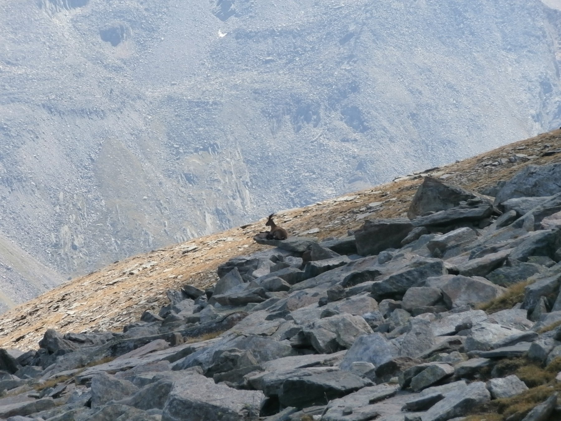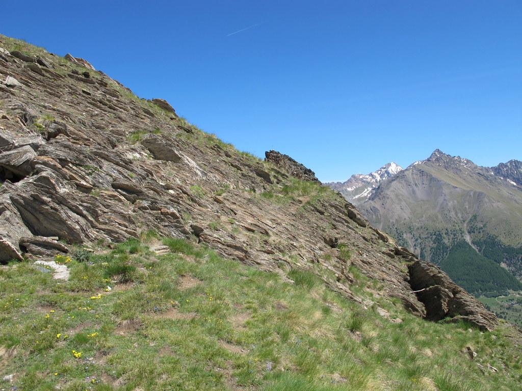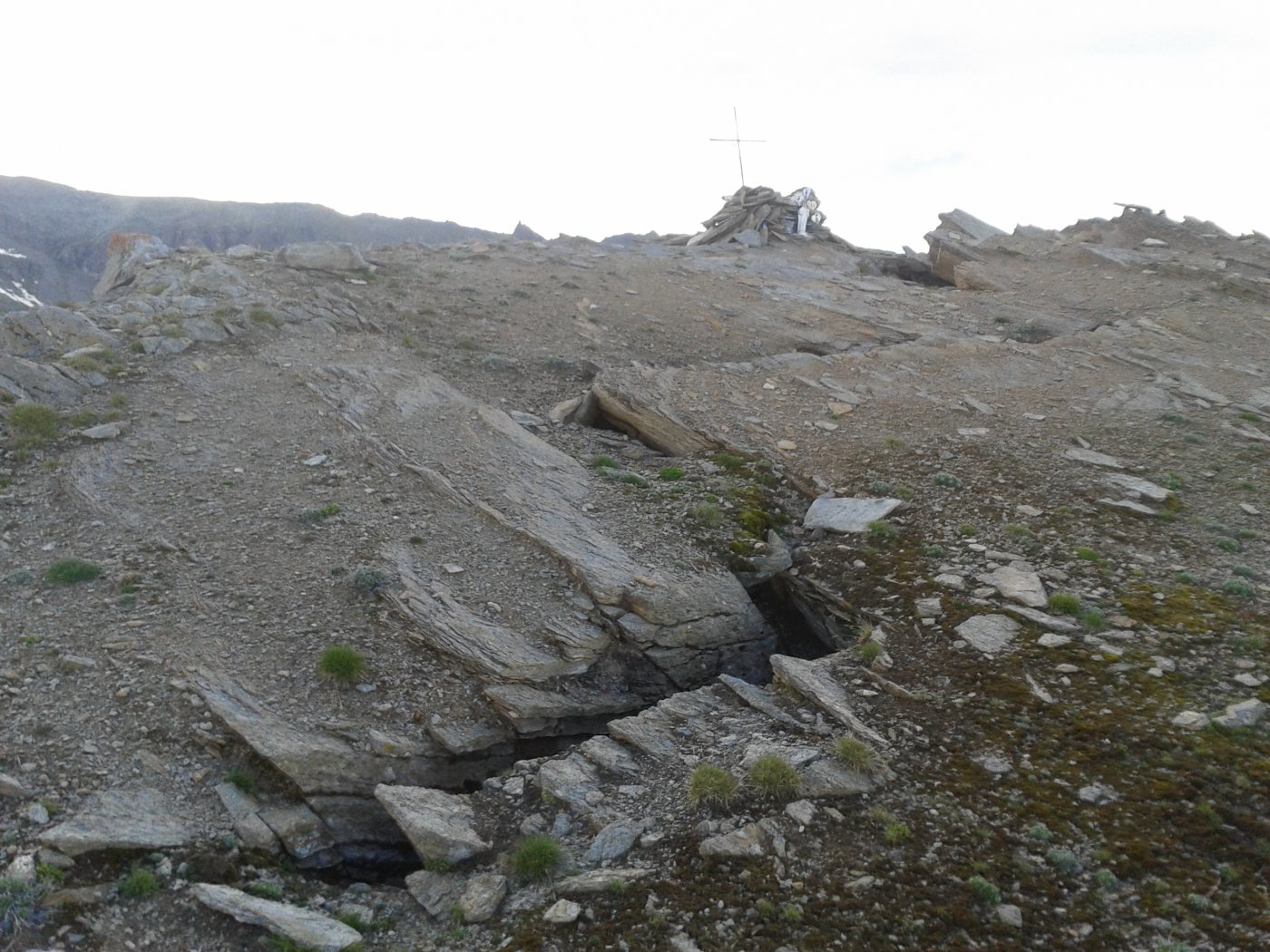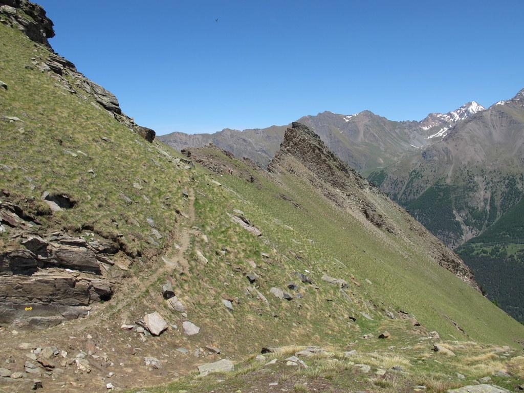 si volge quindi a sx, attraversando il vallone, e con leggera ascesa ci si porta sul ripido pendio a dx del dirupato versante nord dell’ouillè. con ottimo sentiero e numerose svolte si raggiunge un panoramico colletto a quota 2480 m. volgendo a sx, per tracce di sentiero, si sale alla vetta dell’ouille 2521 m (cautela, tratti esposti).