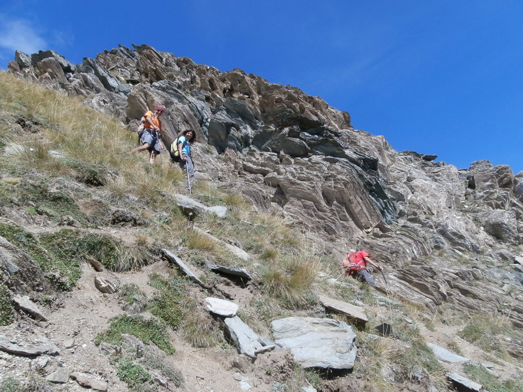 si può salire per tracce e roccette sul lato est, oppure per un canalino erboso (molto ripido) tra l’anticima e la vetta e poi per roccette. attenzione al versante del pousset che precipita verticalmente. ridiscesi al colletto, si prosegue per circa 2-300 m sul sentiero che porta al vittorio sella, per poi abbandonarlo e risalire per gli erti pascoli senza via obbligata (tracce di sentiero), in direzione del grosso ometto posto sotto la vetta, che si raggiunge per ultimi pendii detritici a 3004 m. panorama splendido.