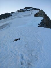 Ghiacciaio delle Grandes Murailles in buone condizioni, pochi piccoli crepacci, ma a causa del caldo niente rigelo.