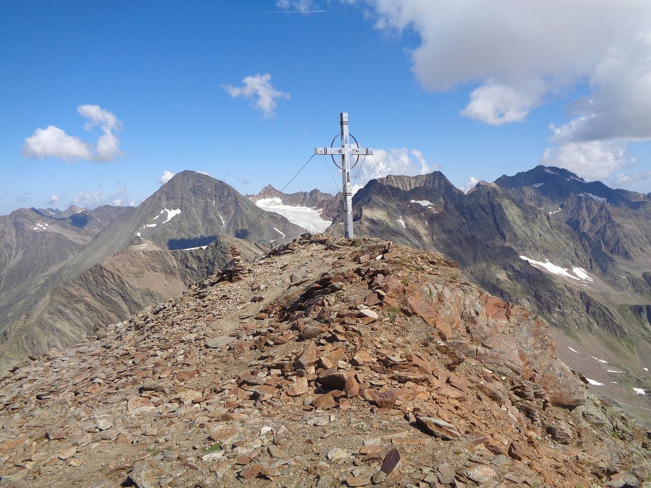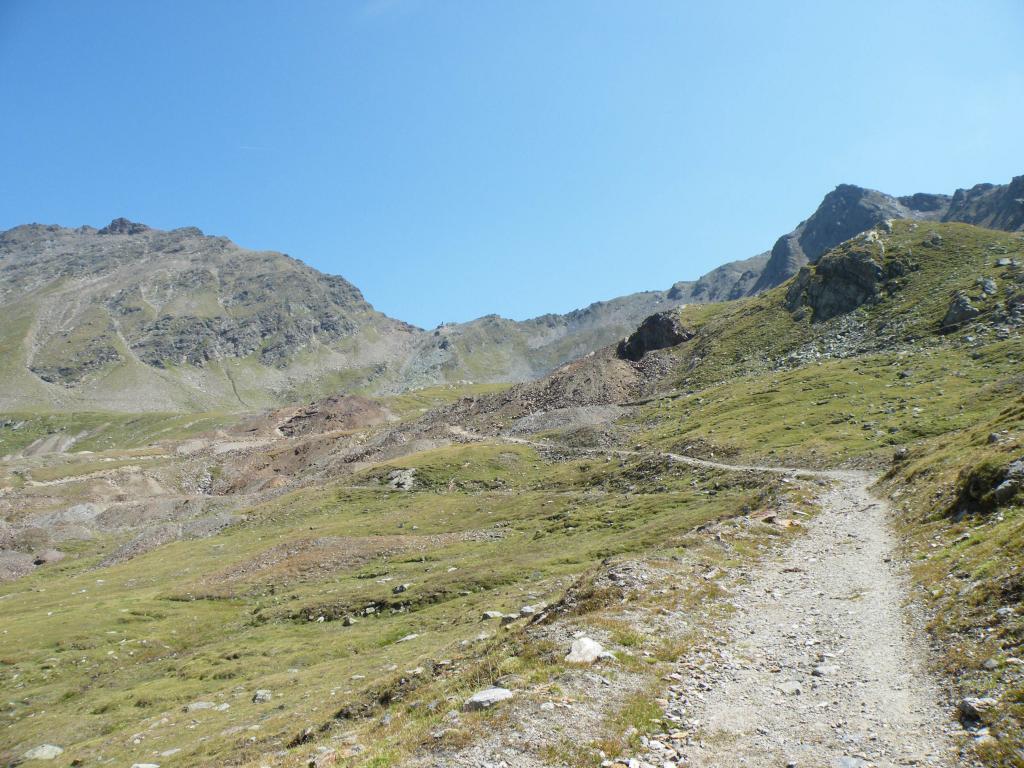 Dal Dresdner Hutte (2308m) si rimonta verso ovest il salto che porta al Gamsgarten (ca. 2600m) fra rocce montonate e detrito morenico. Da qui seguendo la strada sterrata di servizio delle piste si aggira la stazione della funivia (Murmele) fino ad entrare in una valletta oltre un piccolo laghetto. Si arriva quindi alla stazione di partenza della seggiovia per il Daunjoch (2635m). Si seguono ora i segnavia bianco rossi che rimontano su terreno morenico fino all’incirca al quinto pilone della funivia. Da qui il sentiero si impenna e risale faticosamente fino alla stazione a monte dell’impianto (ca. 2995m).