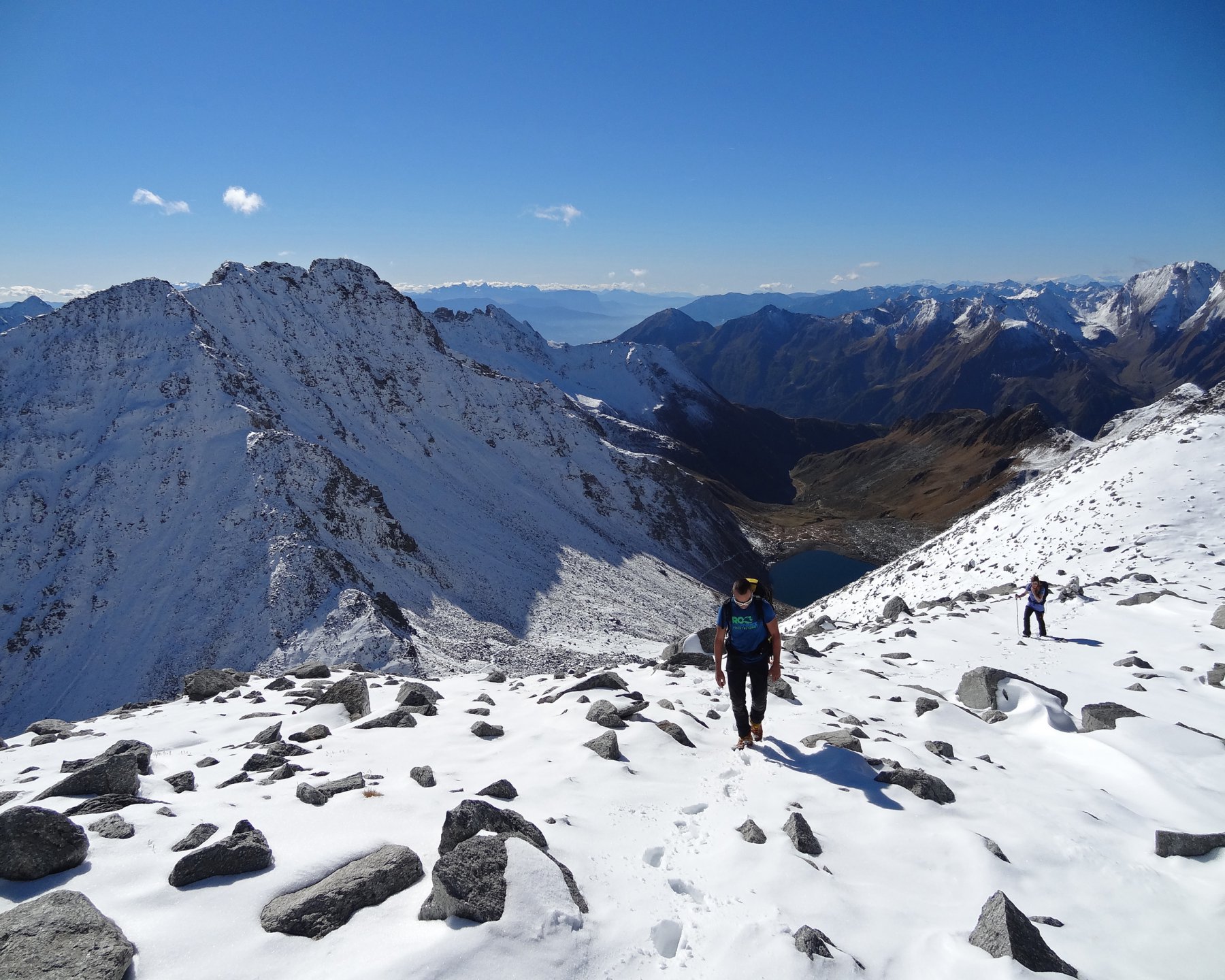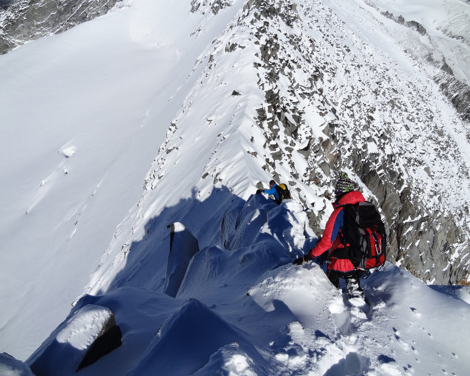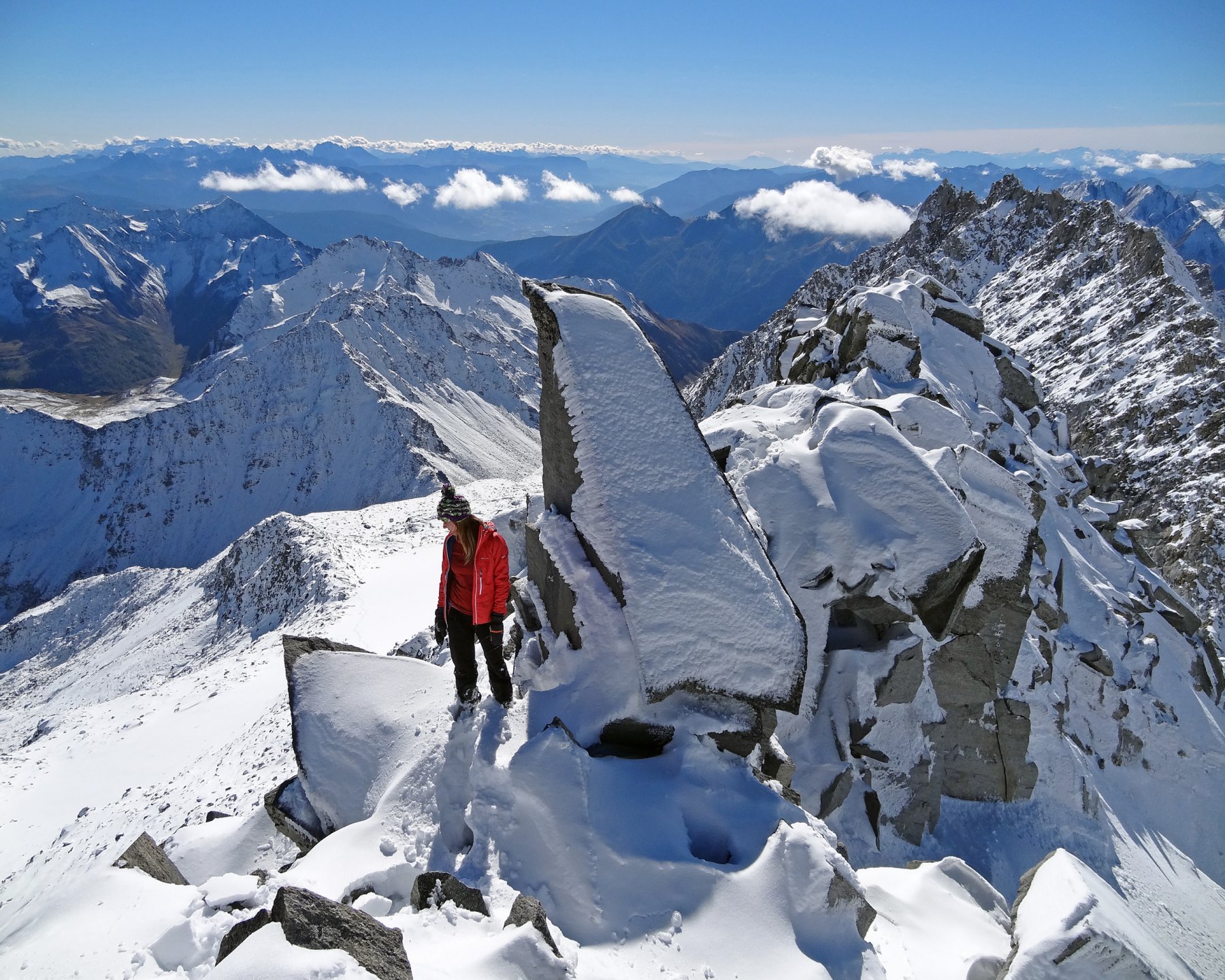 Da qui continuare sulla cresta SW pianeggiante con facile arrampicata fino all’ultimo facile pendio che porta alla croce di vetta.
