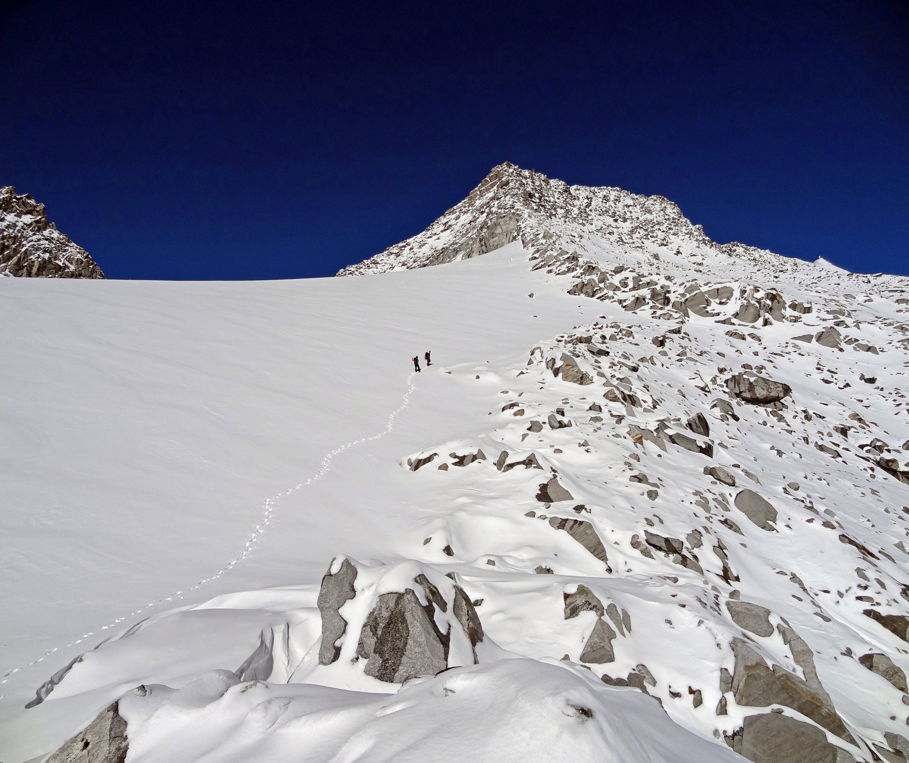 2 – Evitare la vedretta per salire la spalla rocciosa est e per poi ricongiungersi con l’itinerario precedente.