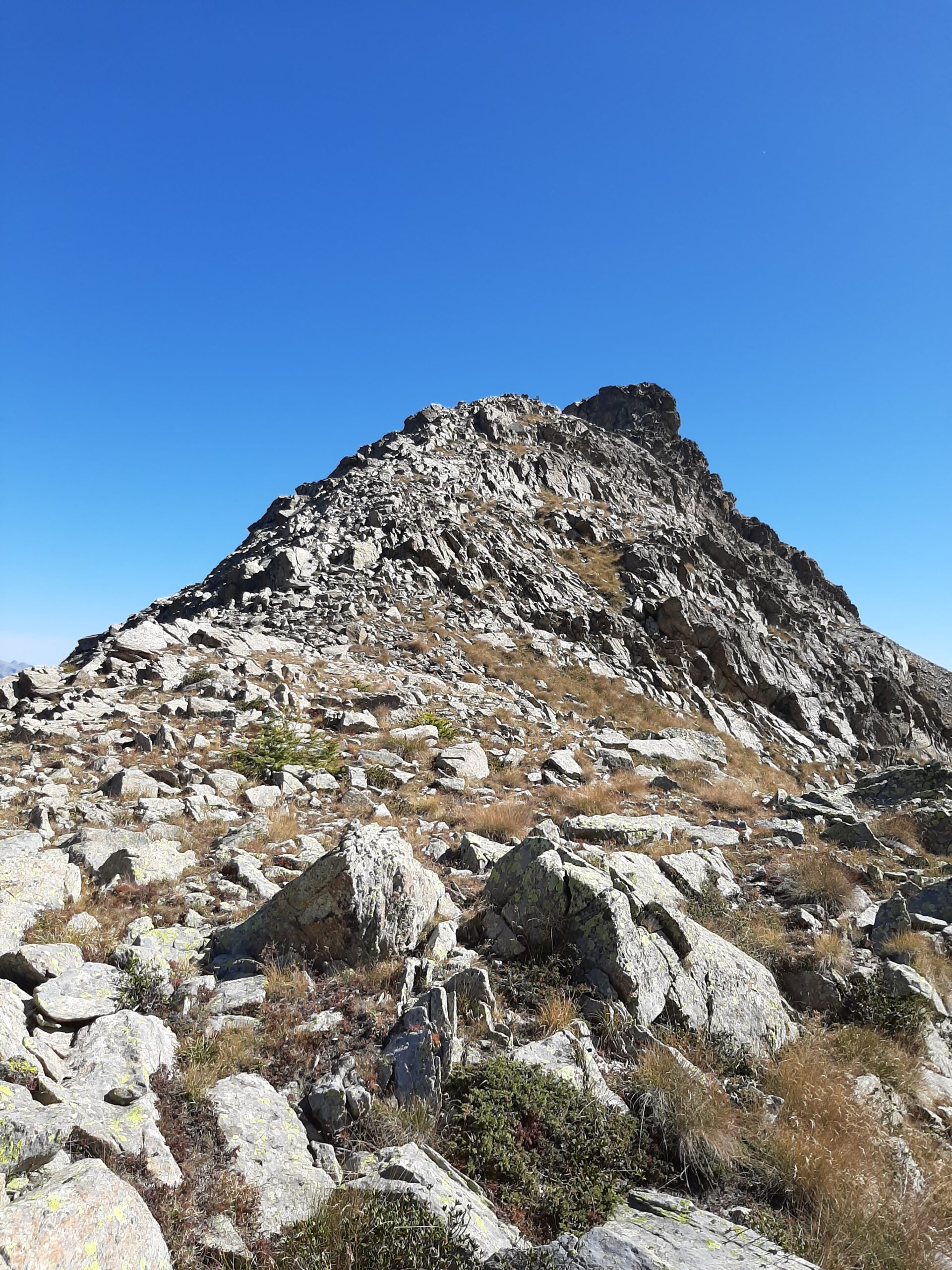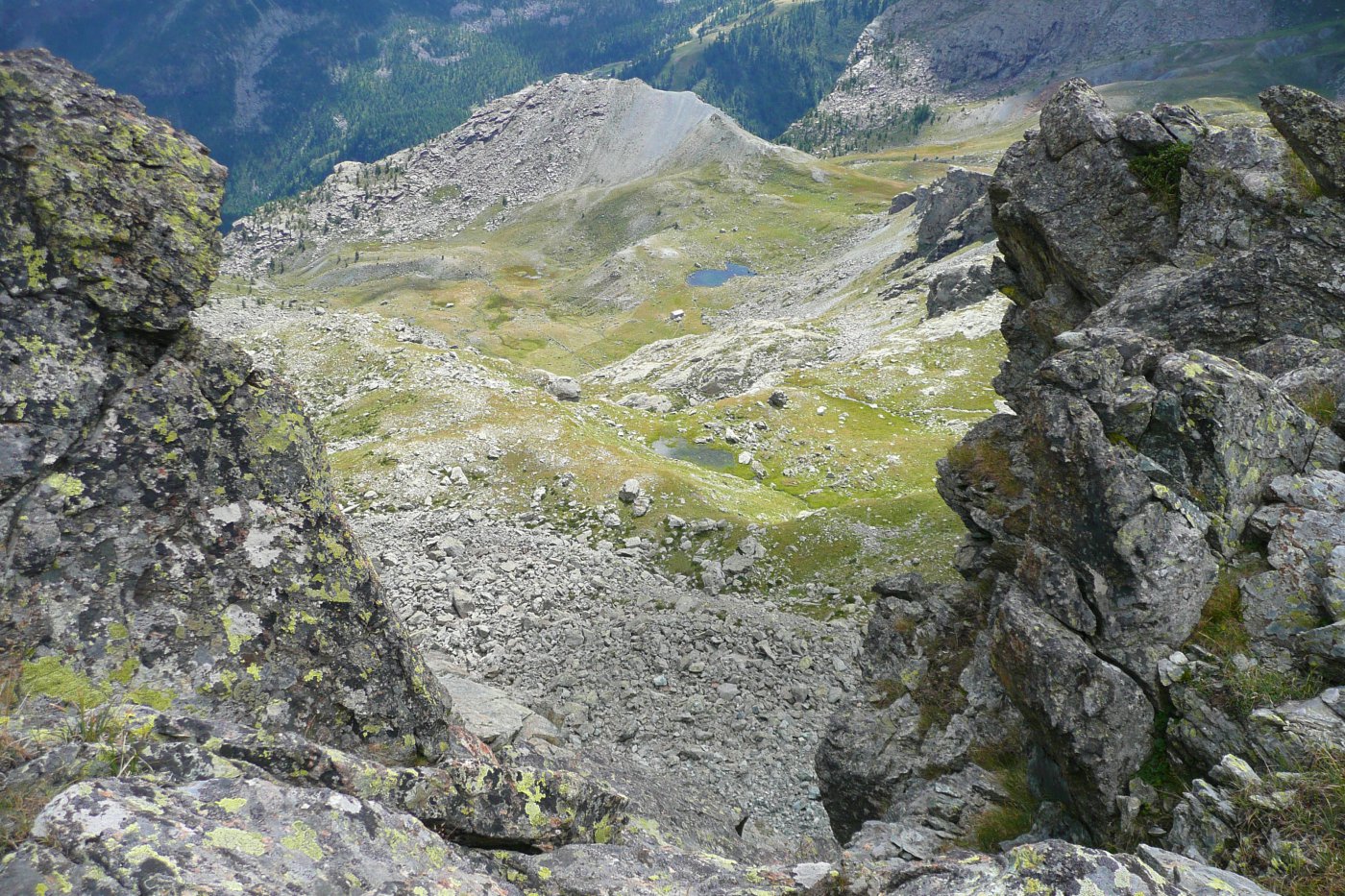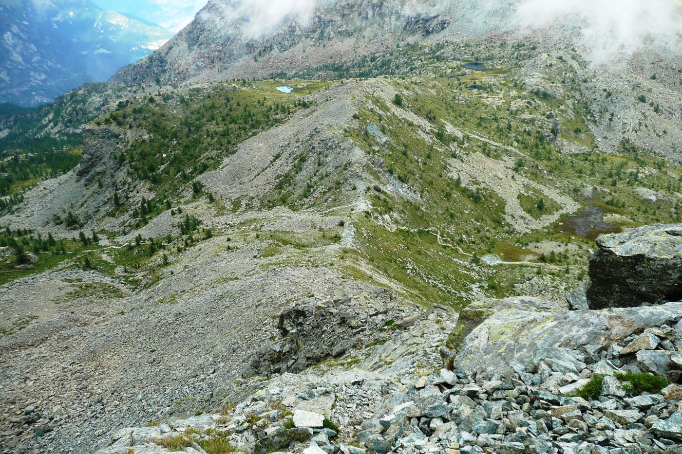 Dalla cima (2539 m) ritornare sui propri passi per 3-4 metri, poi scendere per roccette ed erba il pendio sud e spostarsi progressivamente verso Ovest puntando verso le Tete des Hommes, arrivati al colletto salire il facile dosso di blocchi rocciosi e la successiva cresta fino alla 2a cima, di qui si scende la cresta Ovest che è facile da percorrere quasi interamente, ad eccezione di un passaggio alla fine della cresta, da effettuare in discesa sul versante Nord; si tratta di circa 5 metri con buoni appigli, ma da percorrere con attenzione perchè esposti! Si raggiunge quindi un colletto a quota 2520 m e poi non resta che scendere senza alcun sentiero, fino ad incrociare il sentiero 9C che ci riporta all’auto.