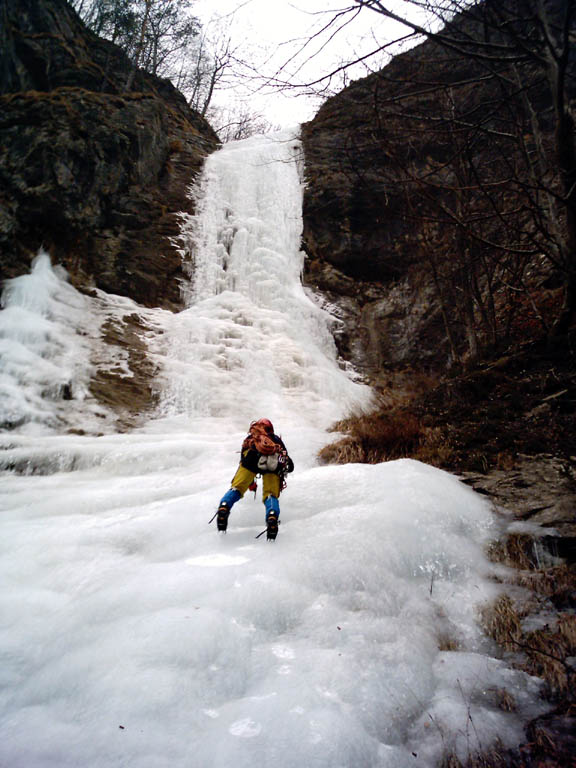 L1-Partendo direttamente dal greto del torrente si risale alla base del salto stalattitico 60 m 60°/75°/80°.