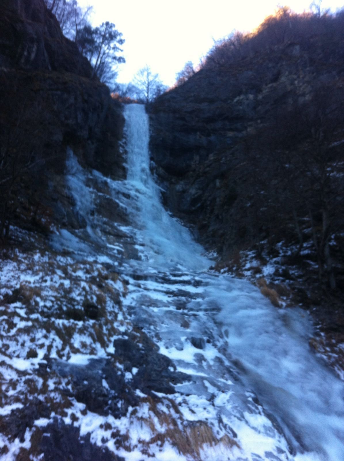 1- Verificare se il rio che passa sotto il ponte della strada di accesso c.a. 500m prima dei Tesori di Elva sia ghiacciato (30 m 75/80°-6m 90°) in tal caso sarà possibili usire dalla gola e concludere con questa breve salita la giornata .