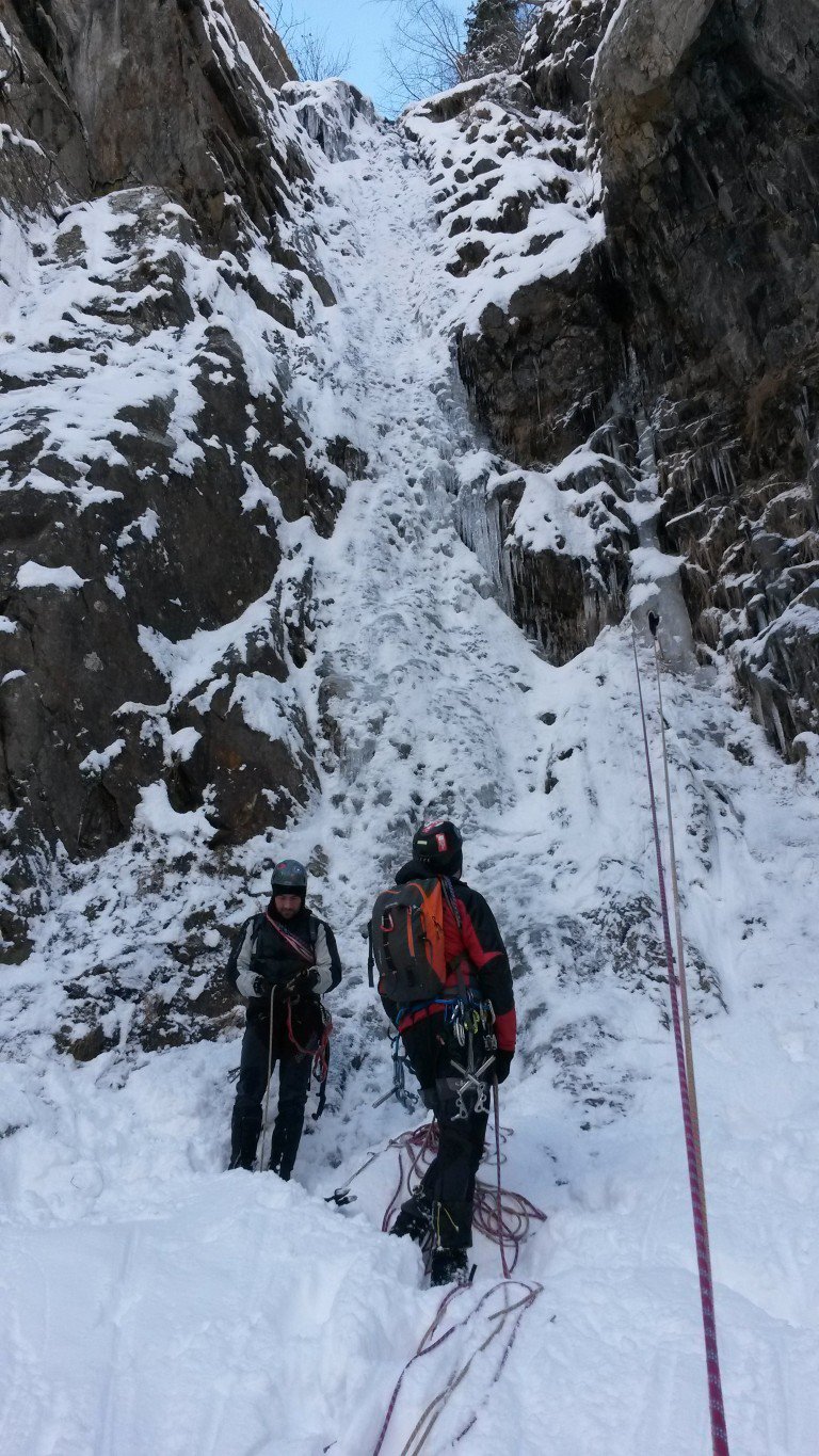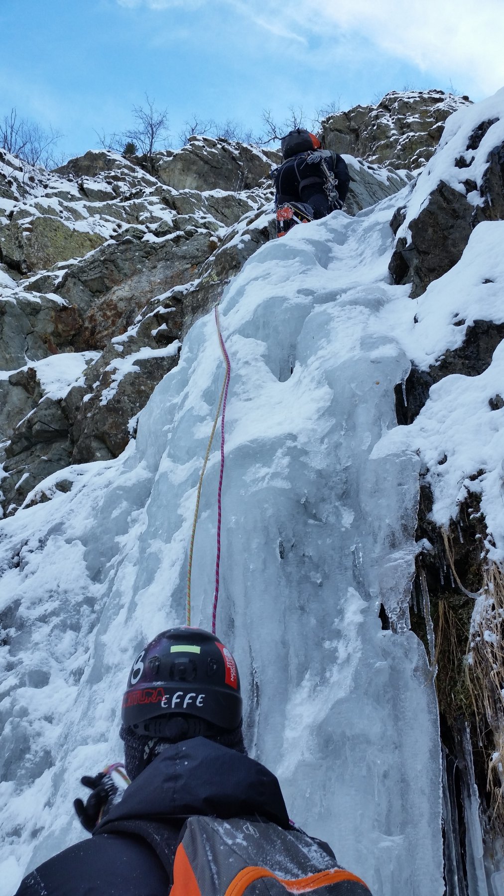 Si prosegue per altri 170 m, superando salti con ghiaccio fine e passaggi di misto e giungendo alla biforcazione del colatoio, dove la salita si fa meno interessante.