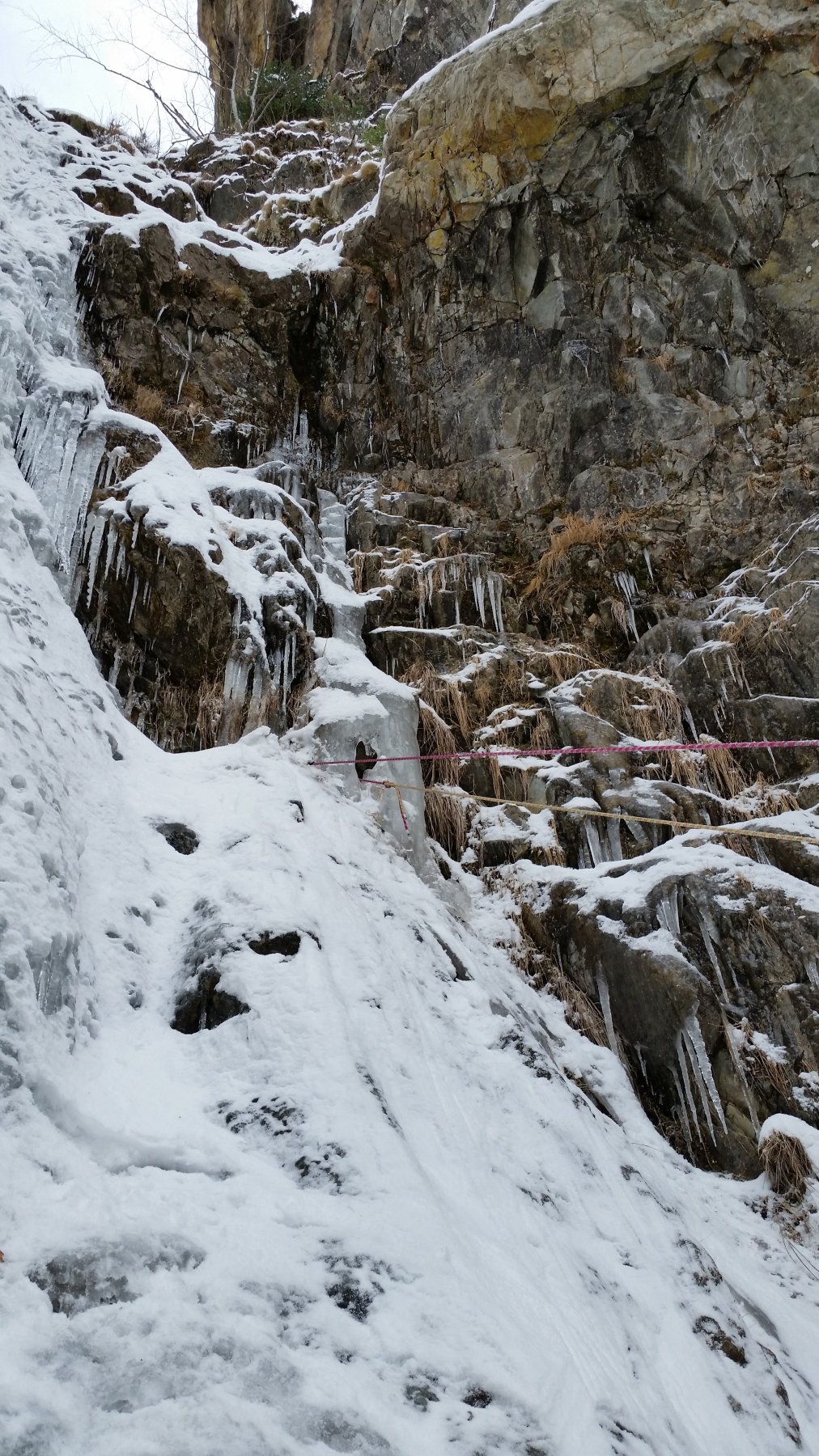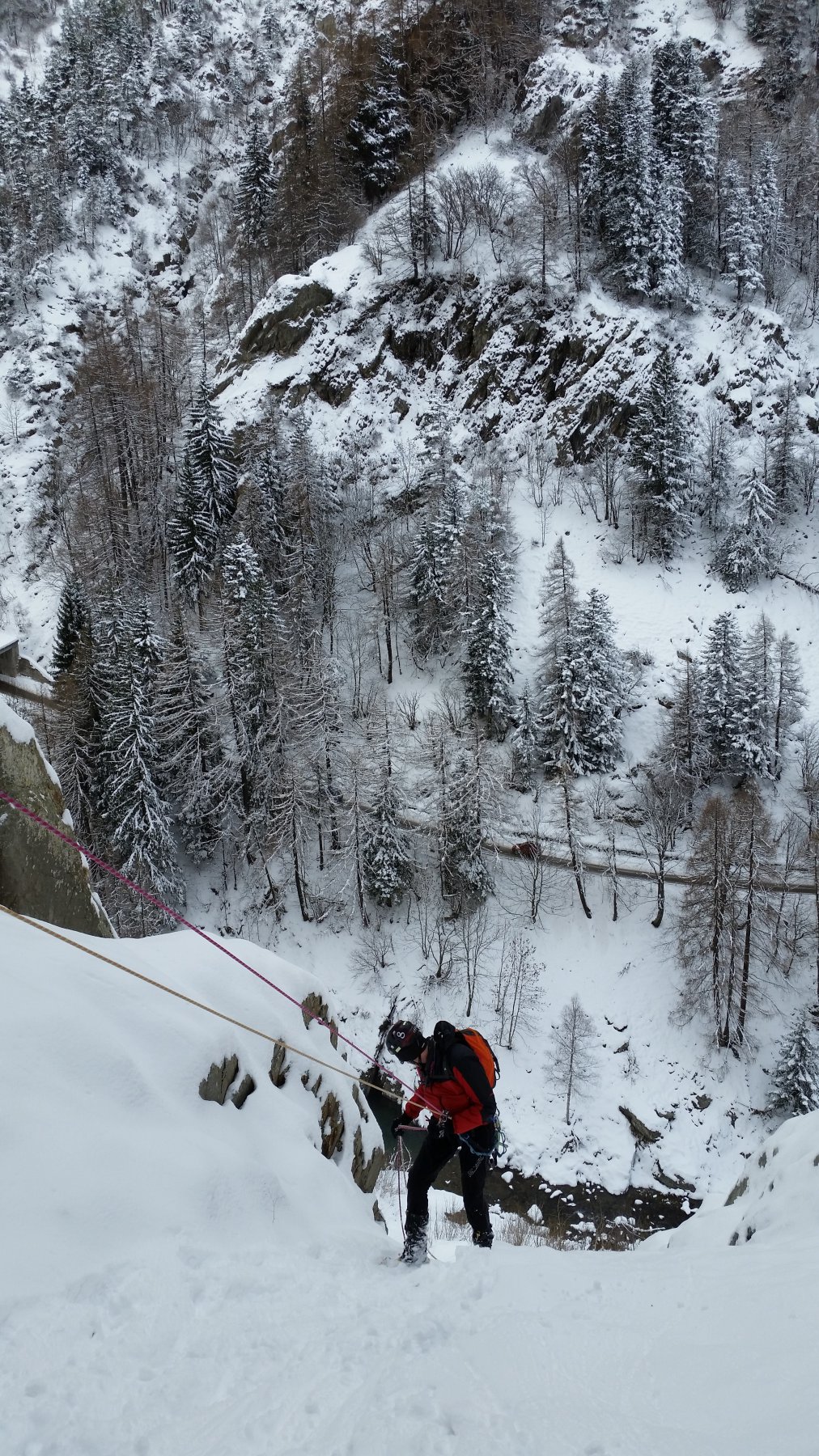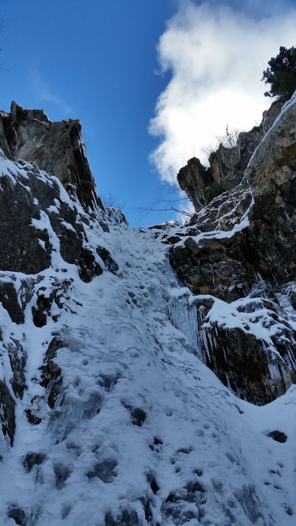 Si segue un traccia e poi un breve canale che il 15 minuti porta alla base della cascata che è posta in corrispondenza del terzo paravalanghe ed è' caratterizzata dai primi due salti stretti e verticali.