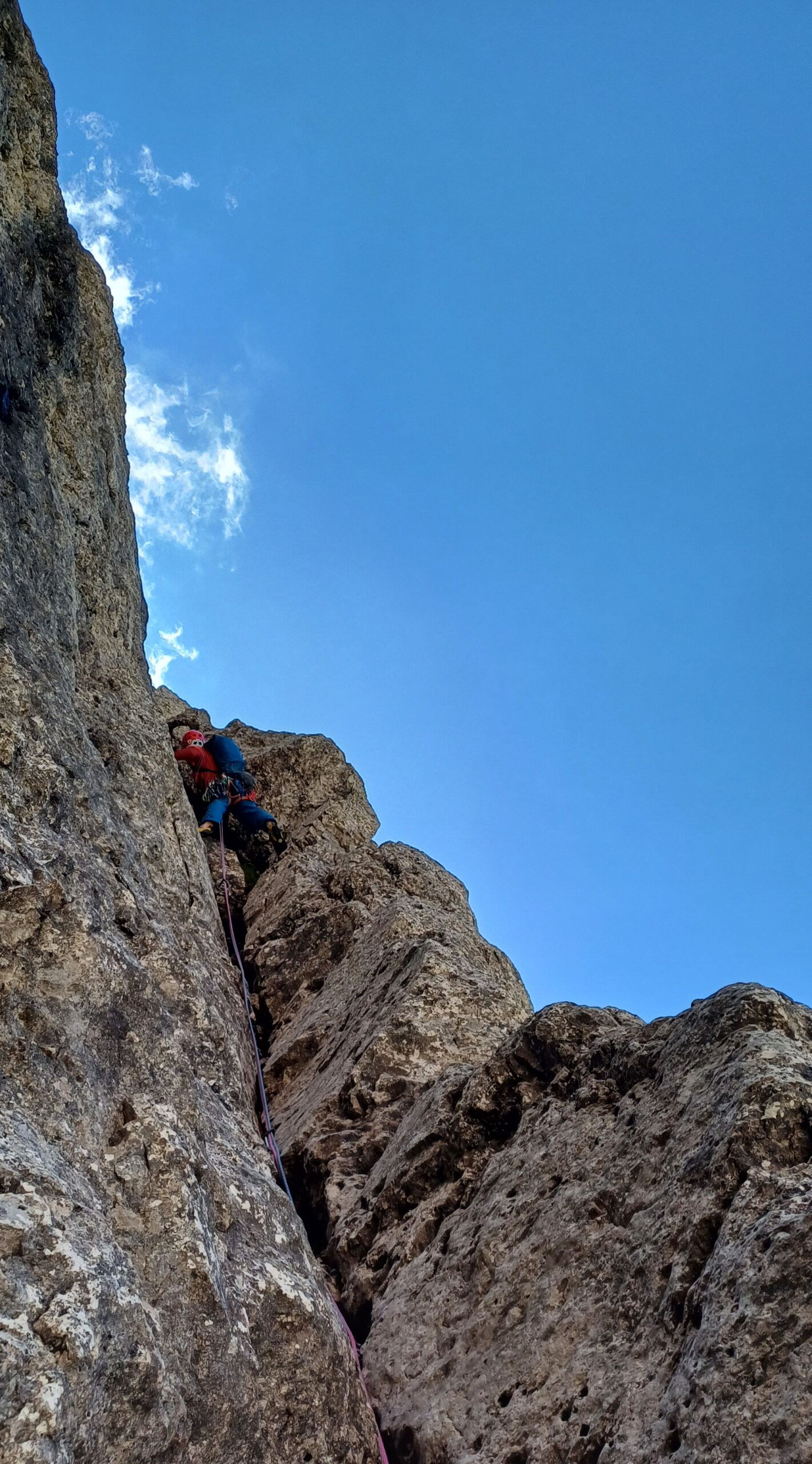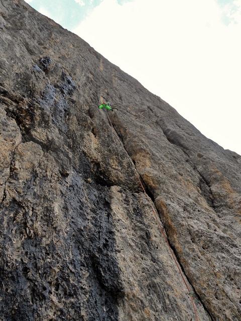 - L1= 40m; Salire in verticale per la fessura diedro leggermente aggettante (possibilità di prese umide) per 7-8m poi spostarsi leggermente a sx seguendo l’evidente diedro, salirlo fino ad un piccolo terrazzino con uno spuntone e piegare decisamente a dx per alcuni metri fino ad una sosta. (2 chiodi in basso a destra). V+